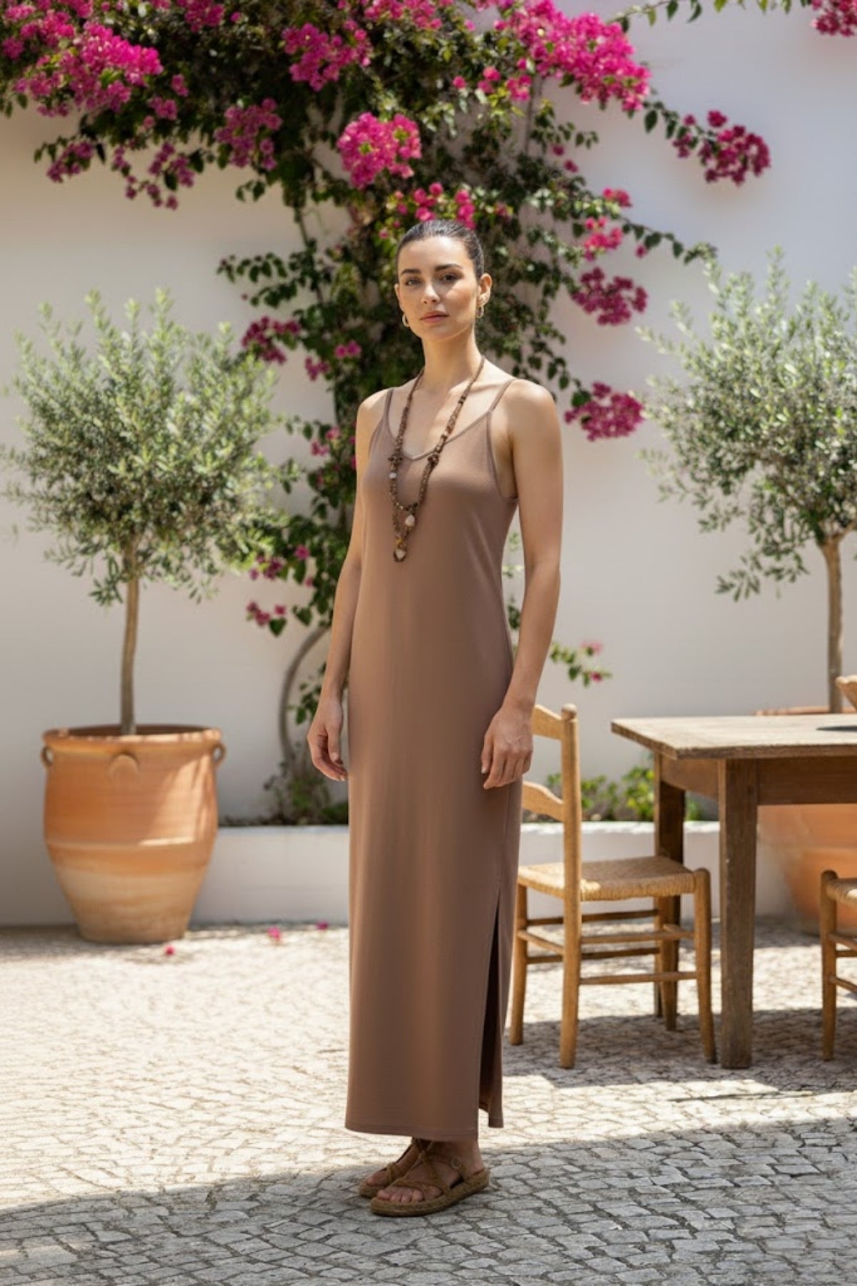 Askılı tasarımı yaz aylarında hafiflik sağlarken, yırtmaç detayı feminen bir dokunuş kazandırır.