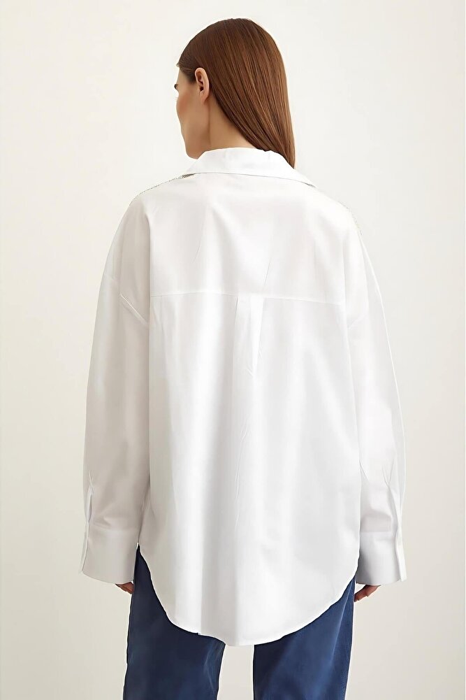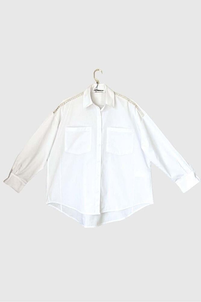 Kadın Omuz İşlemeli Beyaz Oversize Gömlek