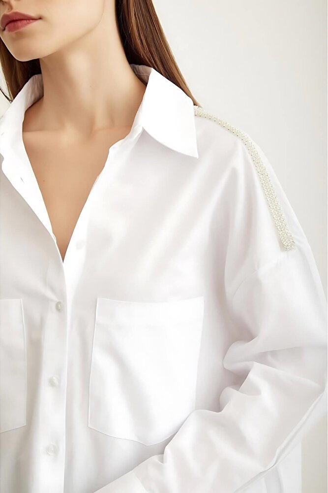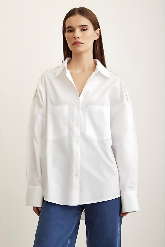 Kadın omuz işlemeli beyaz oversize gömlek, modern ve zarif bir stile sahiptir.