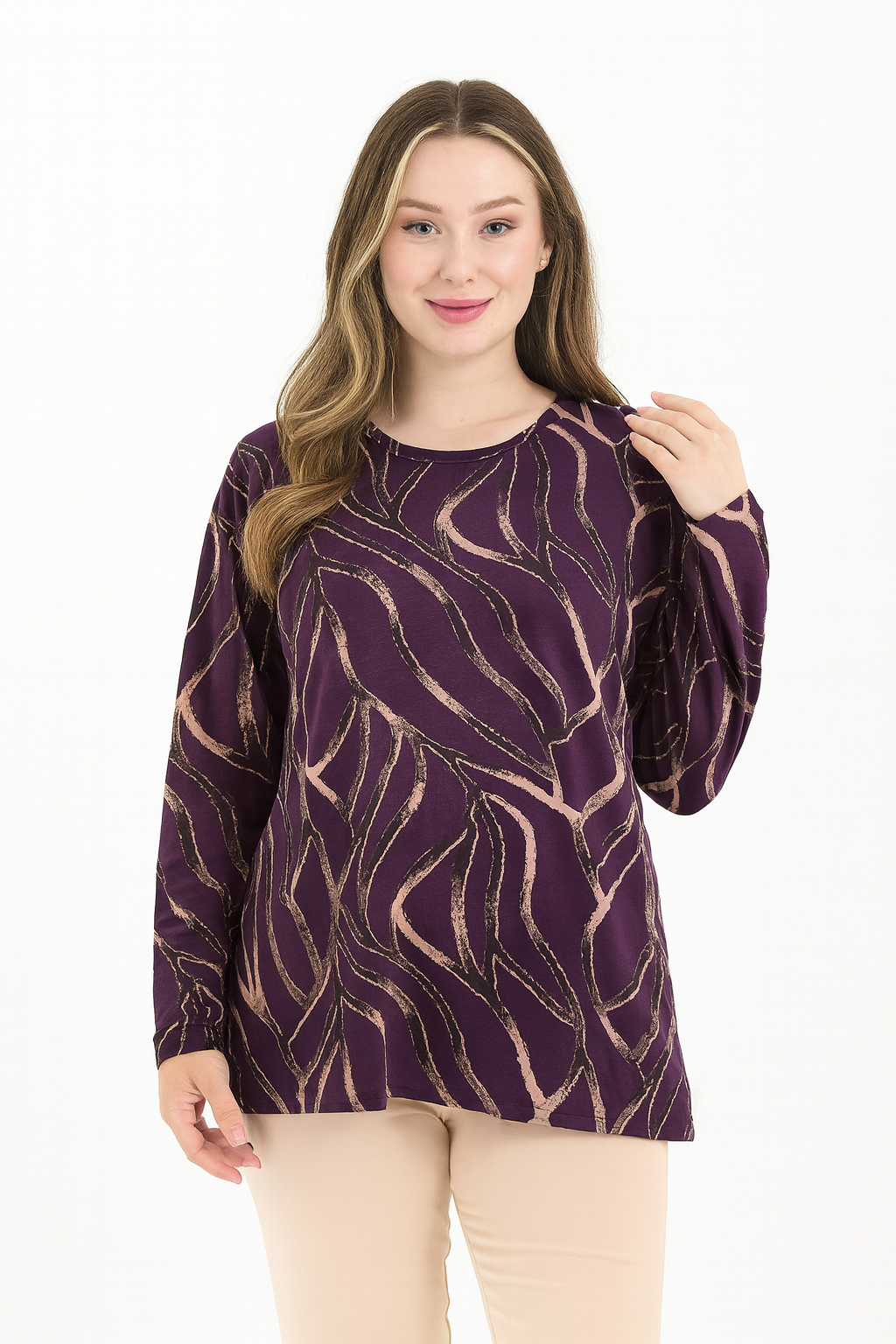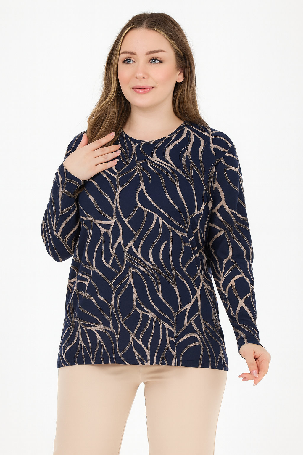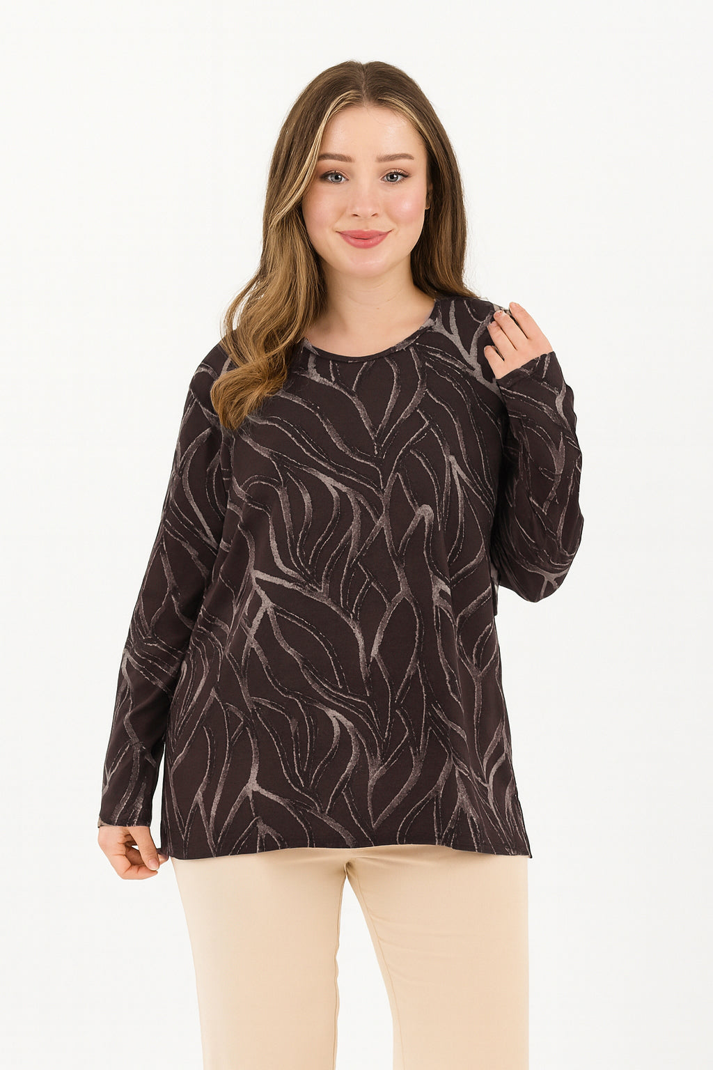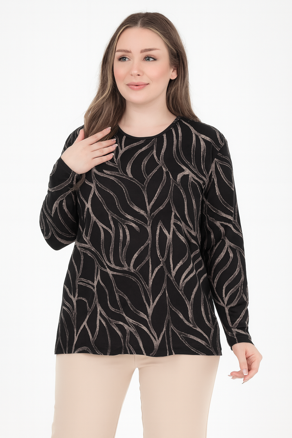 Kadın Orta Yaş Ve Üzeri Baskı Desenli Simli Likralı Yırtmaçlı Siyah Anne Penye Bluz