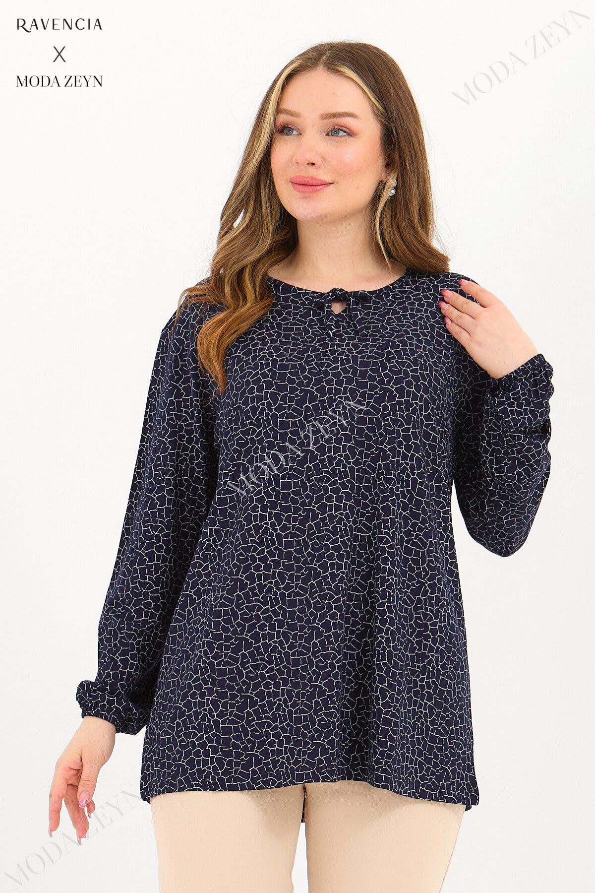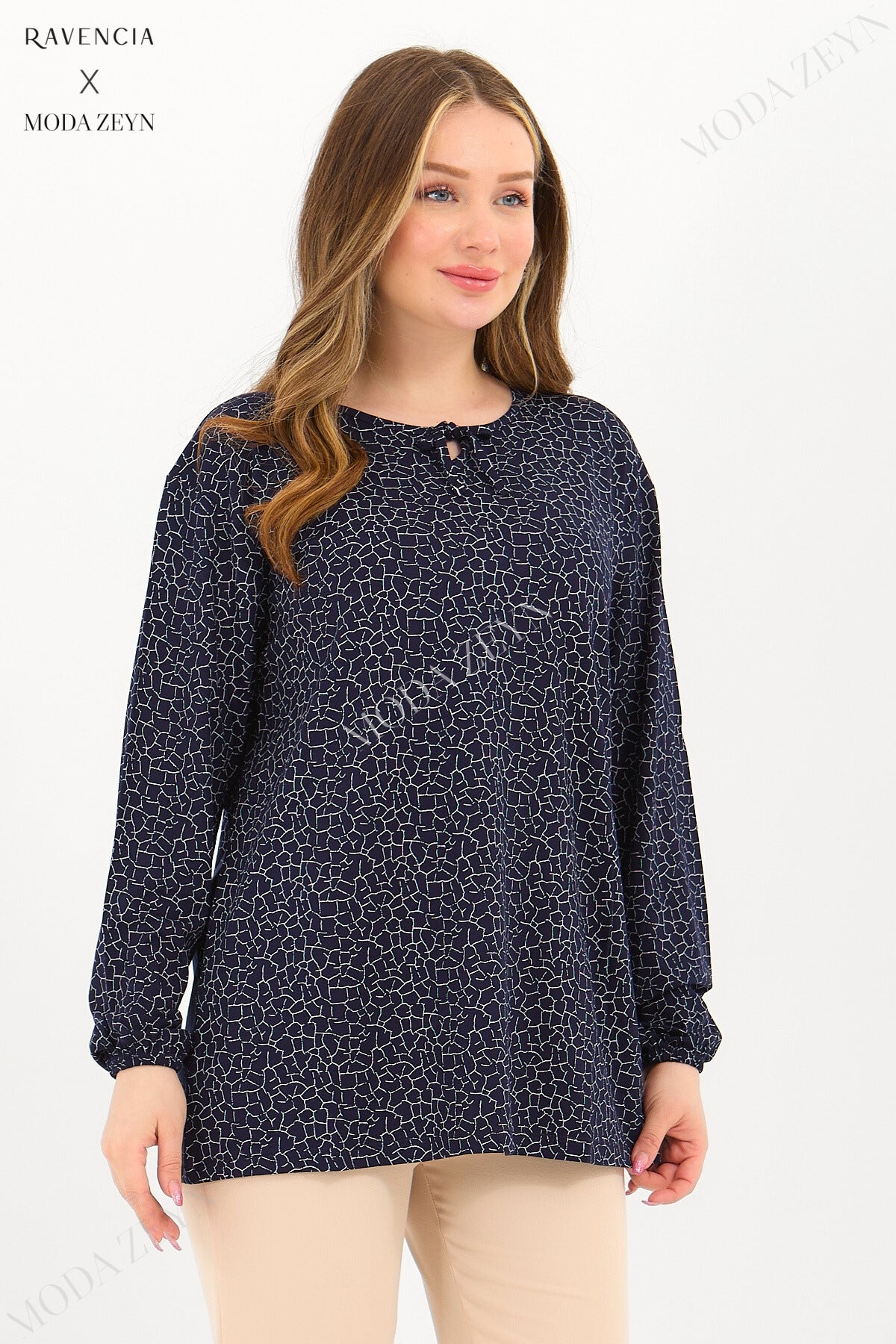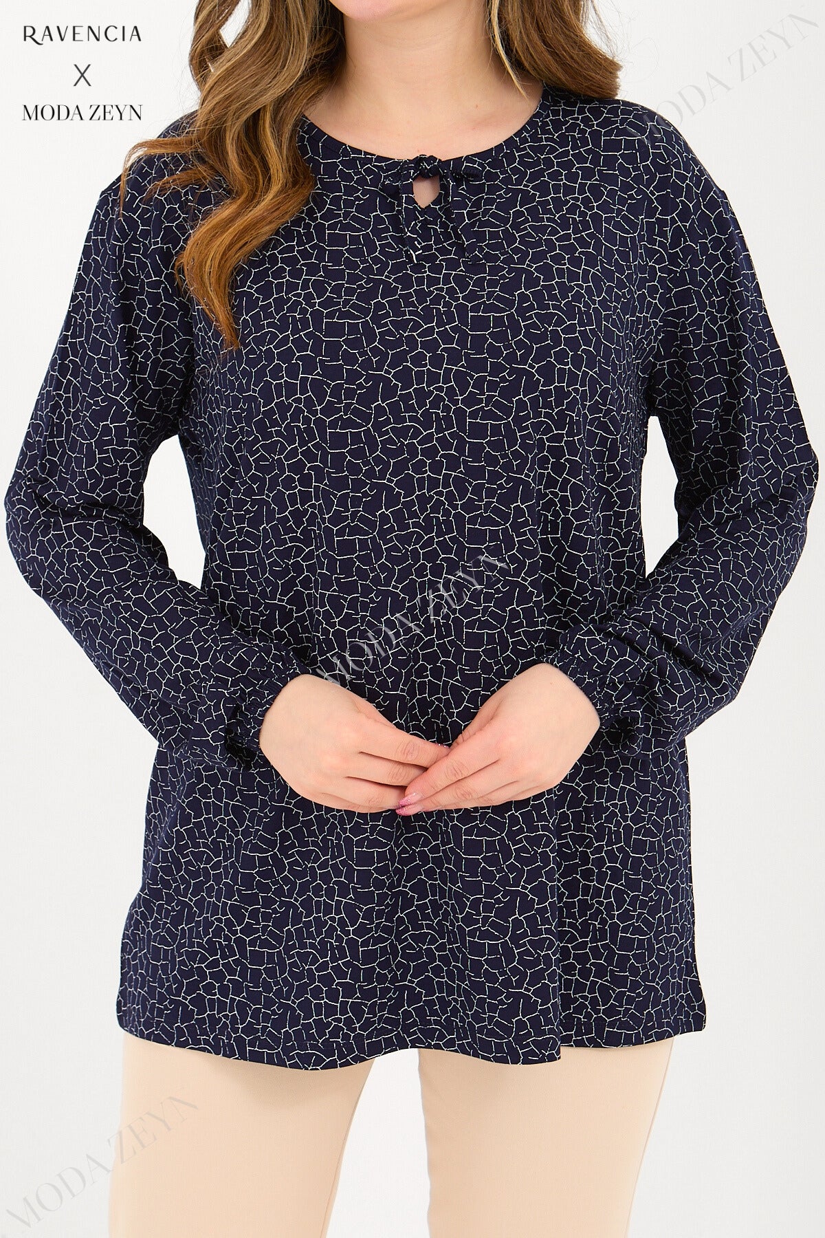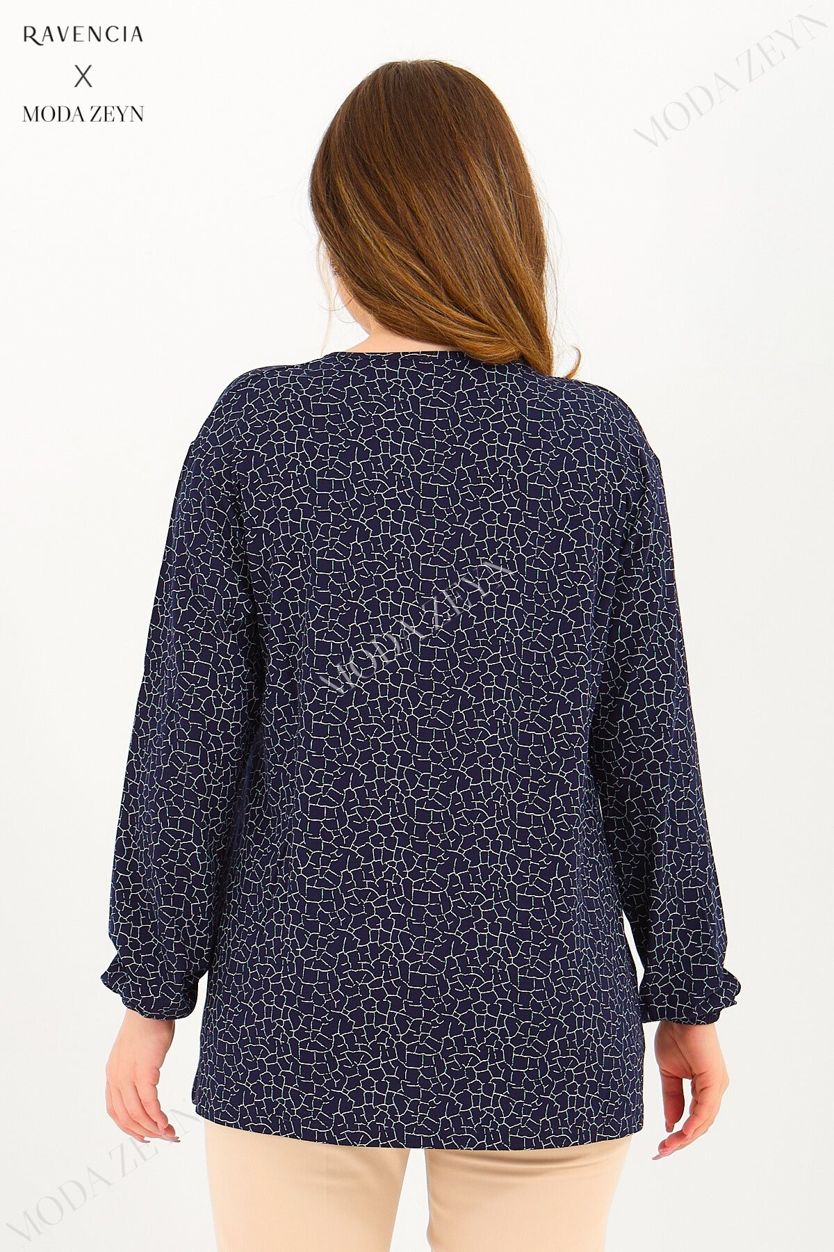 Kadın Orta Yaş Ve Üzeri Cam Kırığı Desen Likralı Mavi-Beyaz Anne Penye Bluz