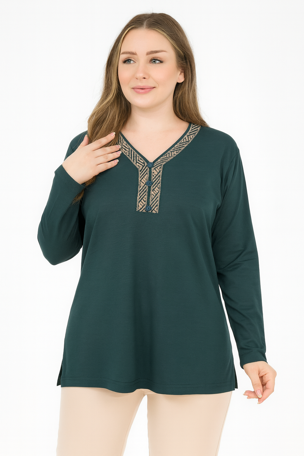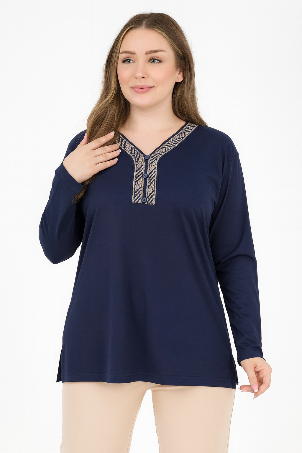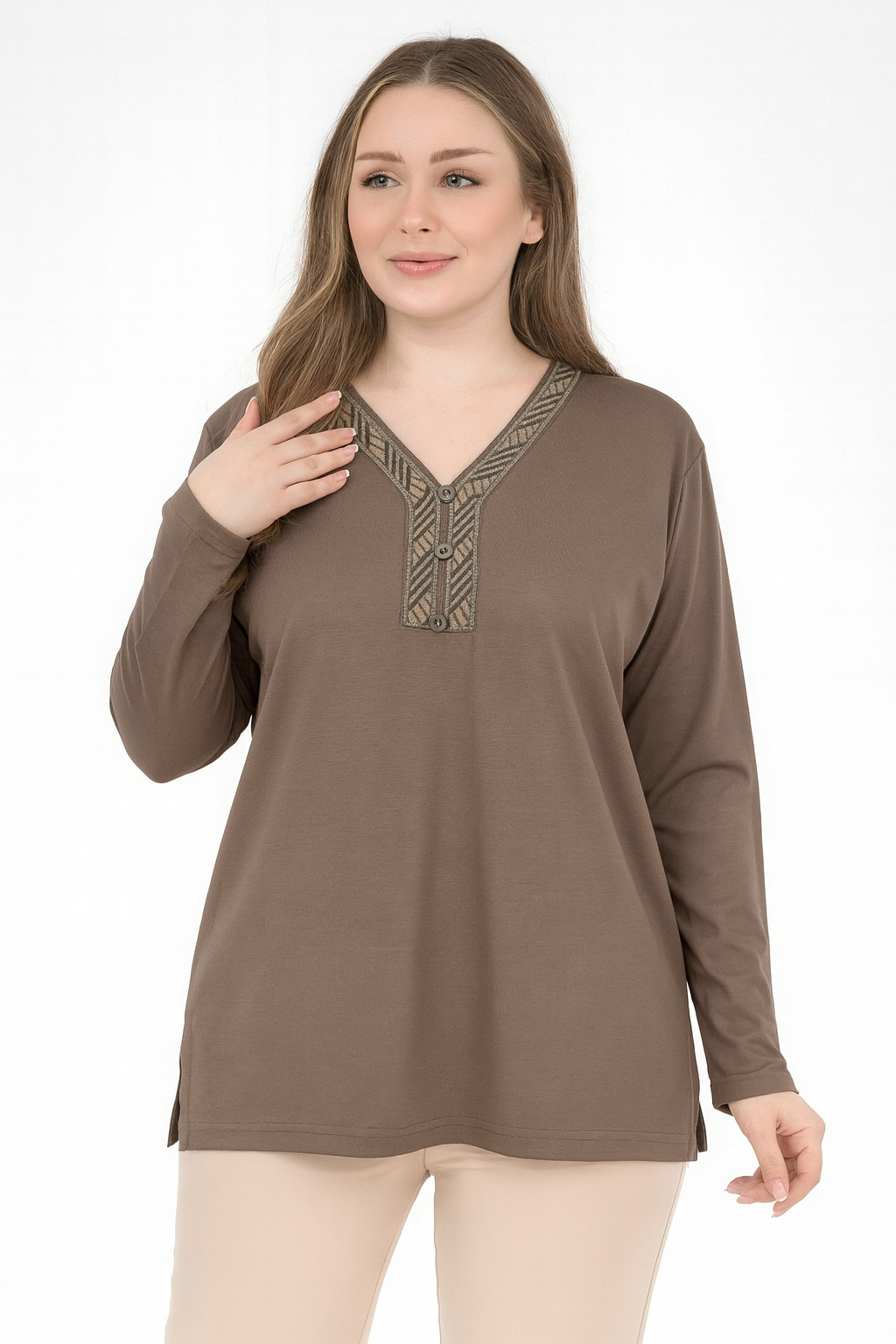 Kadın Orta Yaş Ve Üzeri V Yaka Desenli Yırtmaçlı Vizon Anne Penye Bluz