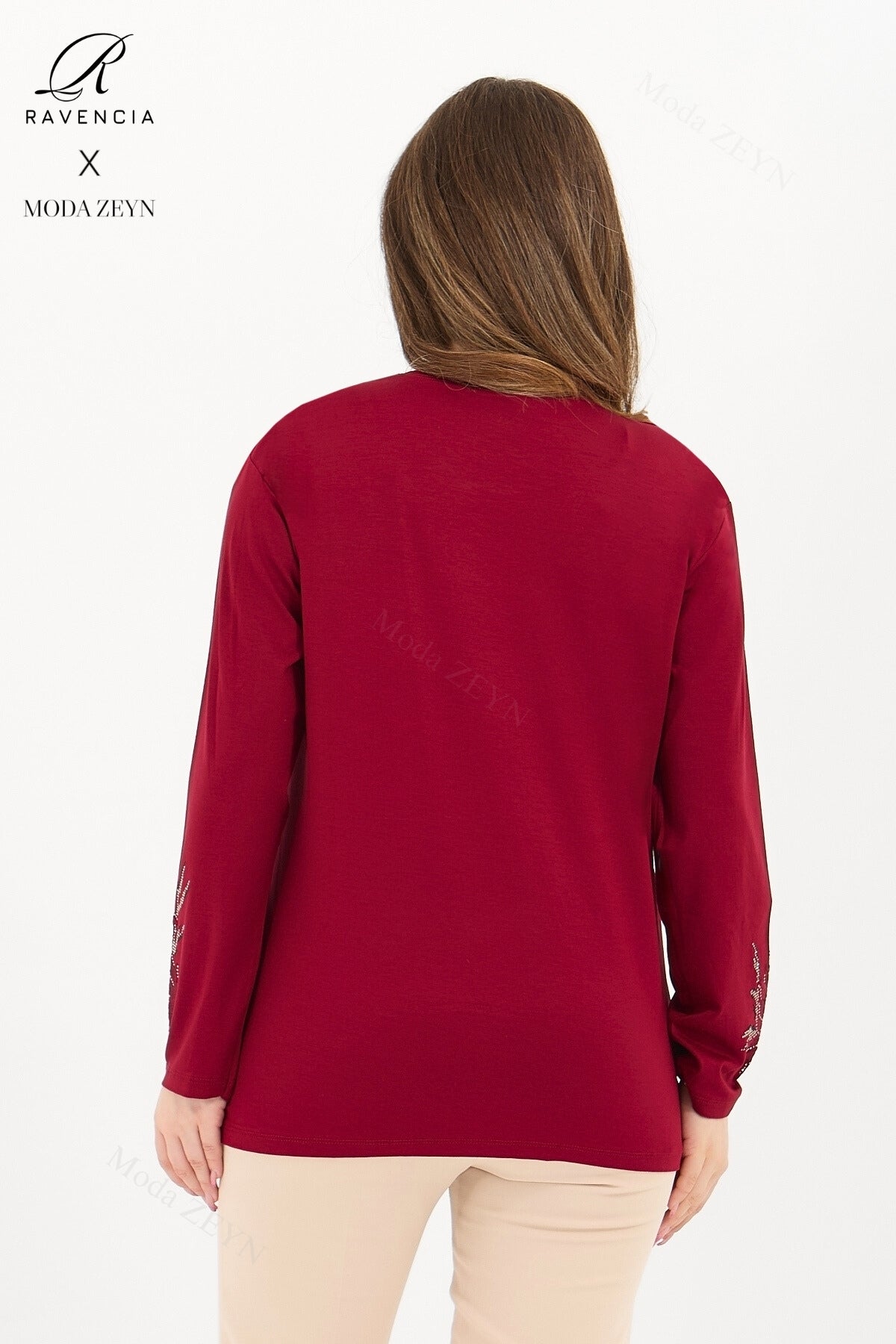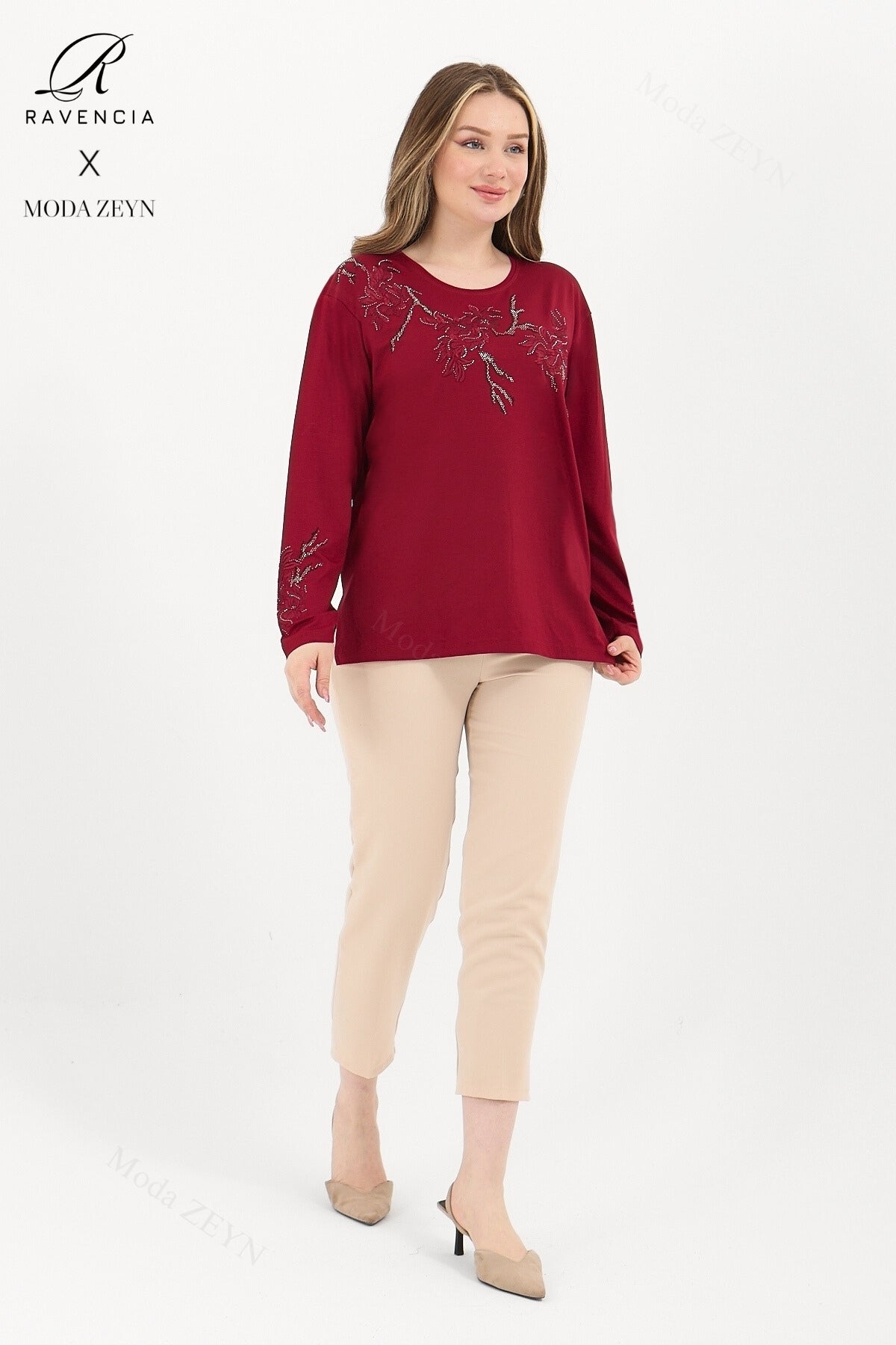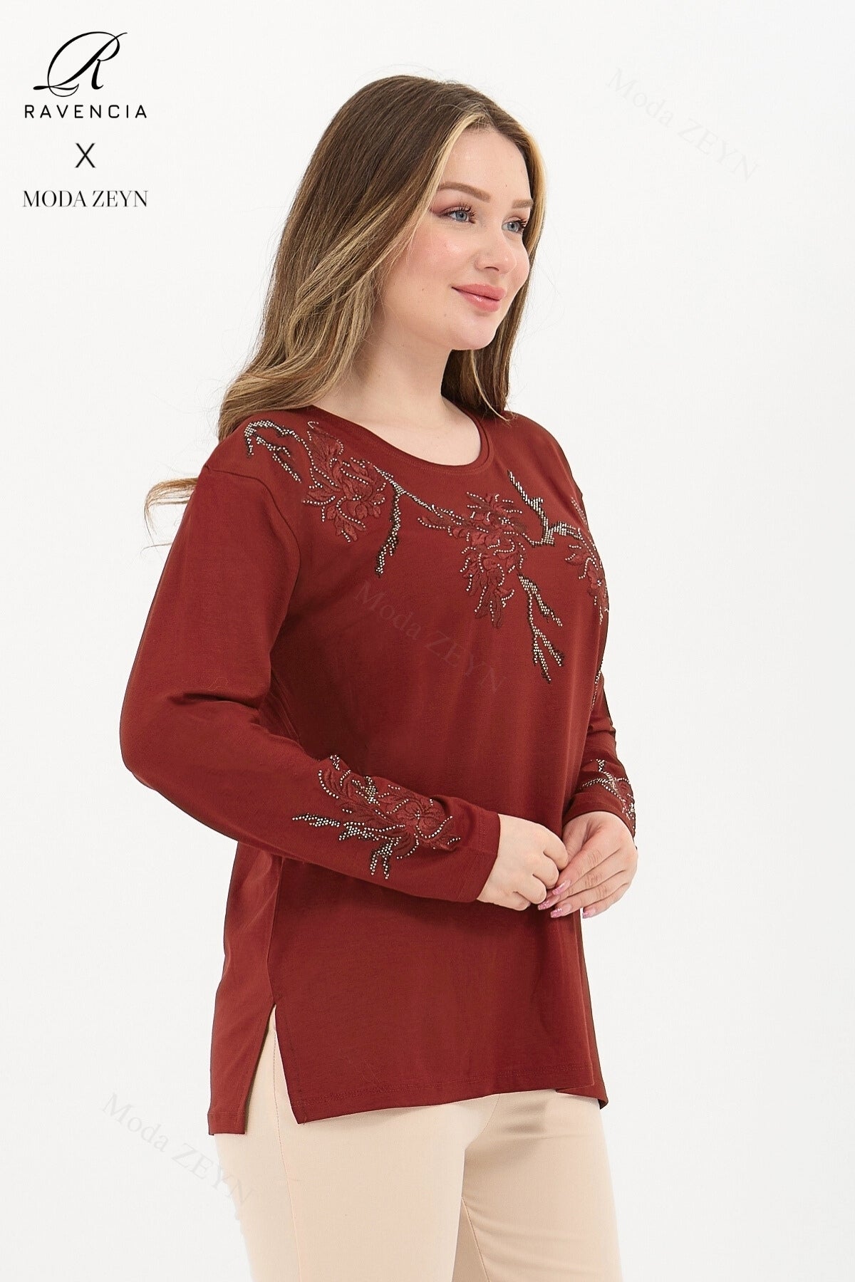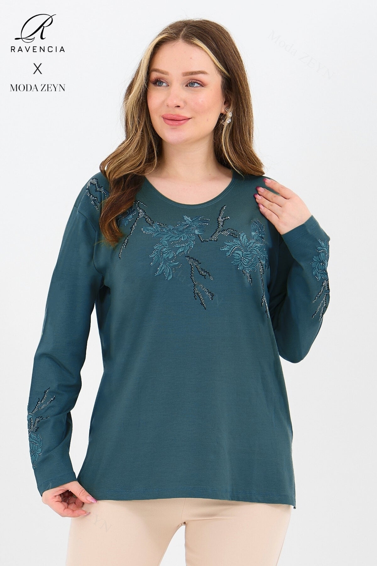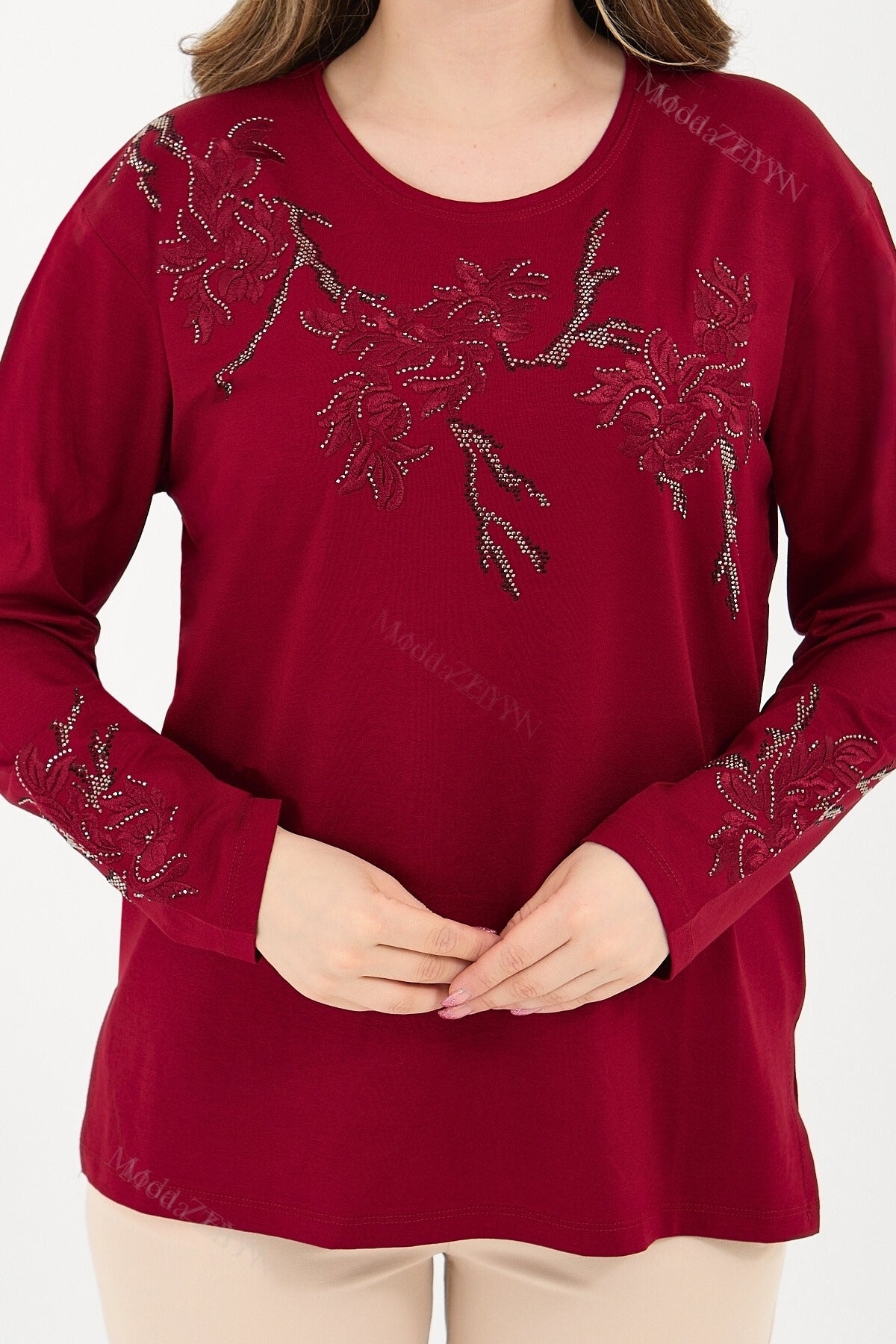 Kadın Orta Yaş Ve Üzeri Viskon Ağaç Desen Taşlı Işlemeli Likralı Anne Penye Bluz