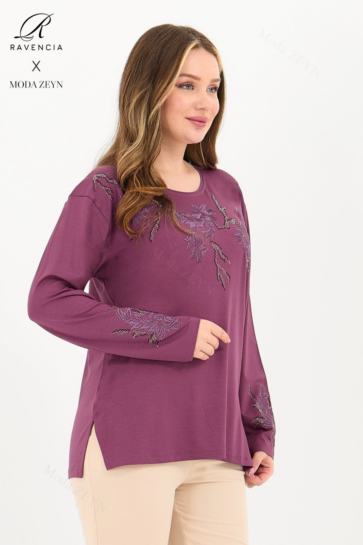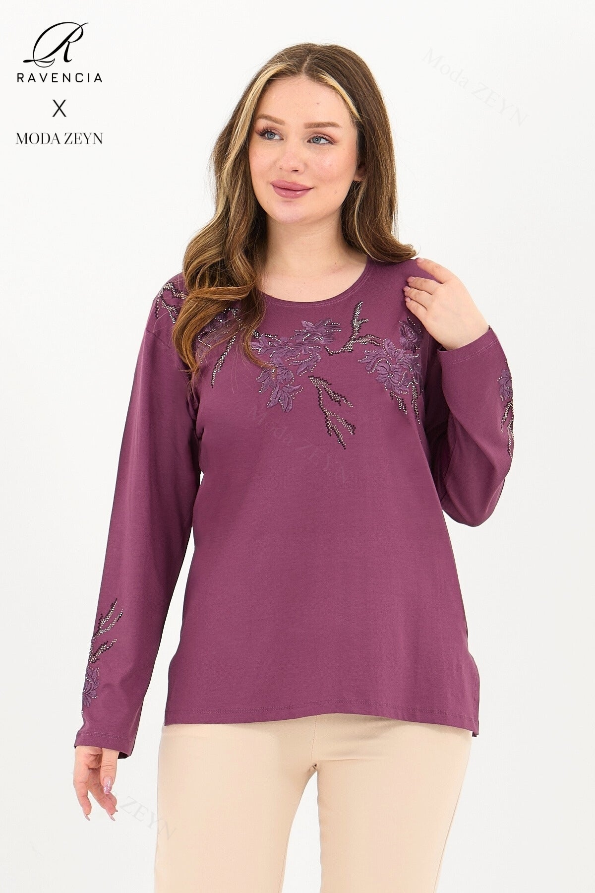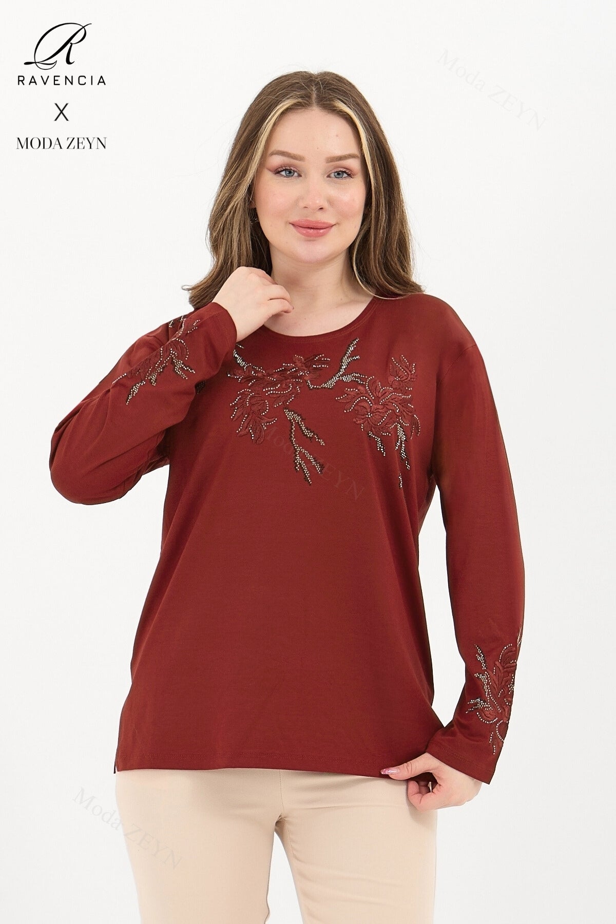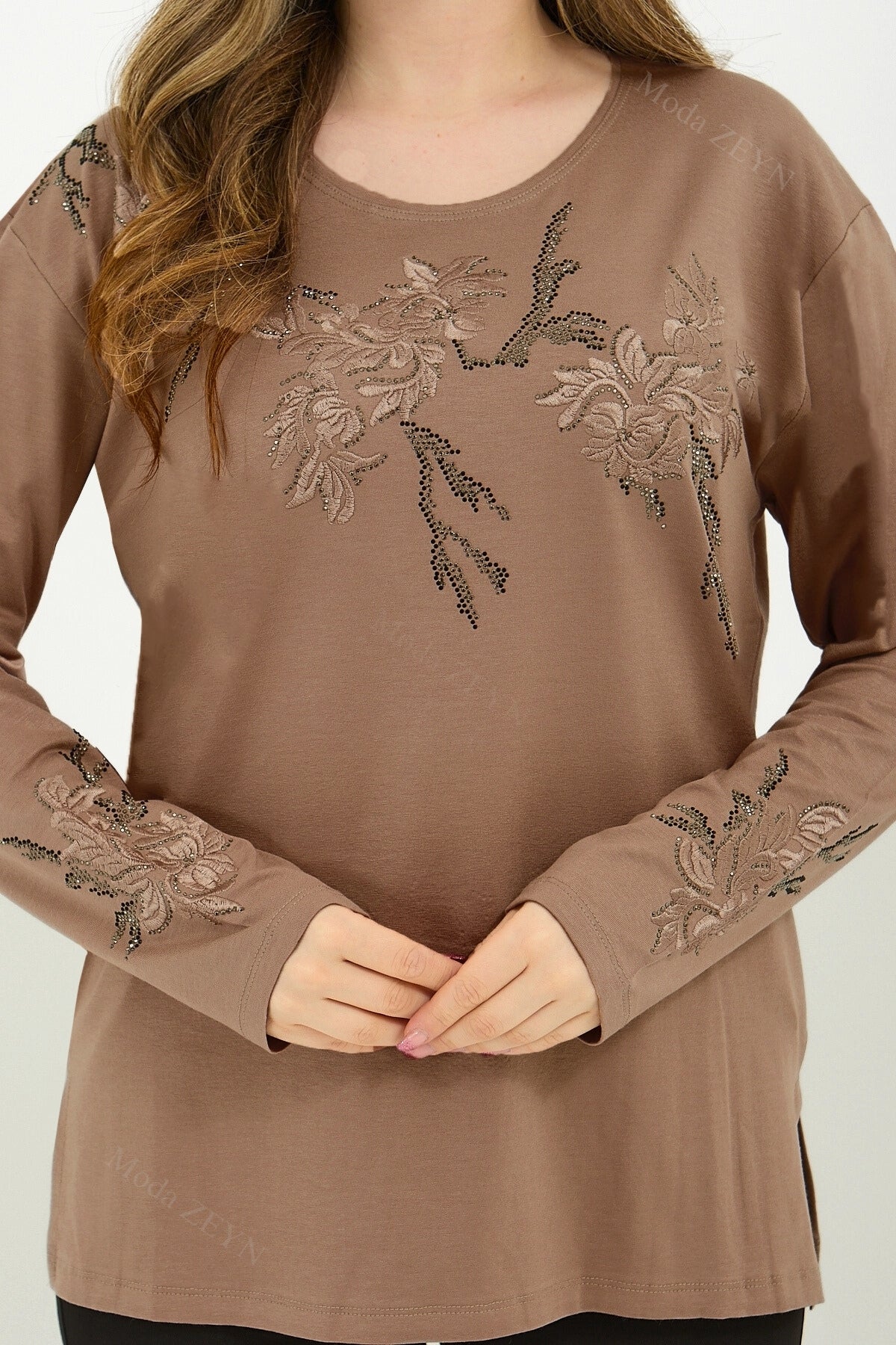 Kadın Orta Yaş Ve Üzeri Viskon Ağaç Desen Taşlı Işlemeli Likralı Anne Penye Bluz
