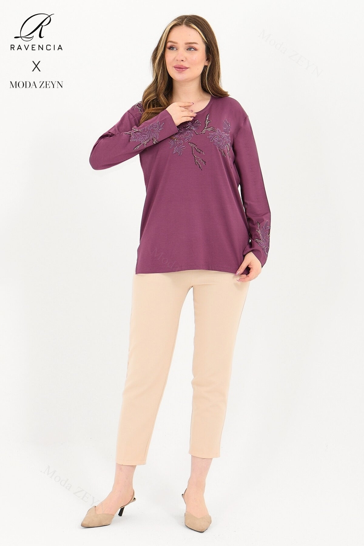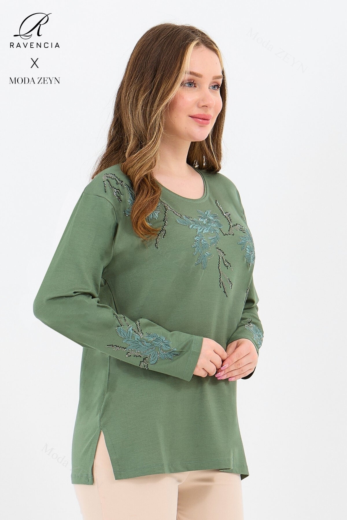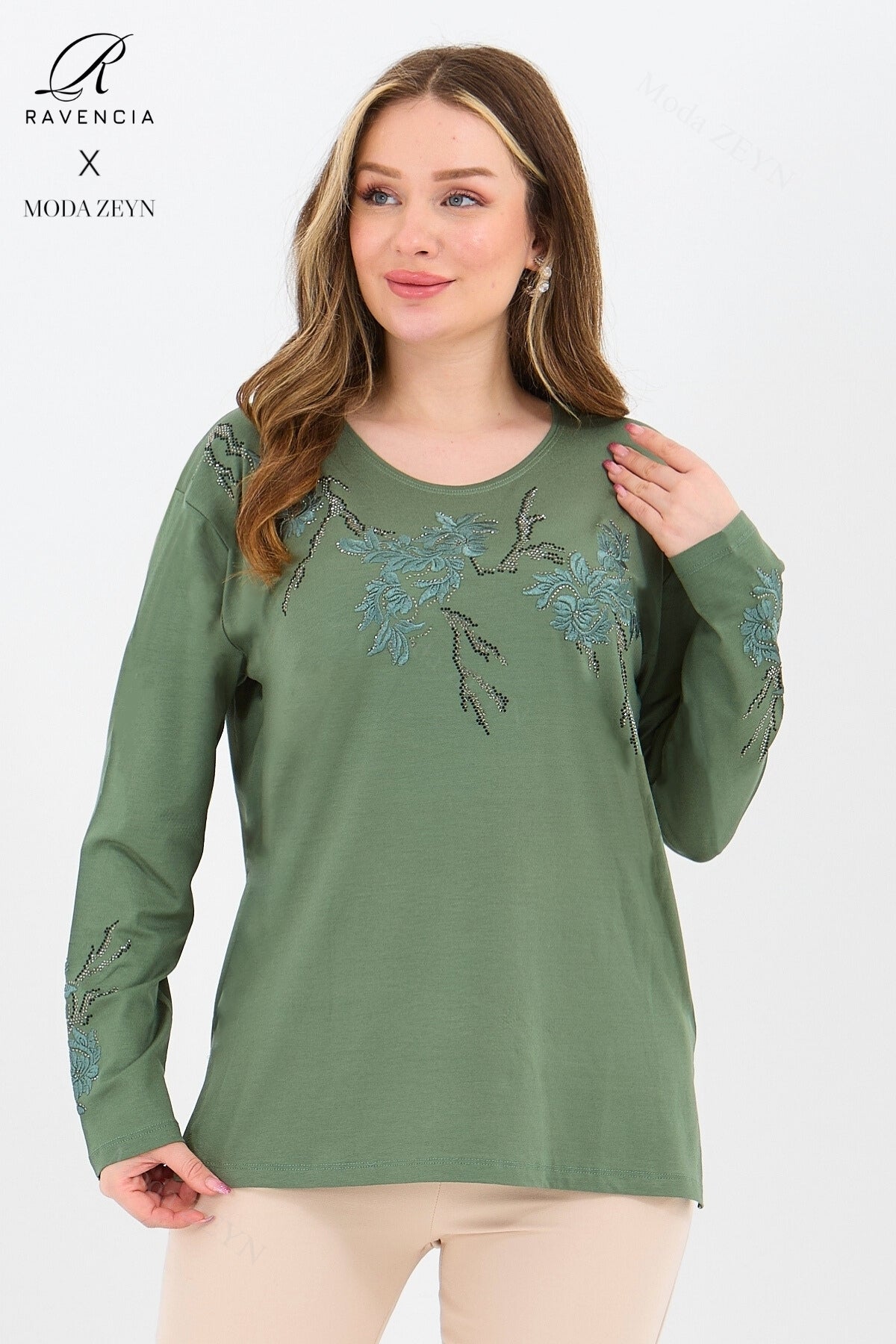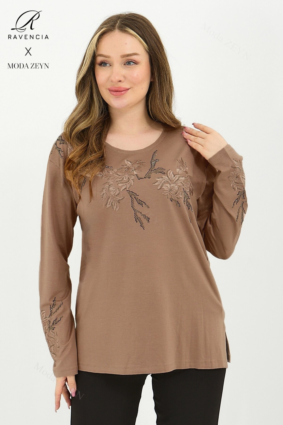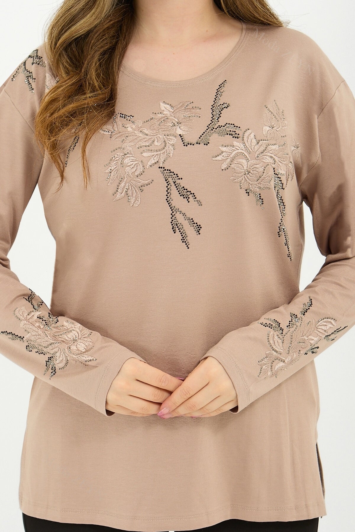 Kadın Orta Yaş Ve Üzeri Viskon Ağaç Desen Taşlı Işlemeli Likralı Anne Penye Bluz