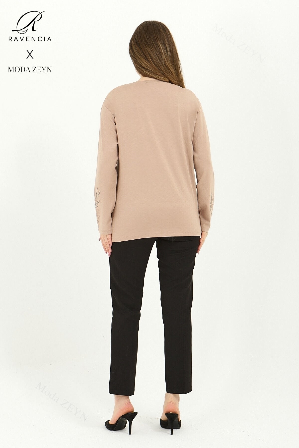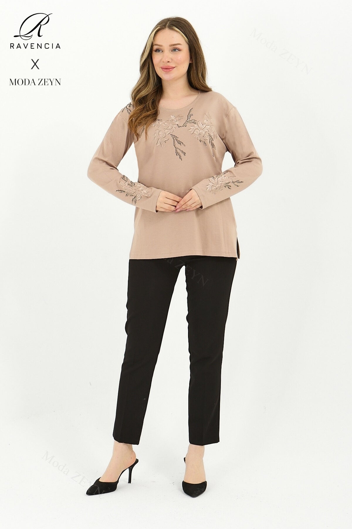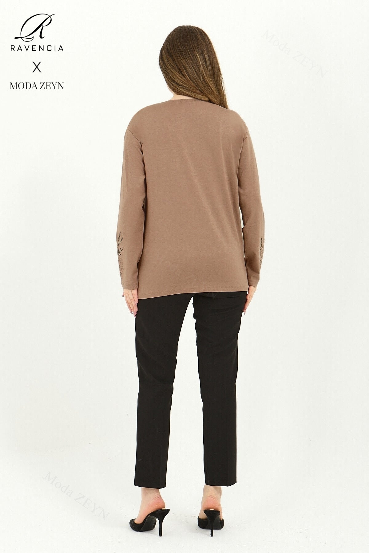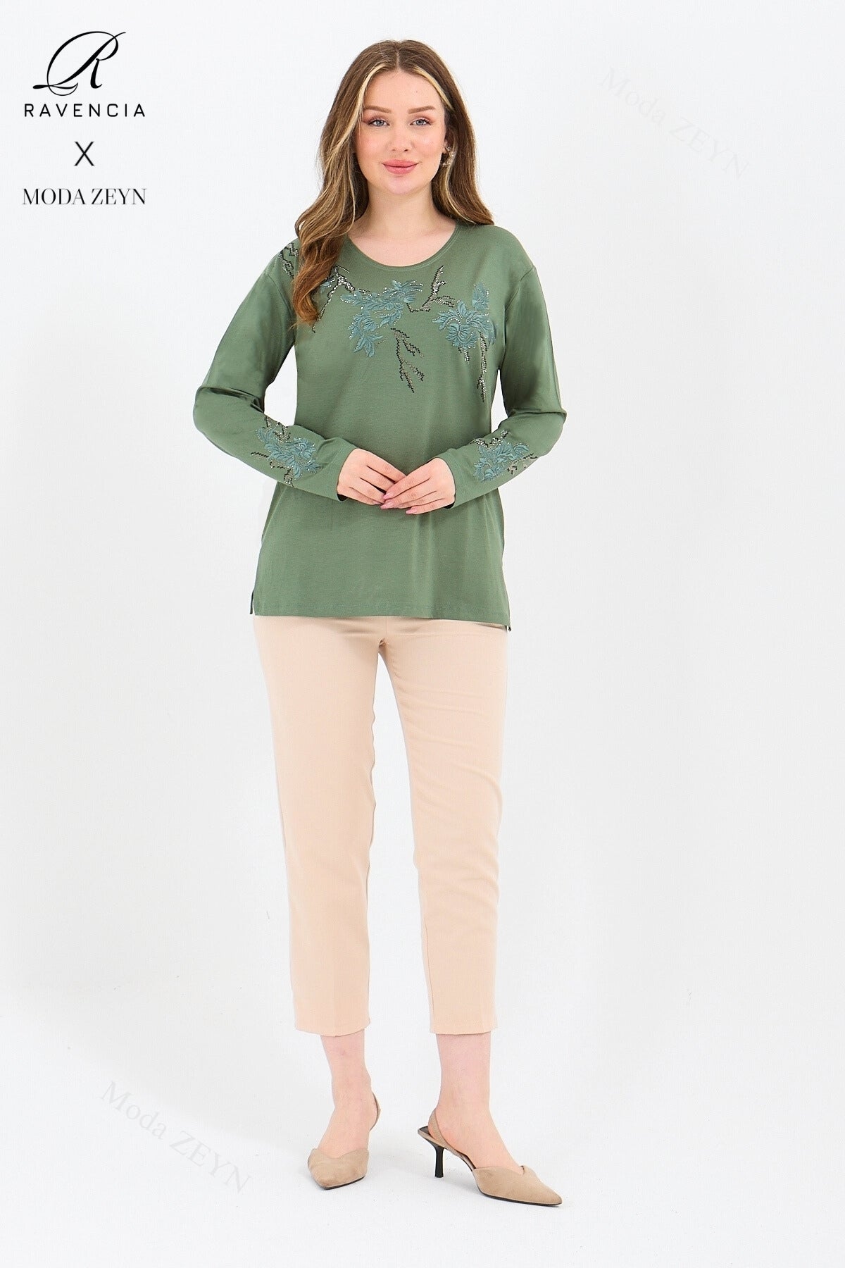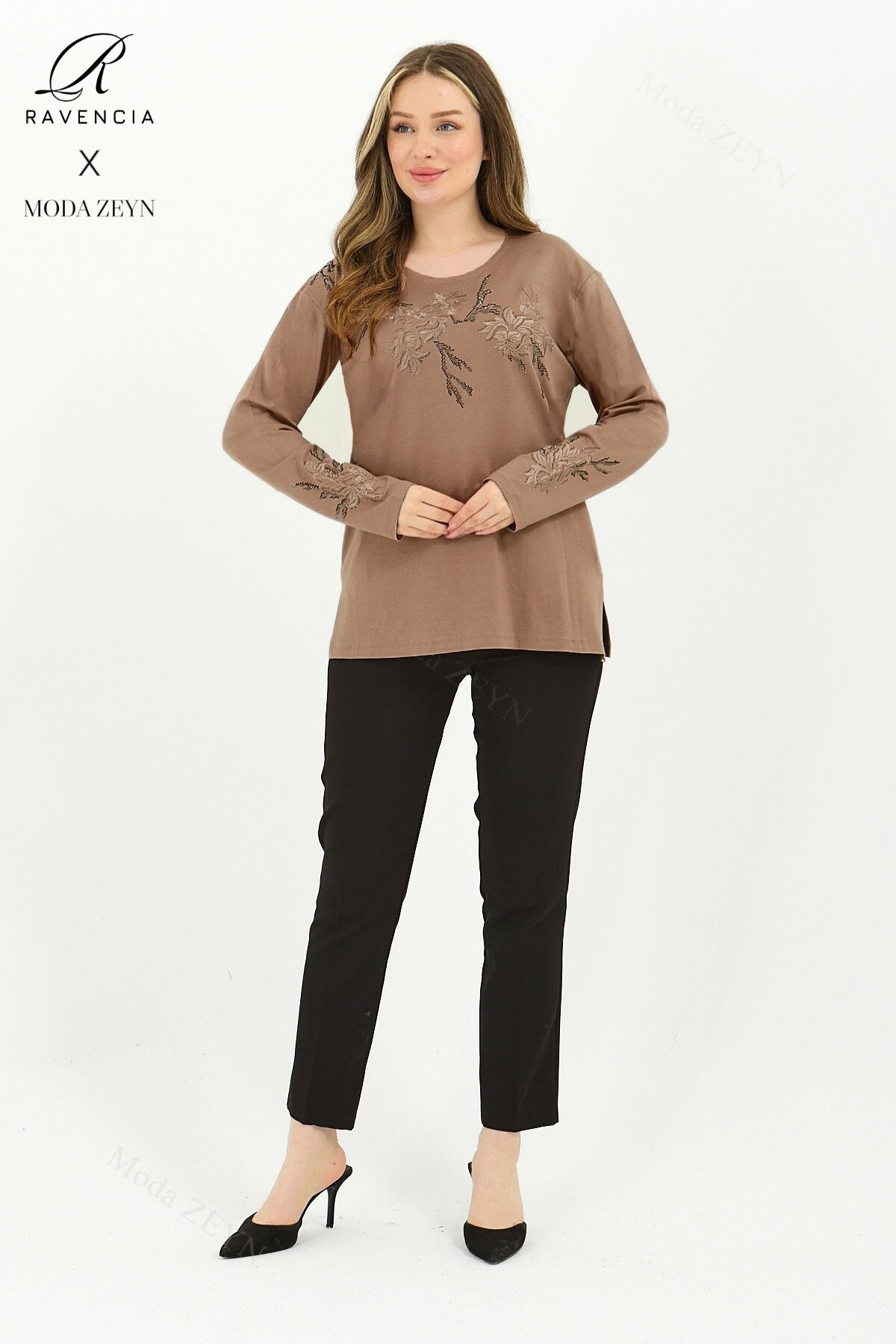 Kadın Orta Yaş Ve Üzeri Viskon Ağaç Desen Taşlı Işlemeli Likralı Anne Penye Bluz