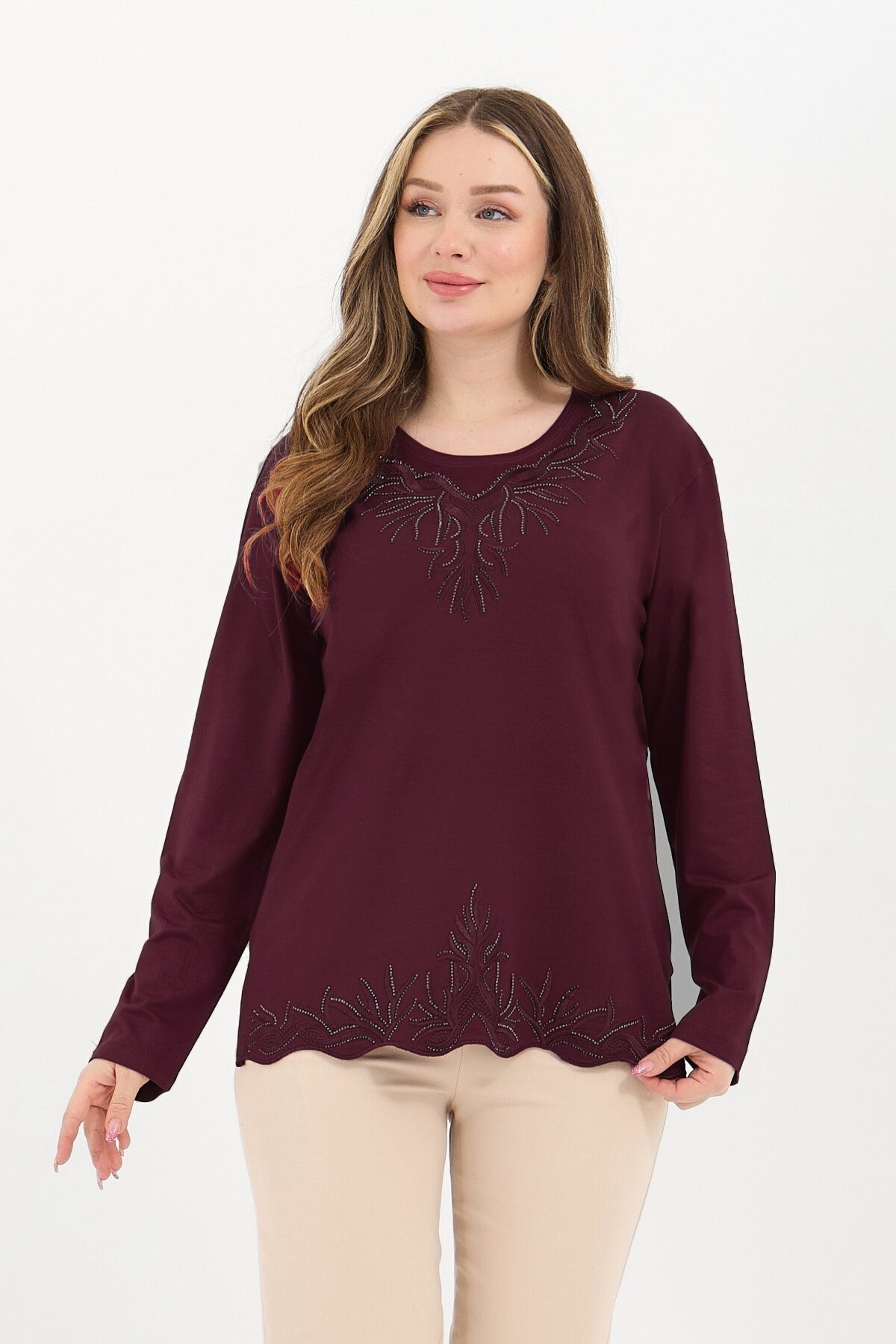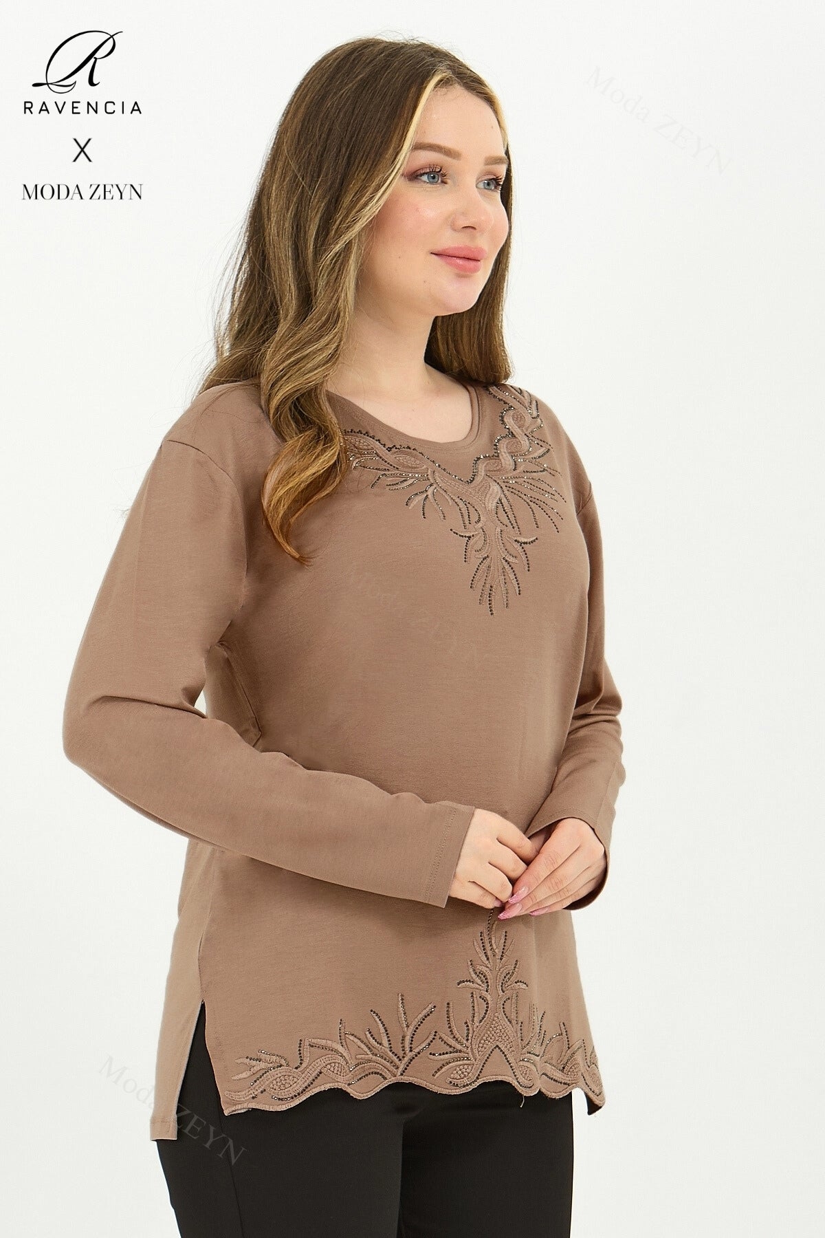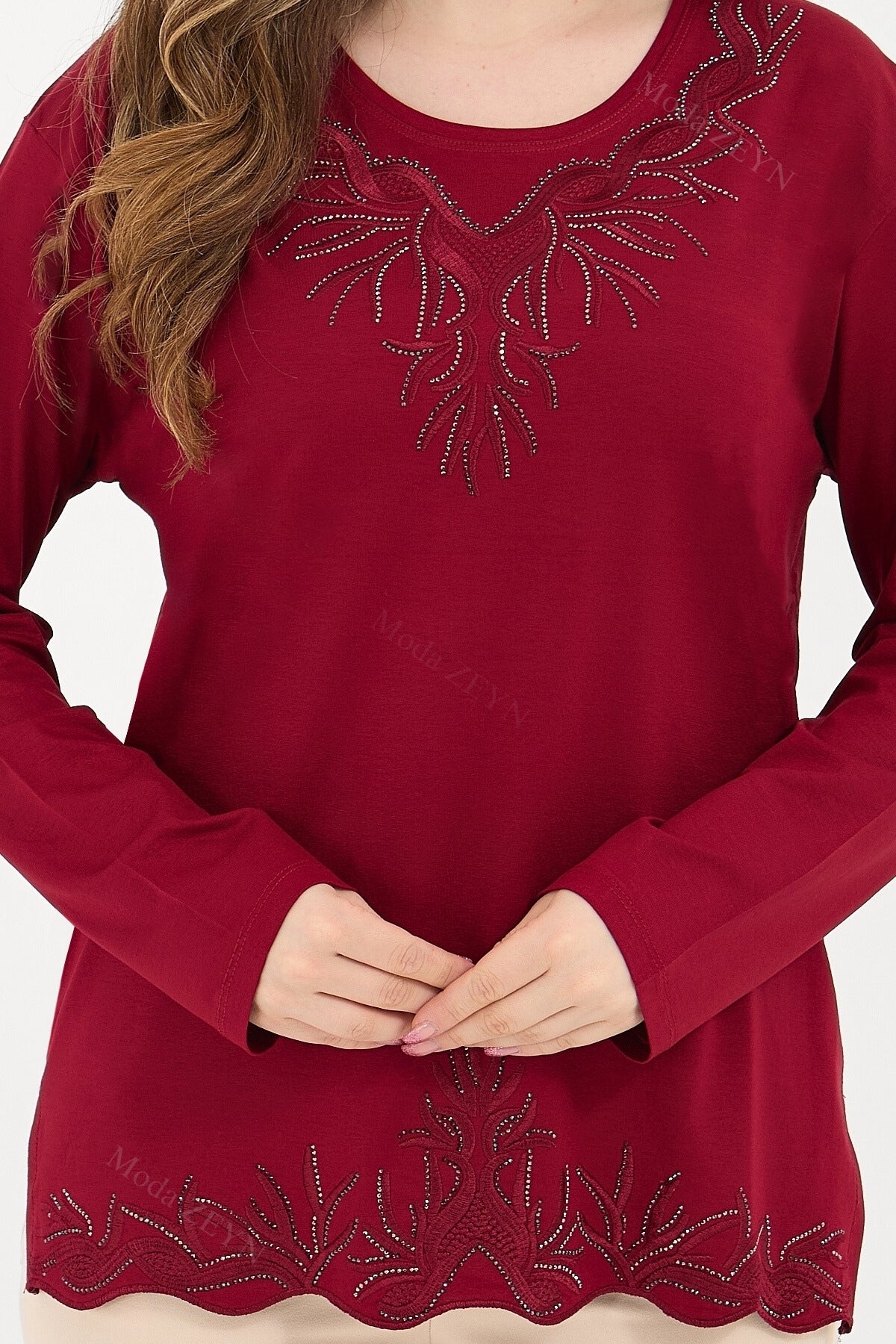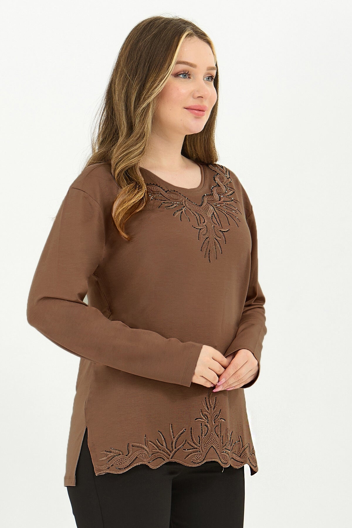 Kadın Orta Yaş Ve Üzeri Viskon Yaka Etek Taşlı Işlemeli Likralı Koyu Kahverengi Anne Penye Bluz