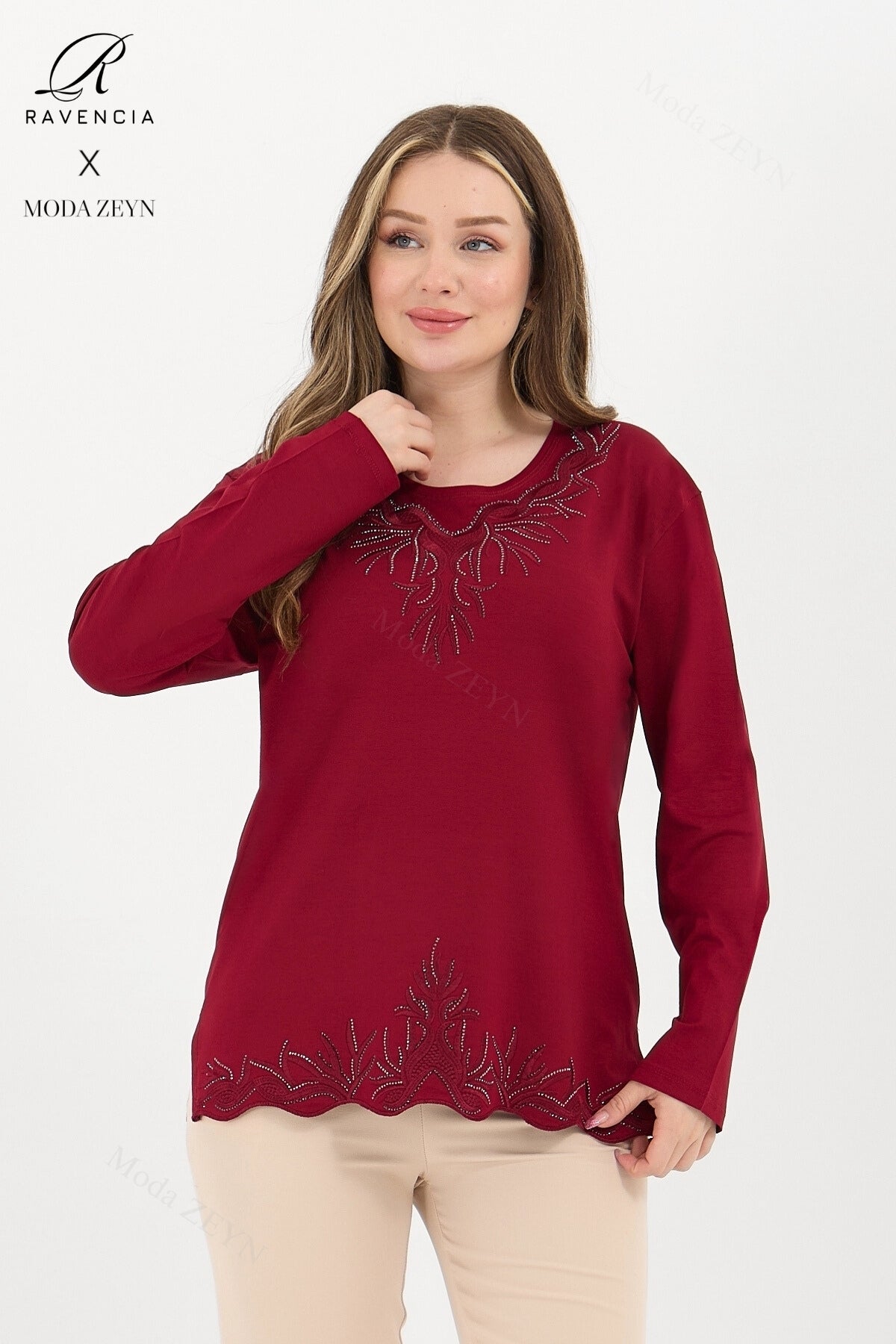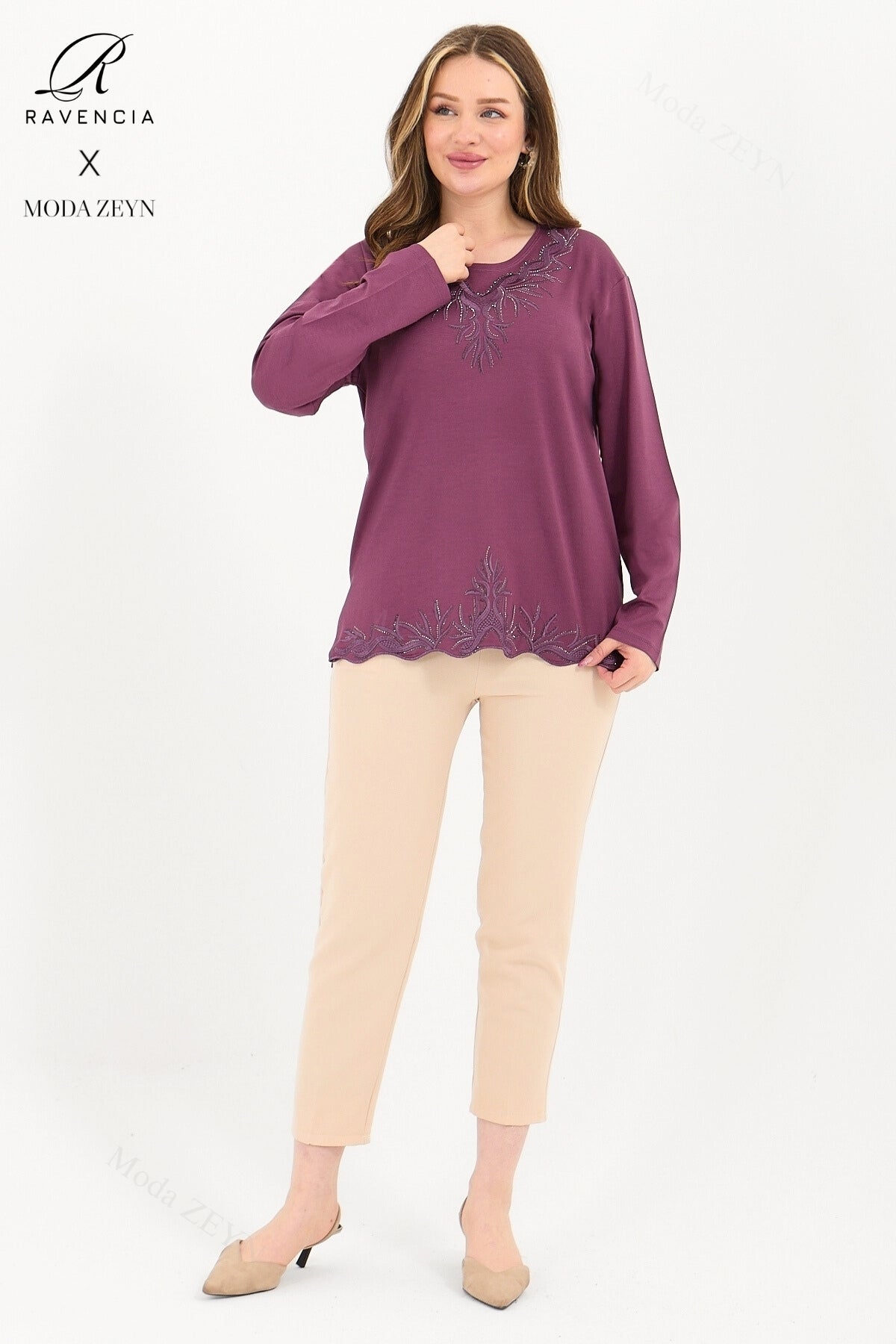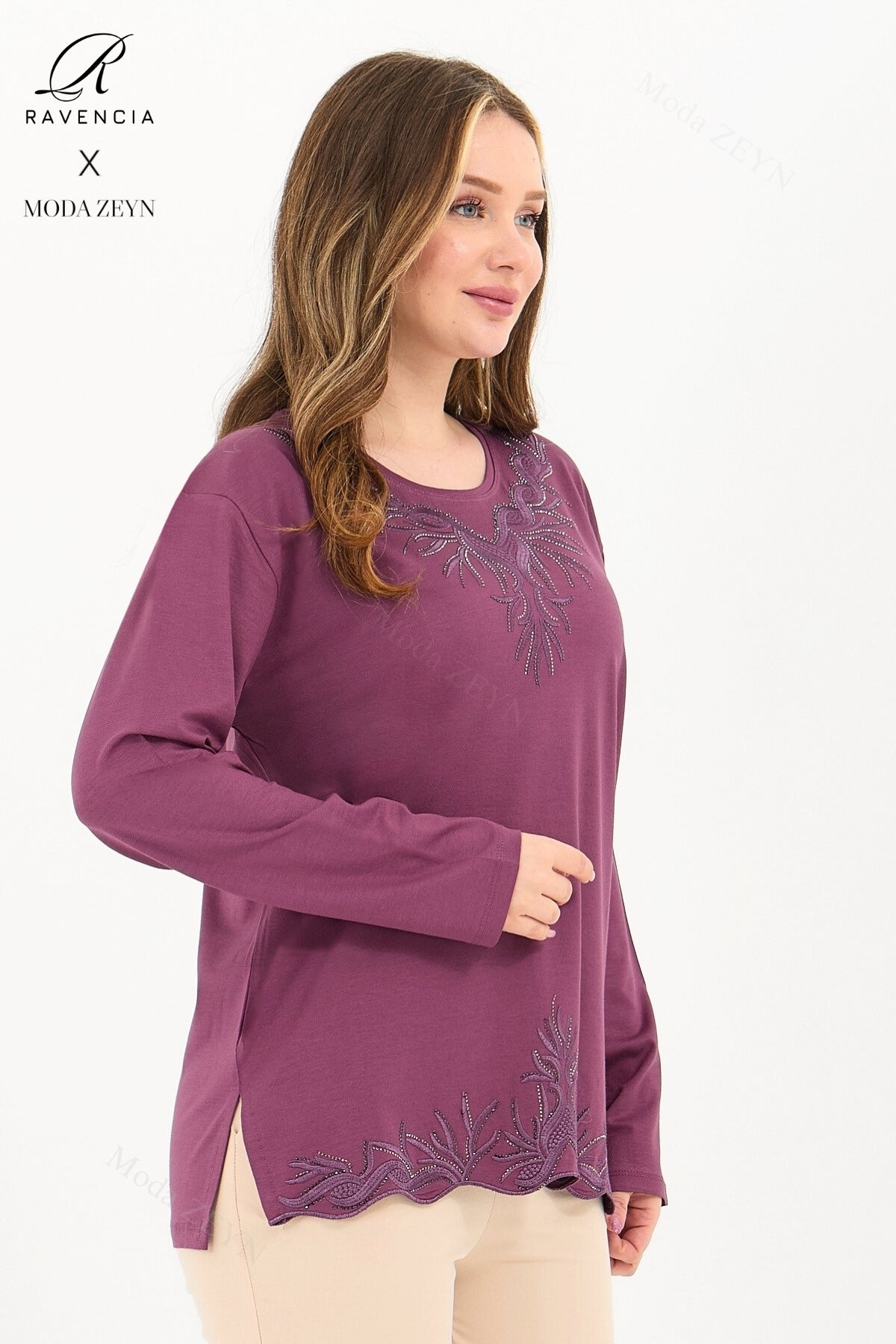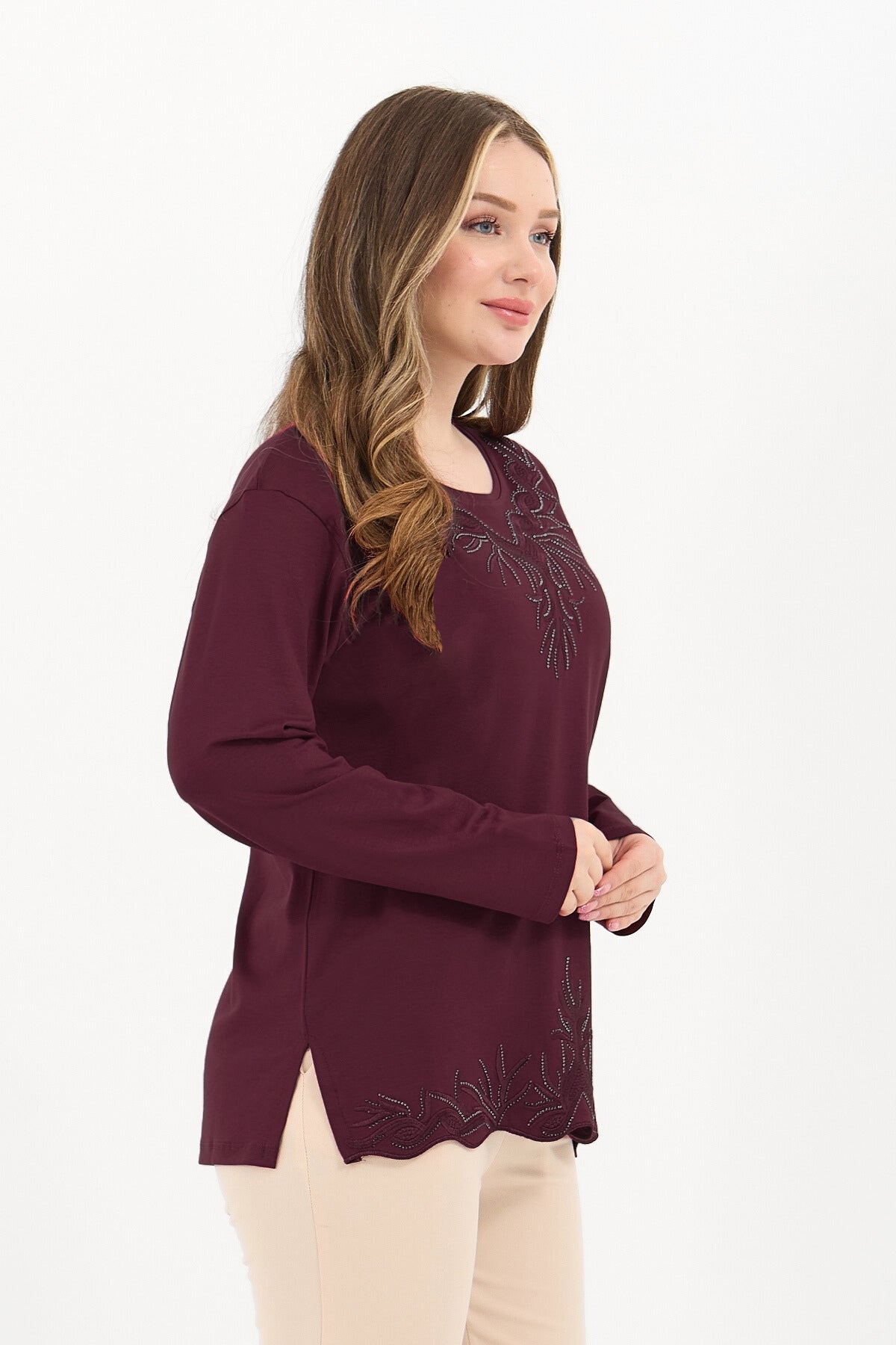Kadın Orta Yaş Ve Üzeri Viskon Yaka Etek Taşlı Işlemeli Likralı Koyu Kahverengi Anne Penye Bluz