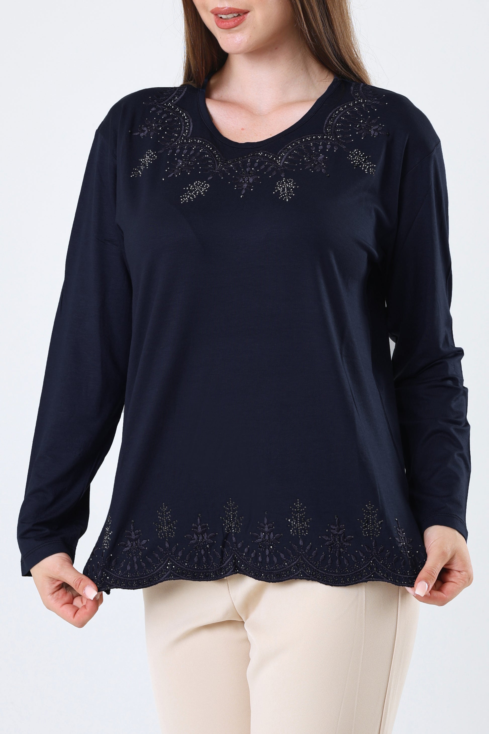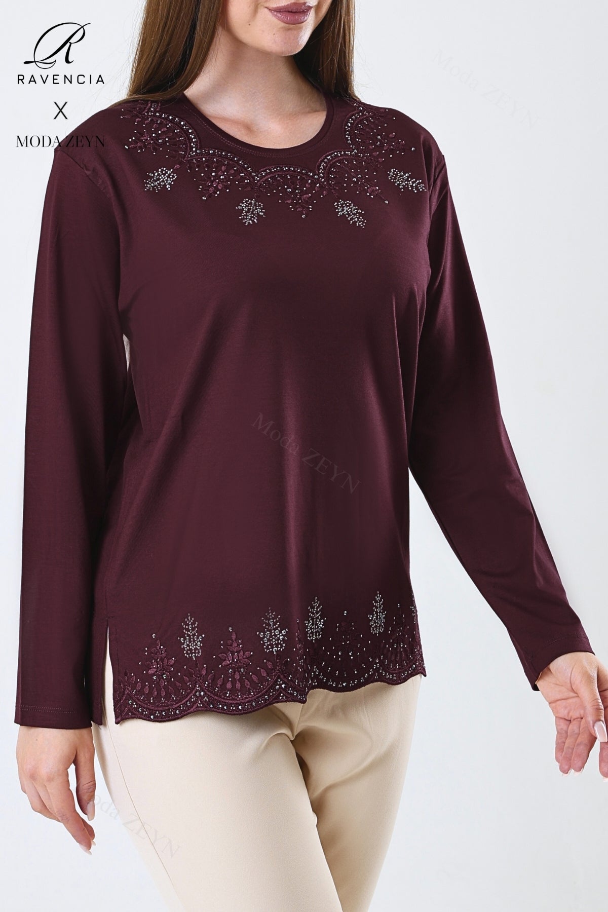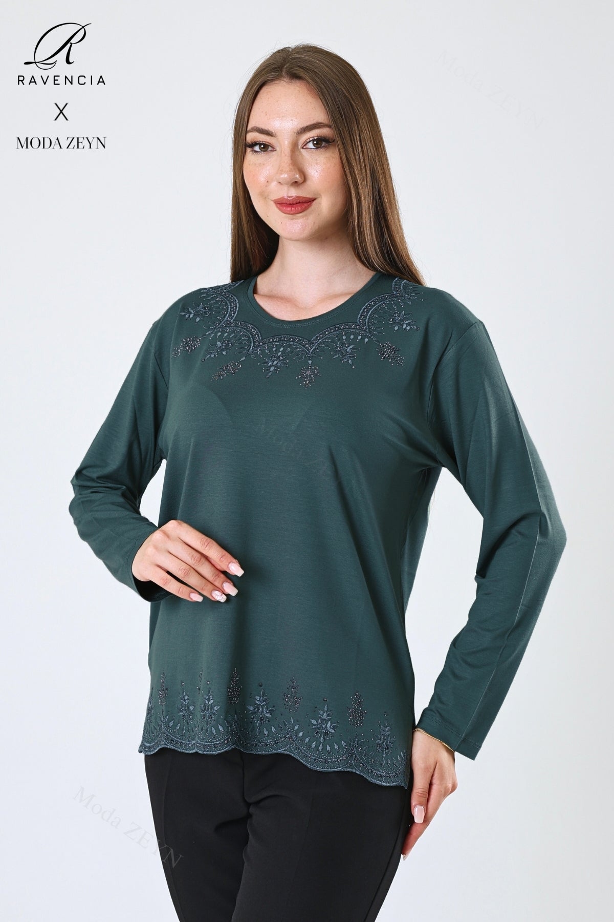Kadın Orta Yaş Ve Üzeri Viskon Yaprak Desenli Eteği Yakası Taşlı Işlemeli Likralı Zümrüt Anne Penye