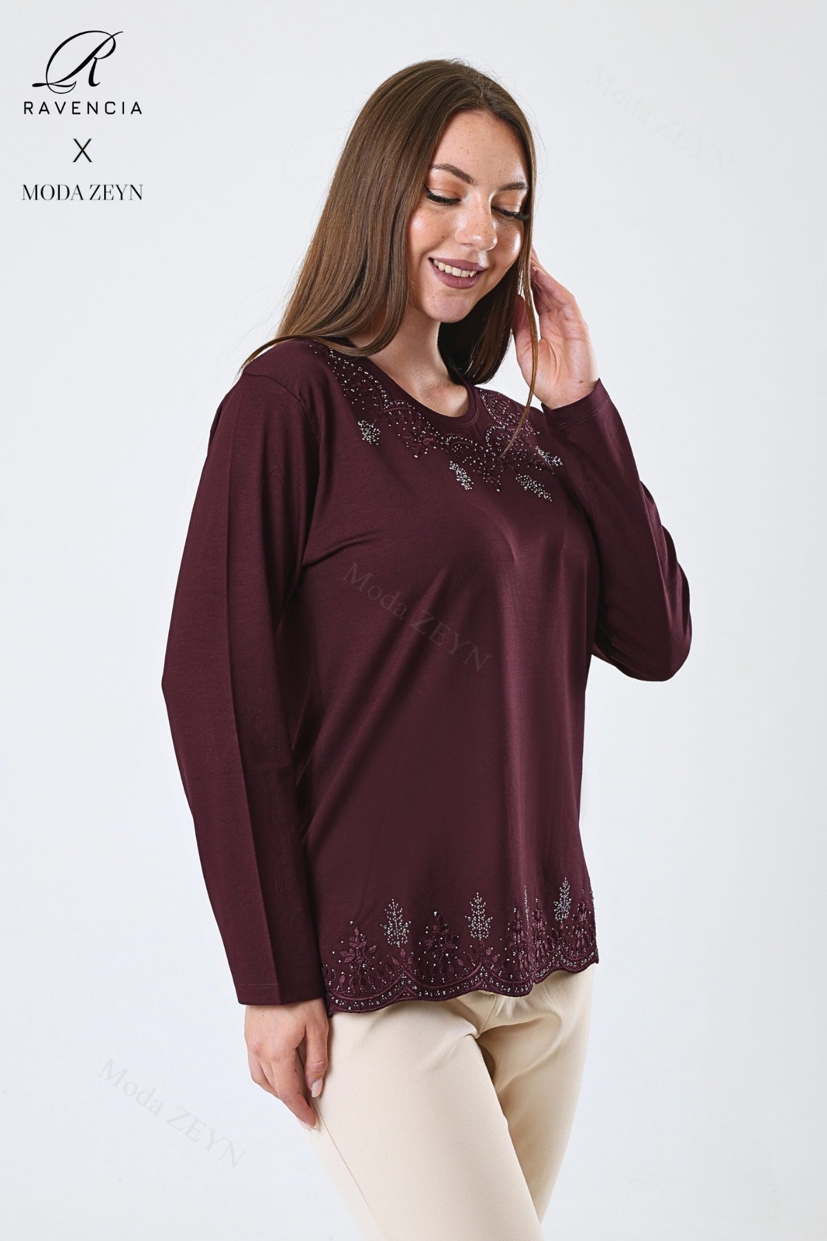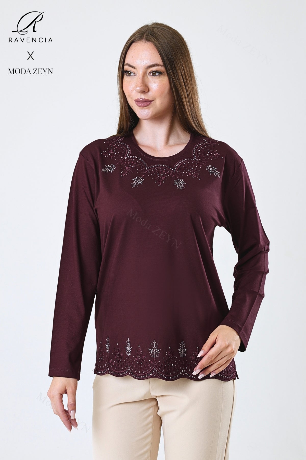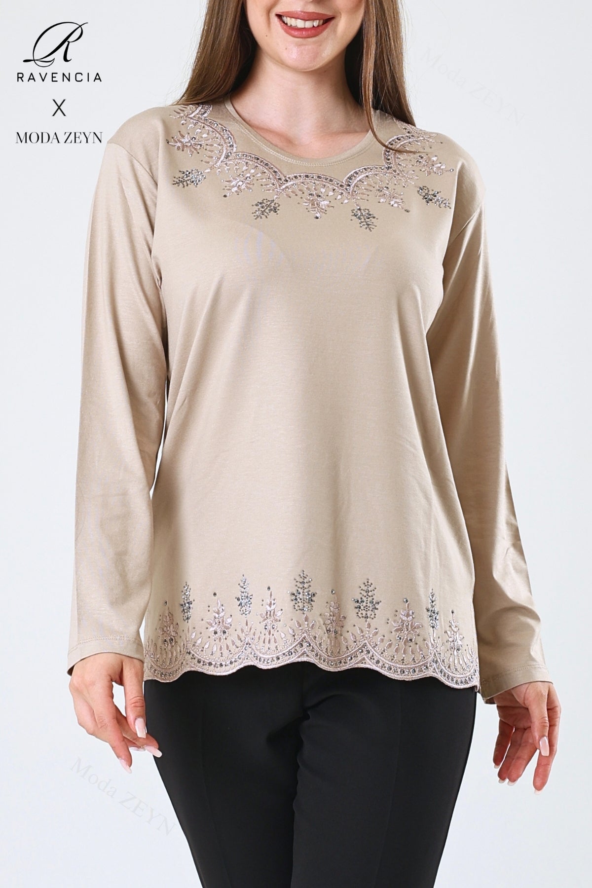 Kadın Orta Yaş Ve Üzeri Viskon Yaprak Desenli Eteği Yakası Taşlı Işlemeli Likralı Zümrüt Anne Penye