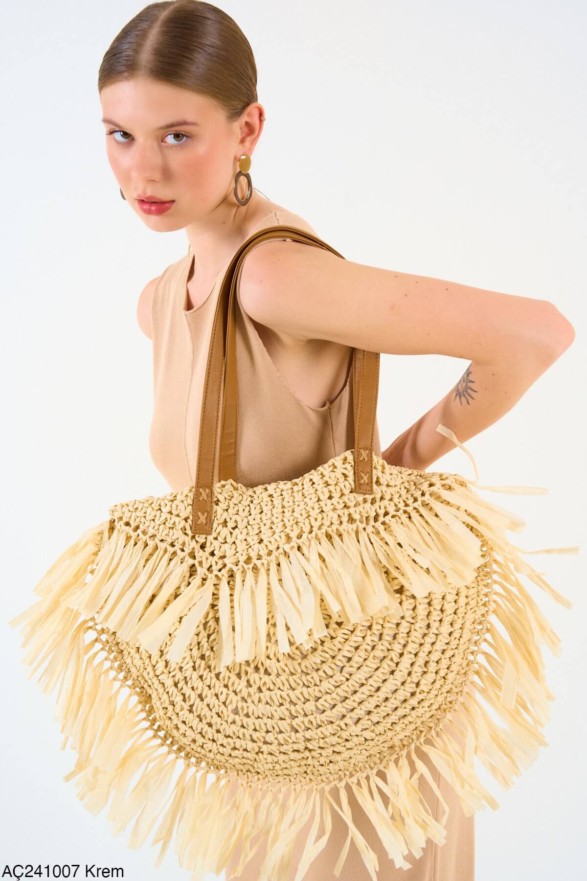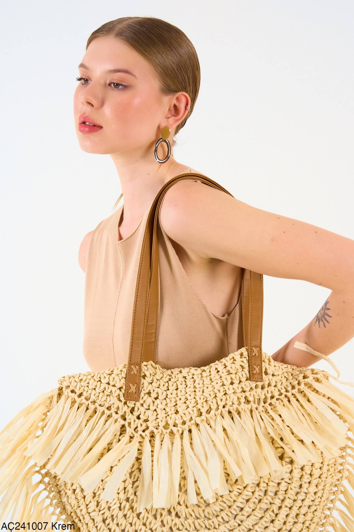 Kadın Premium Kalite Hasır Örme Astarlı Fermualı Krem Canta