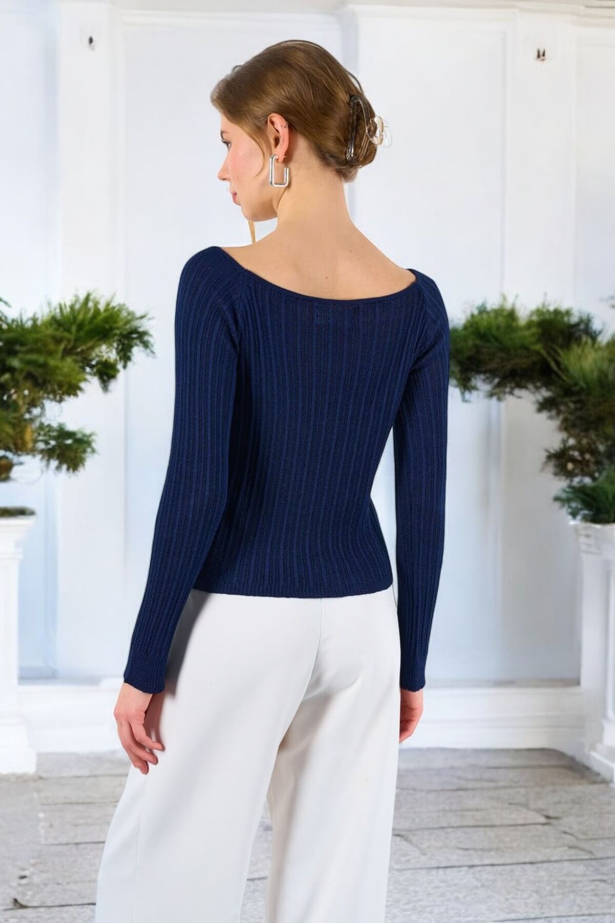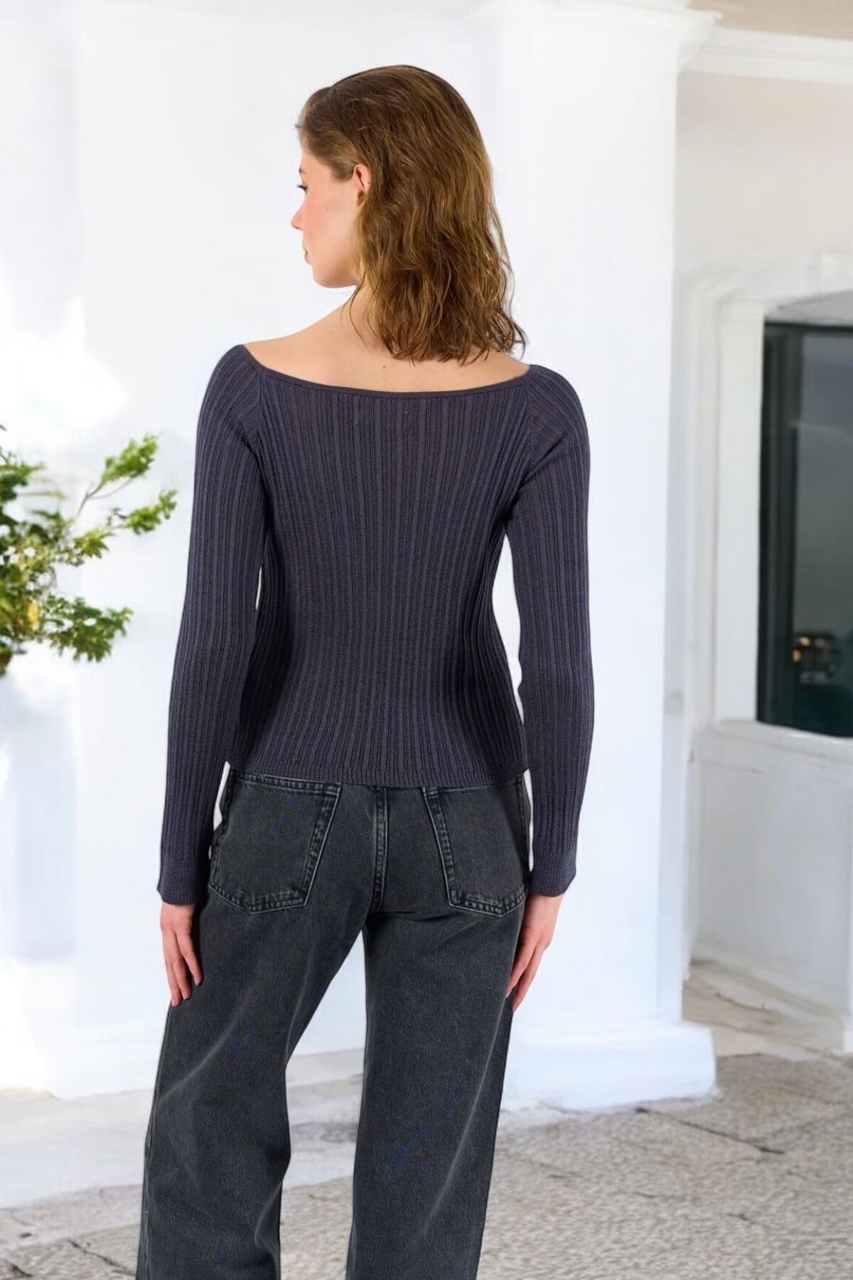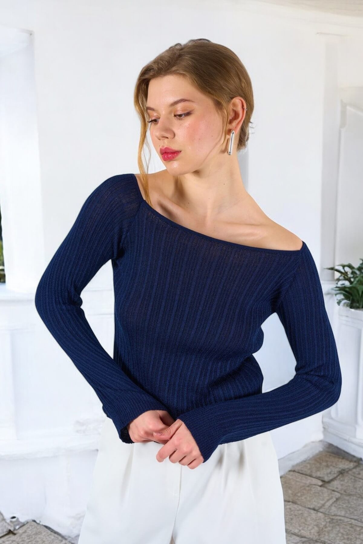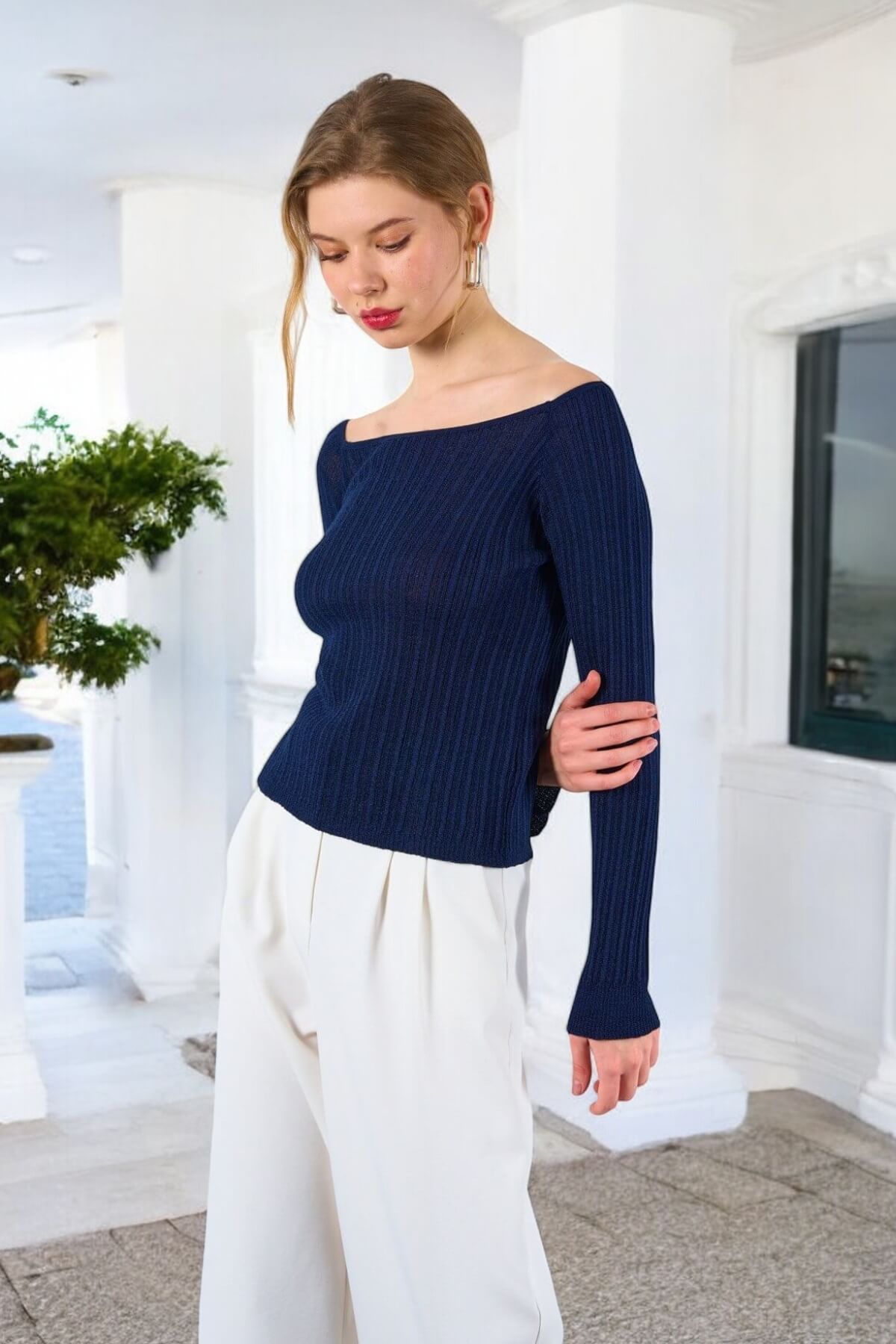 Kadın premium kalite kayık yaka kazak, zarif ve modern bir stile sahiptir.