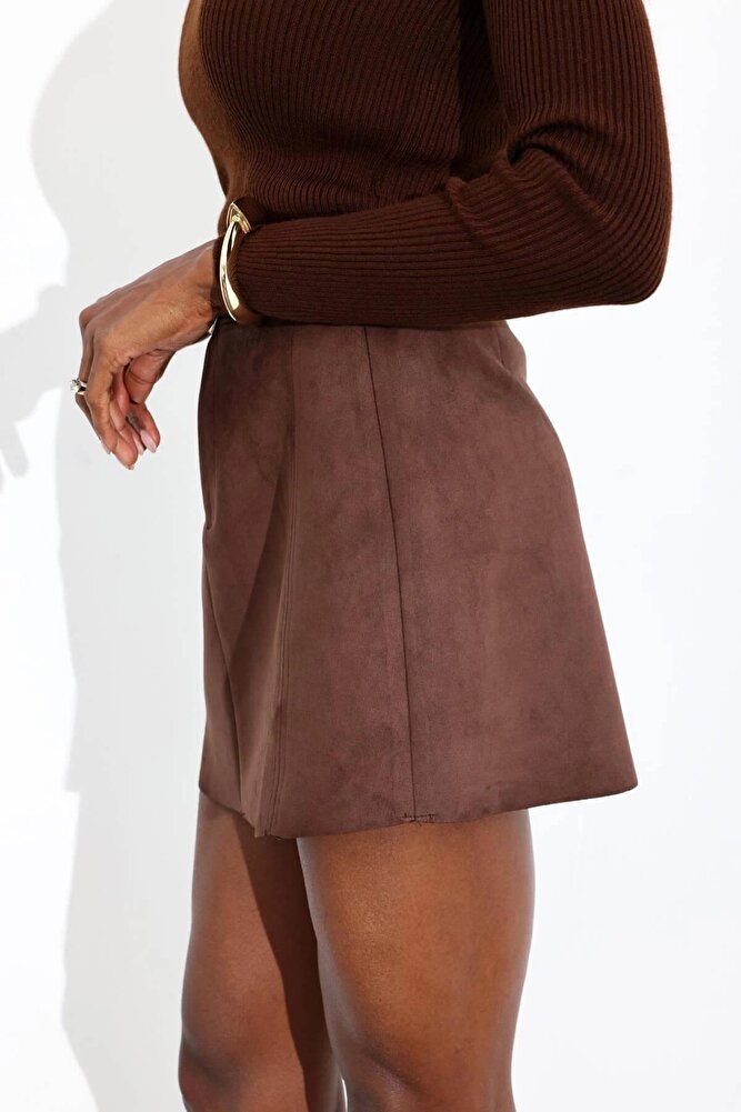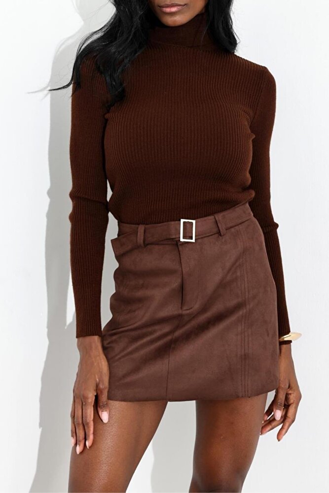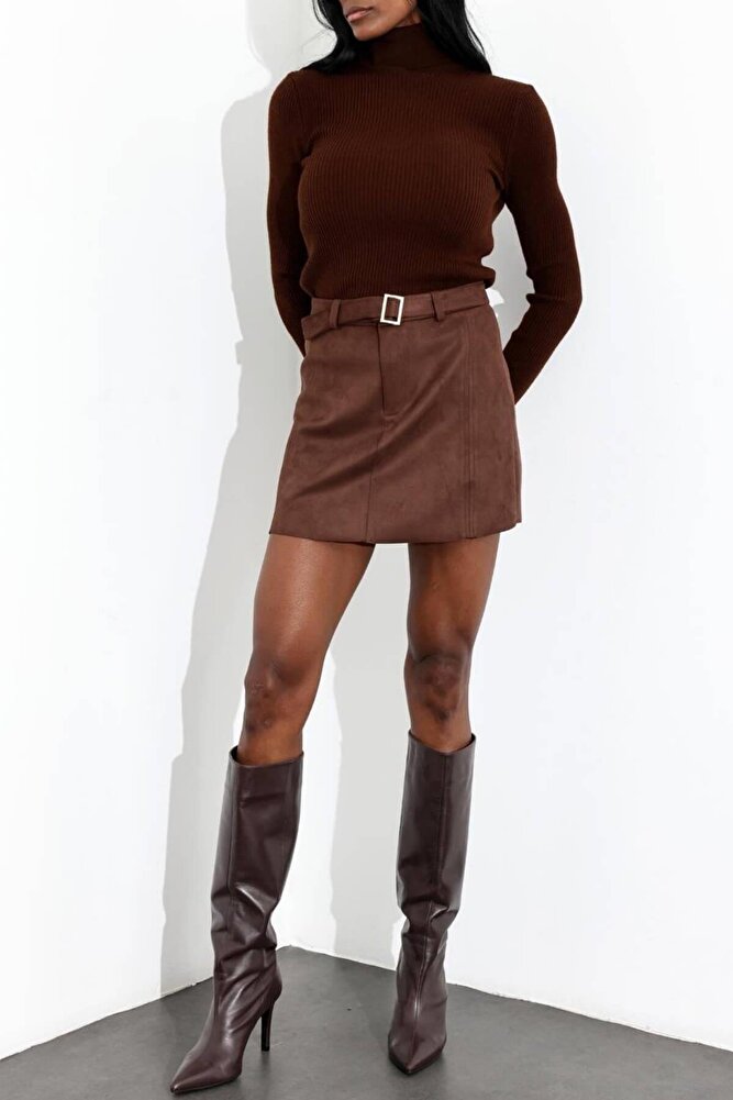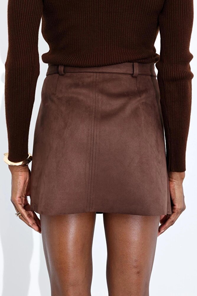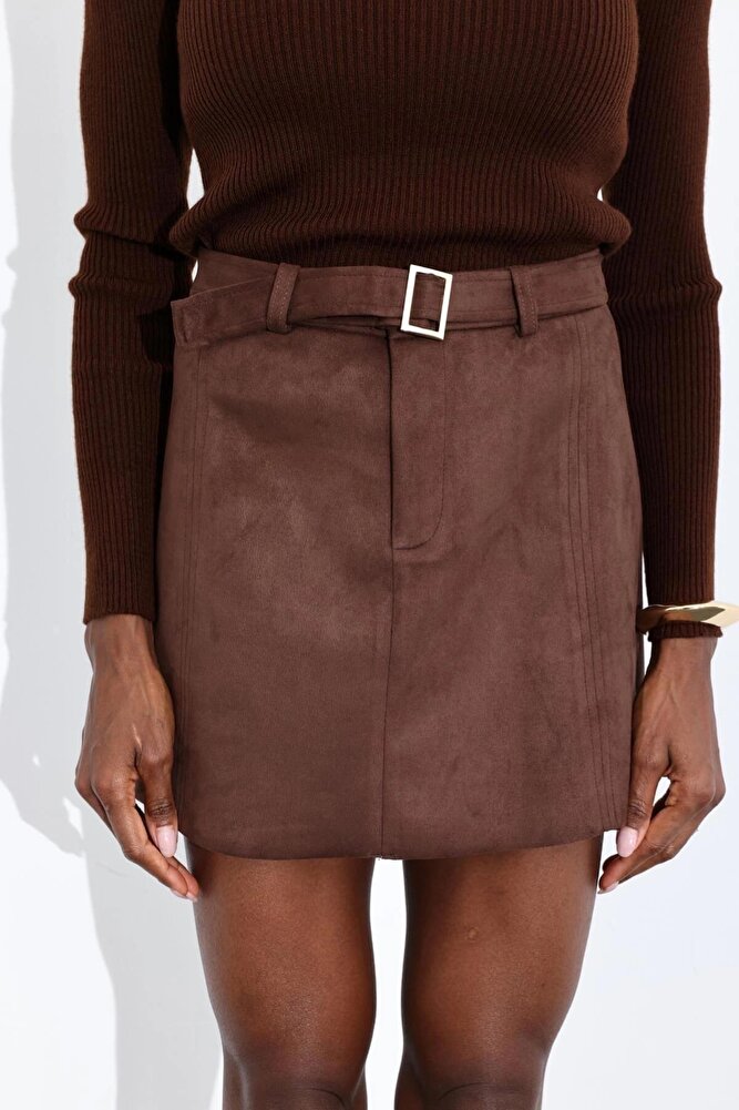 Kadın Premium Kalite Süet Kemerli Likralı Acı Kahve Etek
