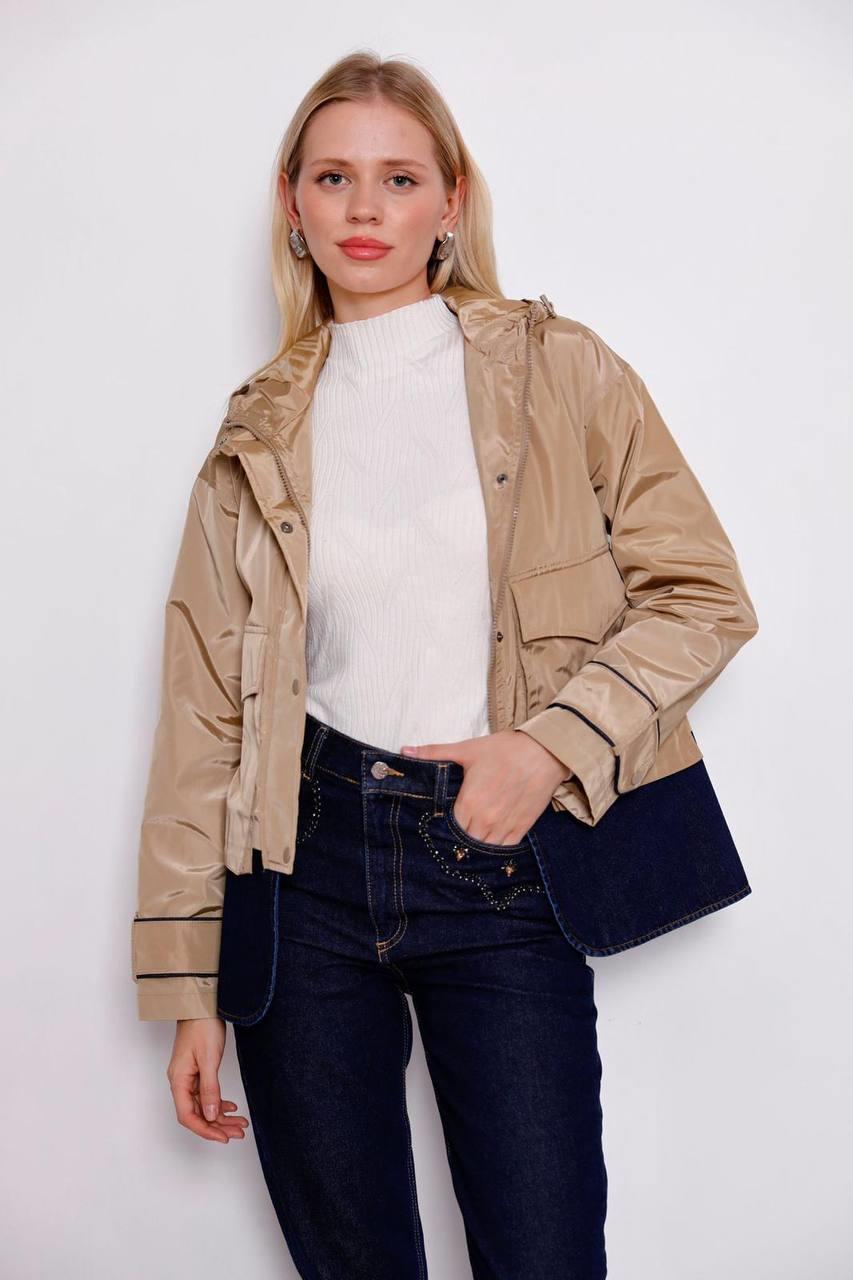Kadın Premium Kapşonlu Astarlı Kot Detaylı Camel Trenç Çeket