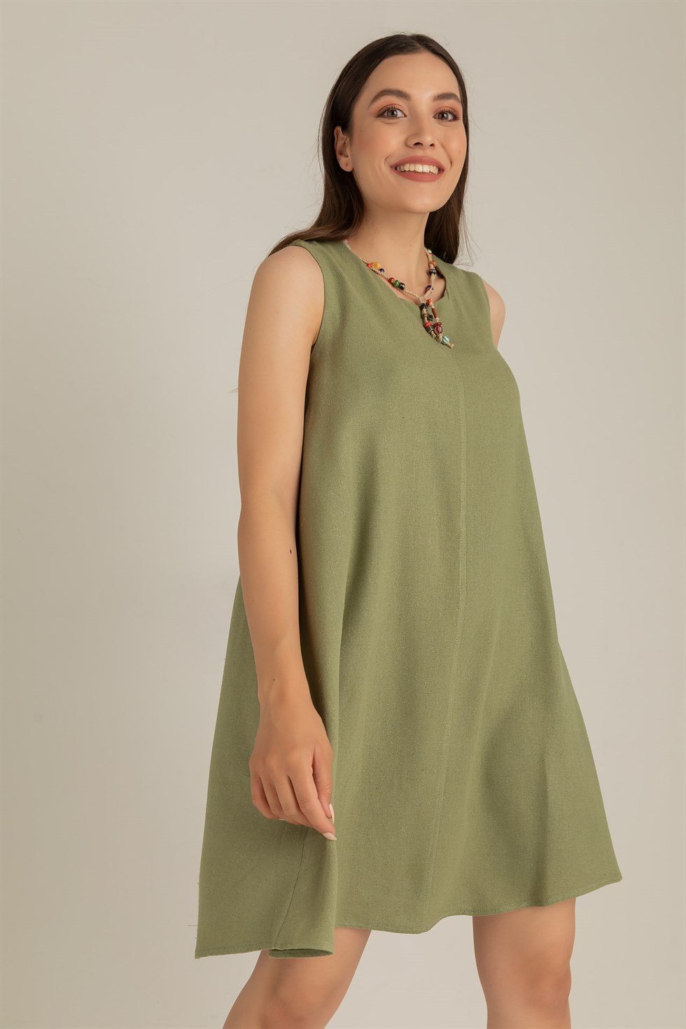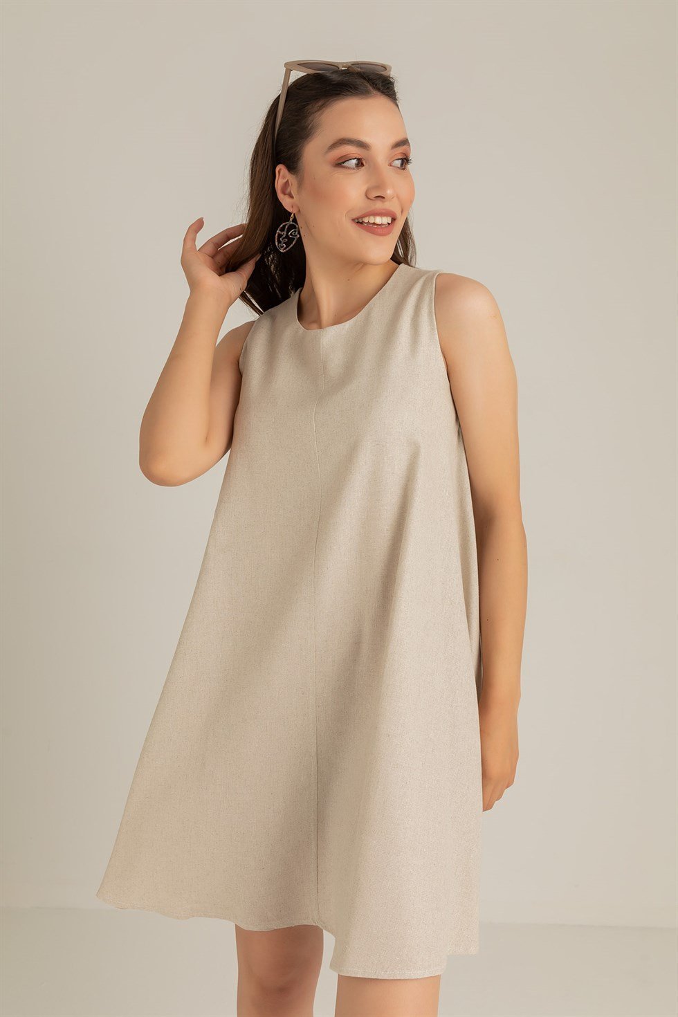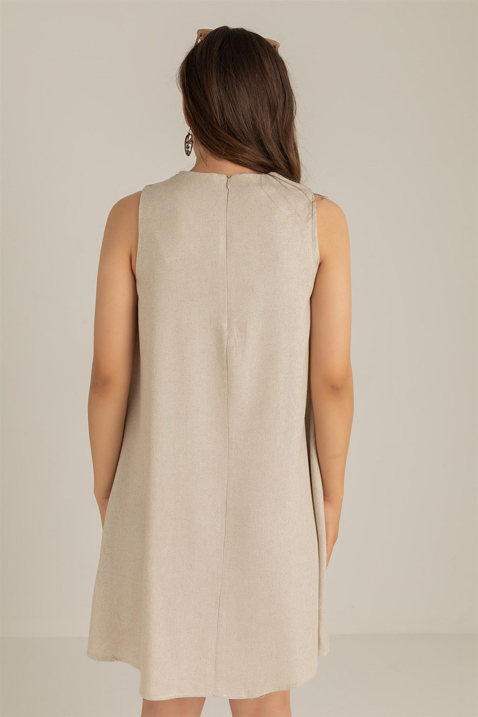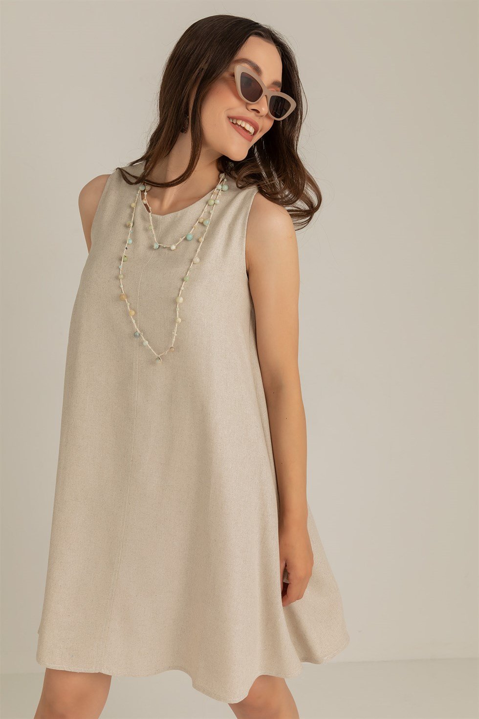Kadın sıfır kol keten elbise, sade ve doğal bir stile sahiptir.