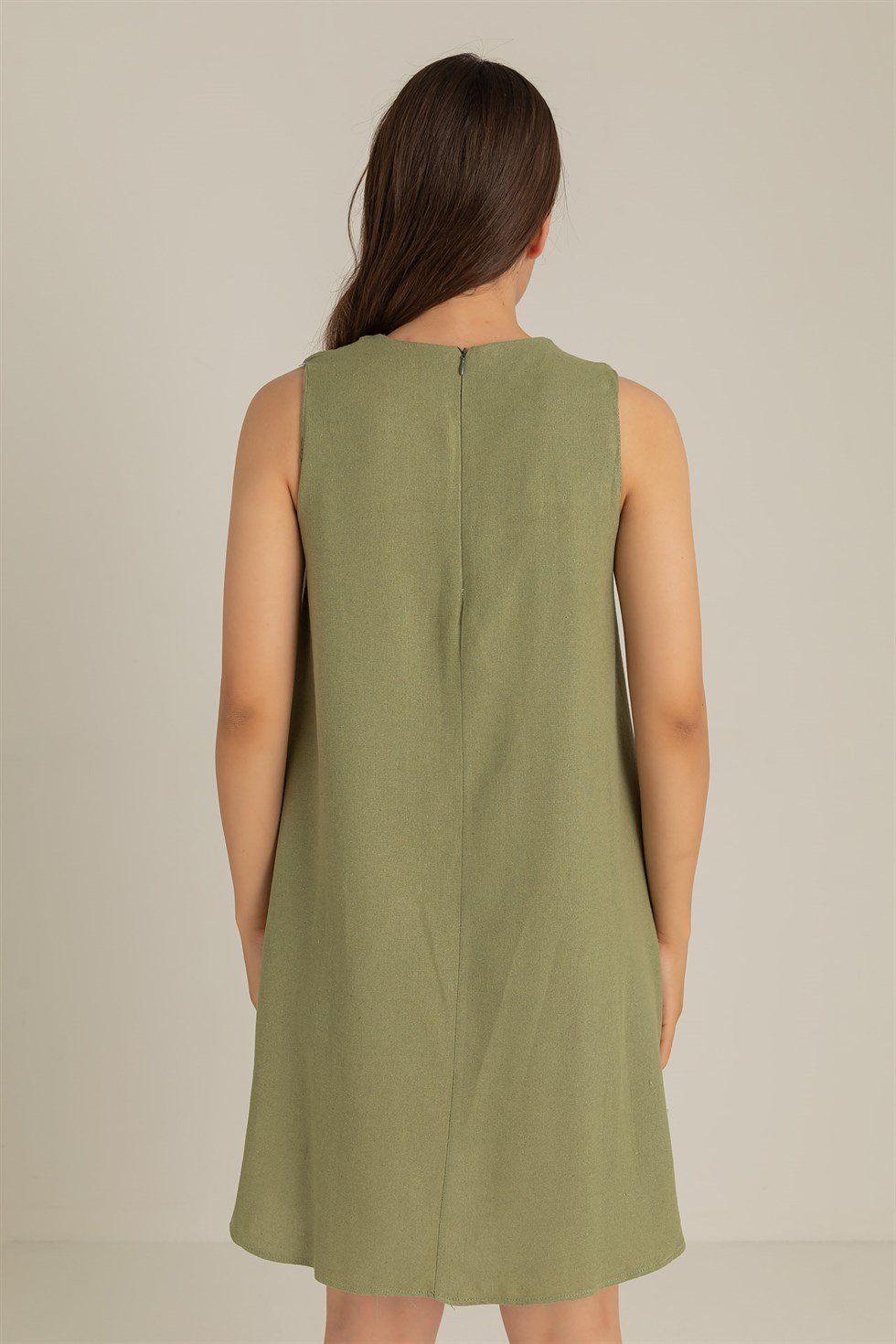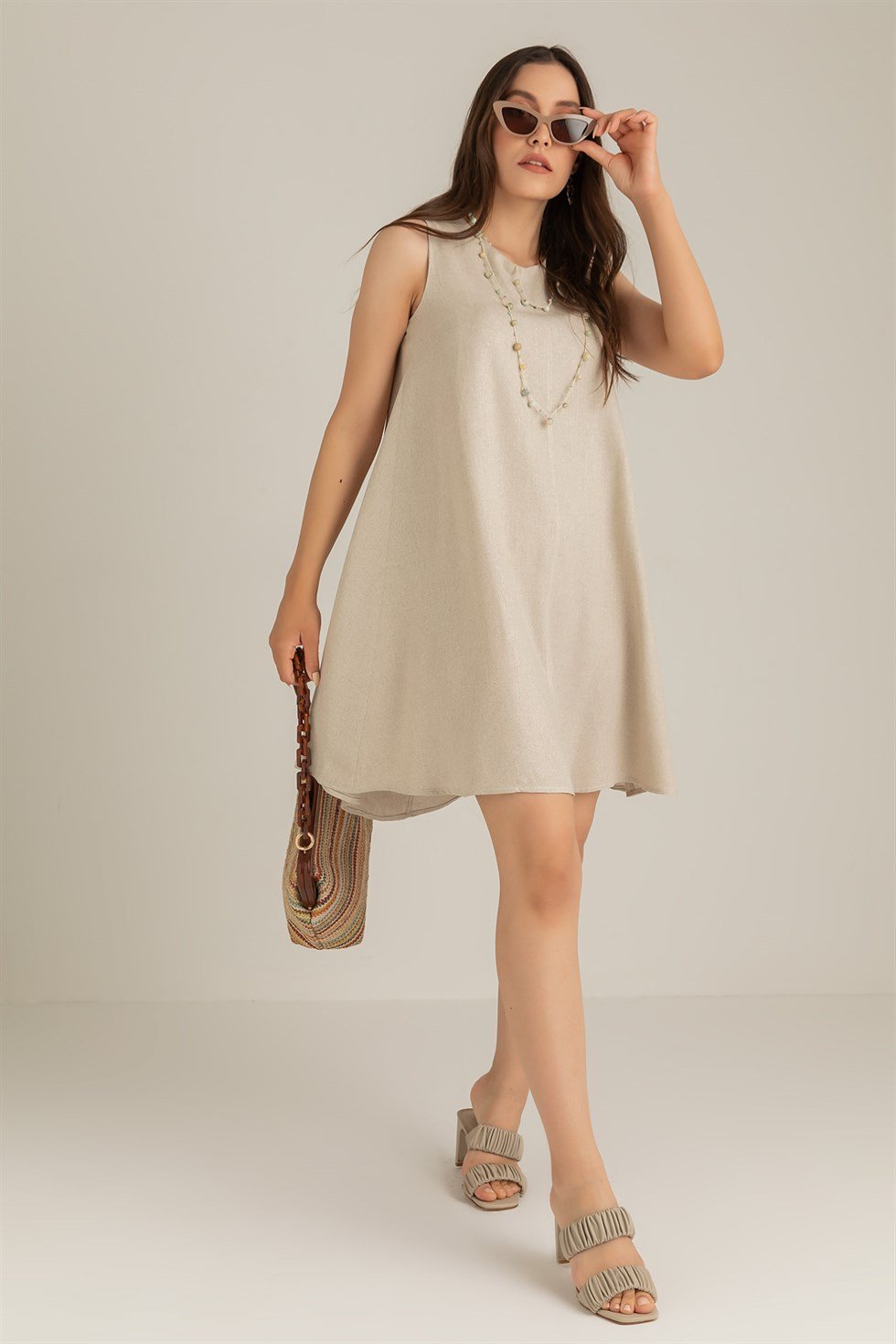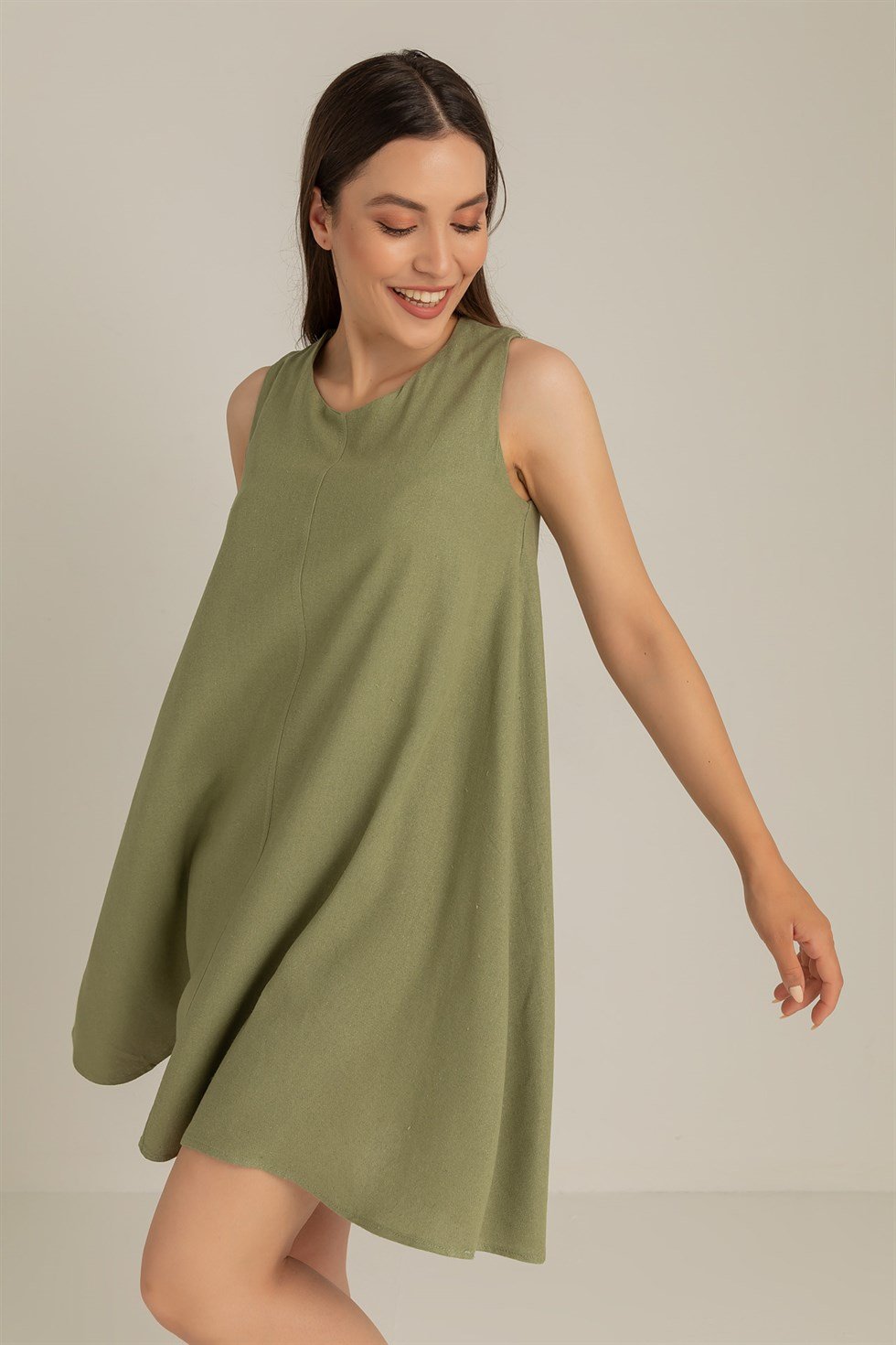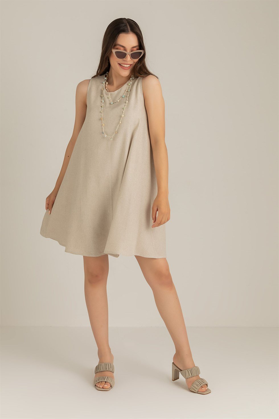 Kadın sıfır kol keten elbise, sade ve doğal bir stile sahiptir.