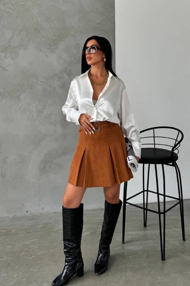 Kadın taba kemerli pileli mini süet etek, zarif ve modern bir stile sahiptir.