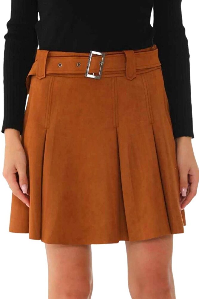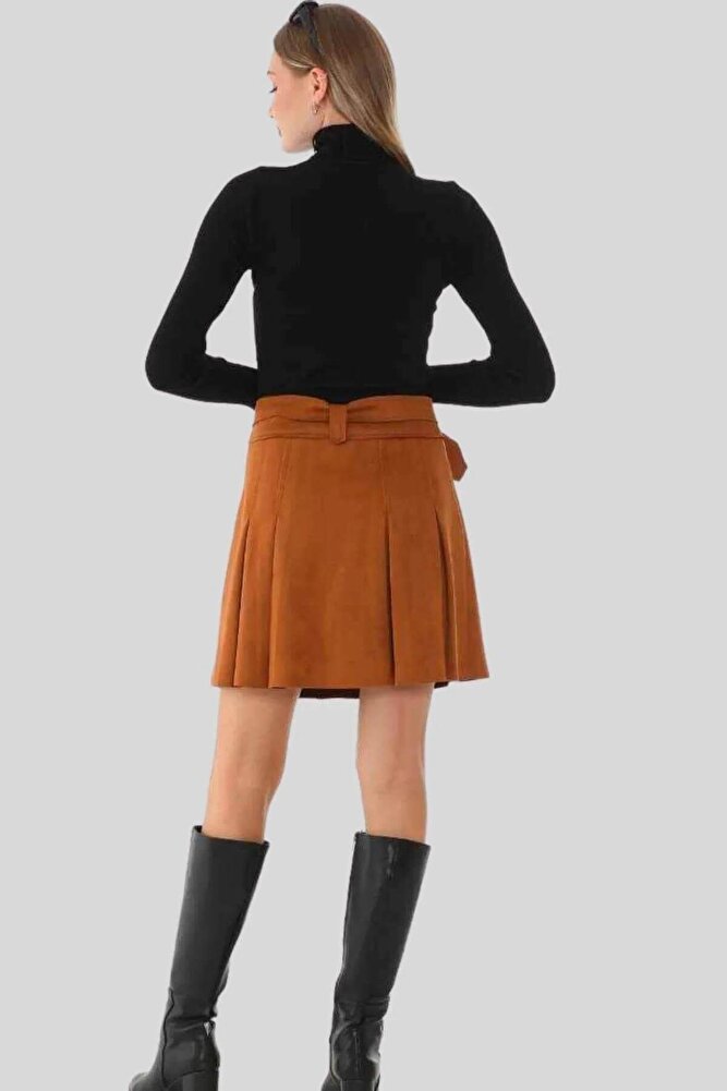 Kadın Taba Kemerli Pileli Mini Süet Etek