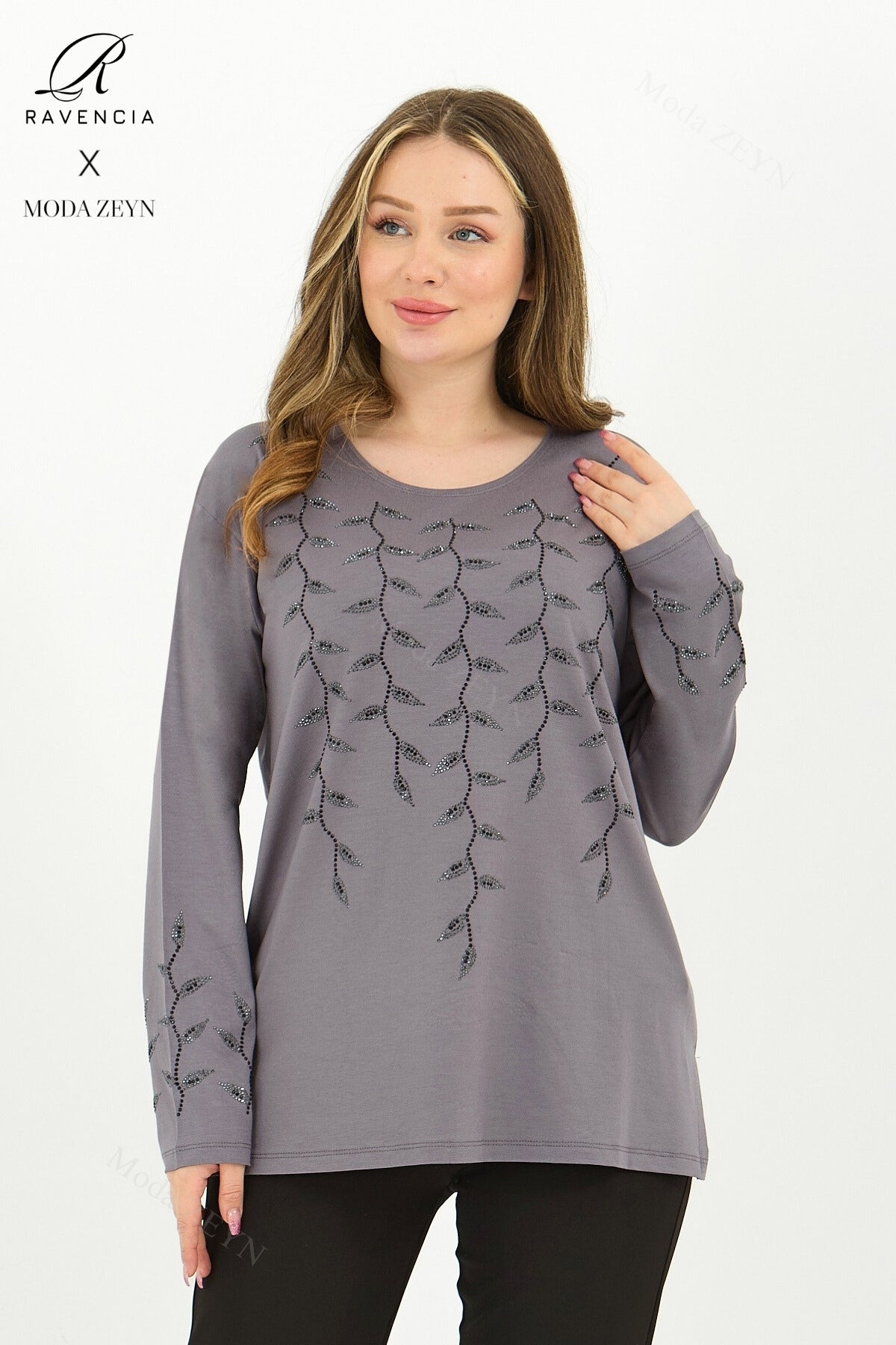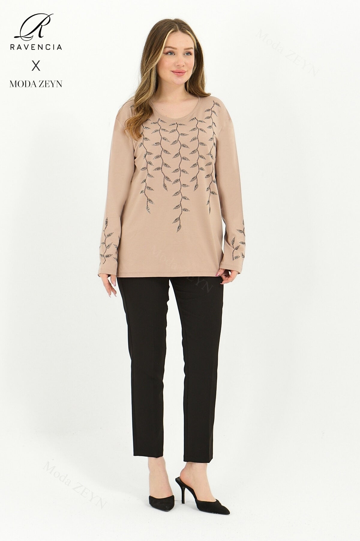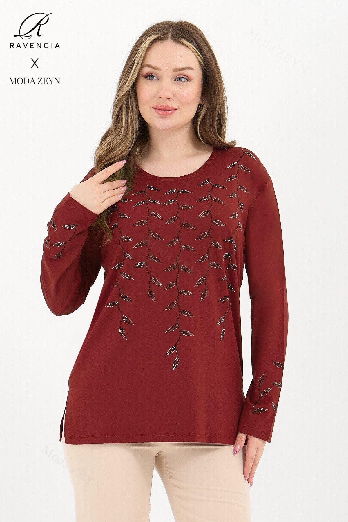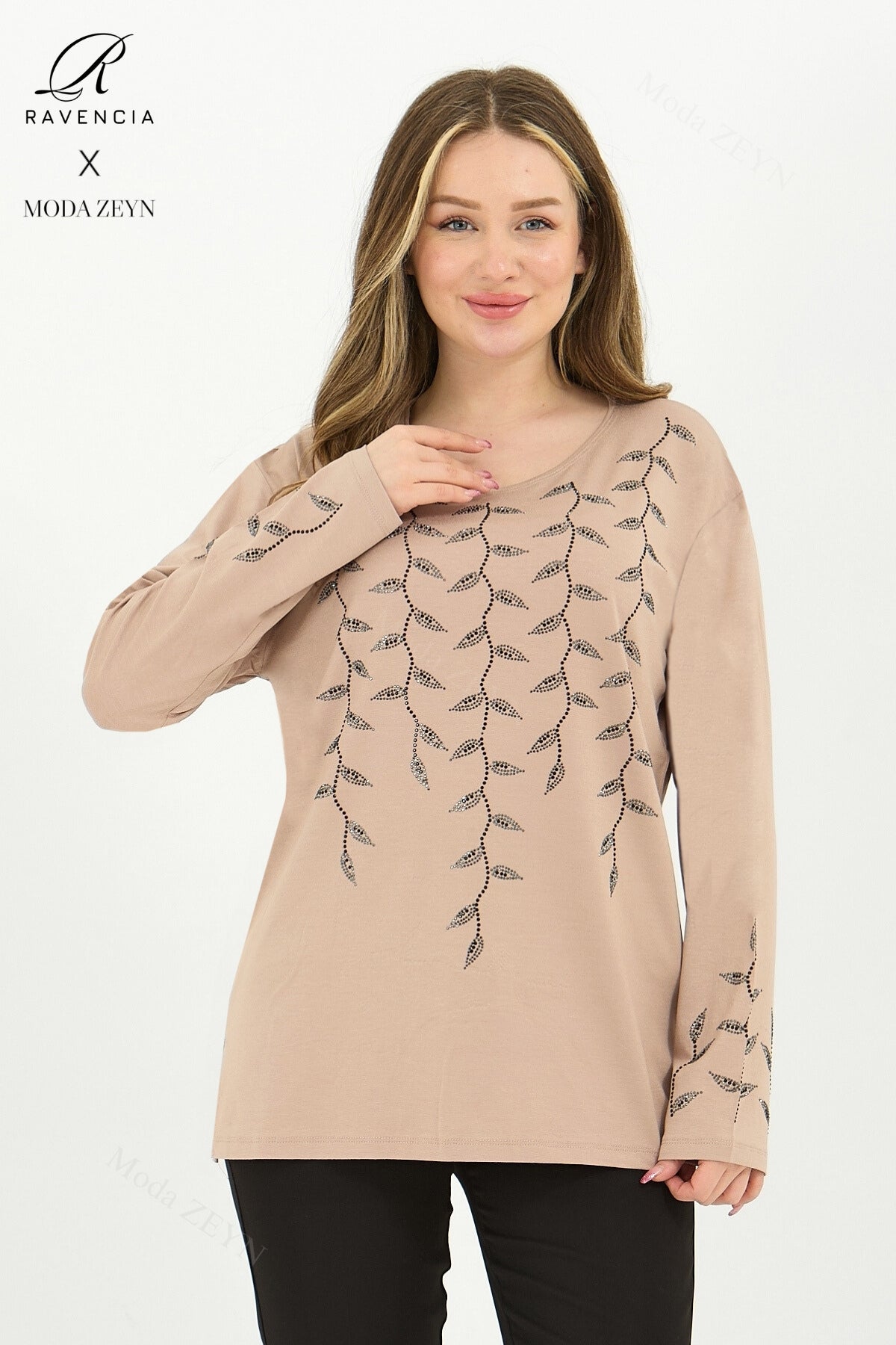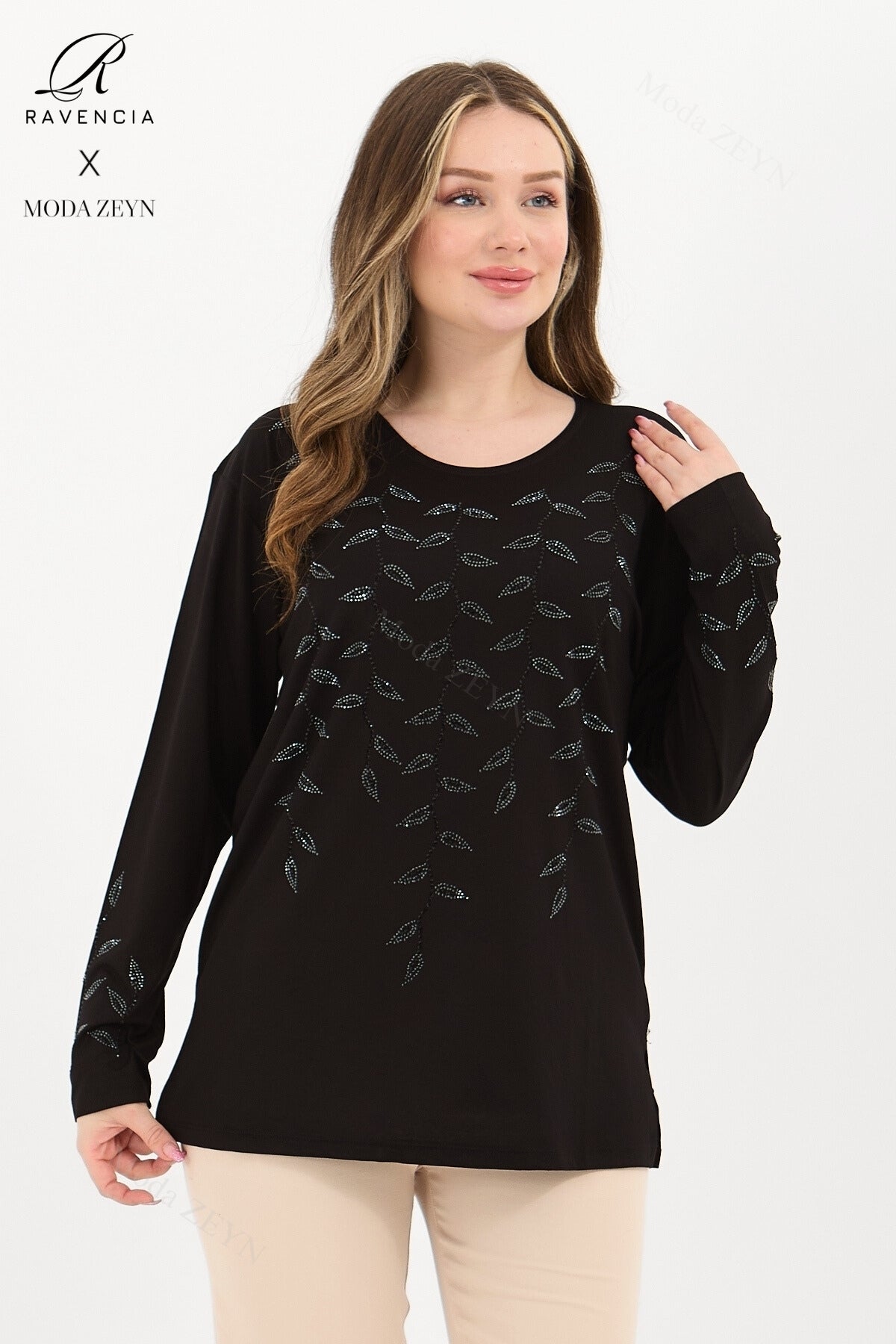 Gardırobunuzun en değerli parçası olmaya aday bu özel tasarım bluz, yüksek kaliteli viskon penye kumaşı ve göz alıcı taş işlemeleriyle şıklığı zahmetsizce yakalamanızı sağlar.