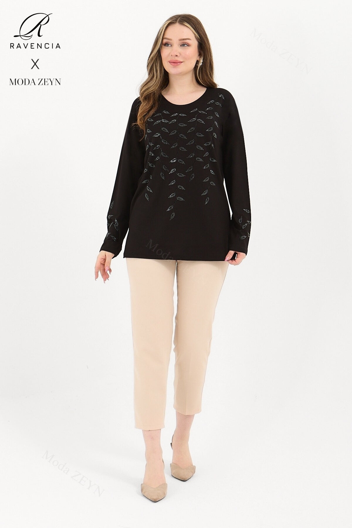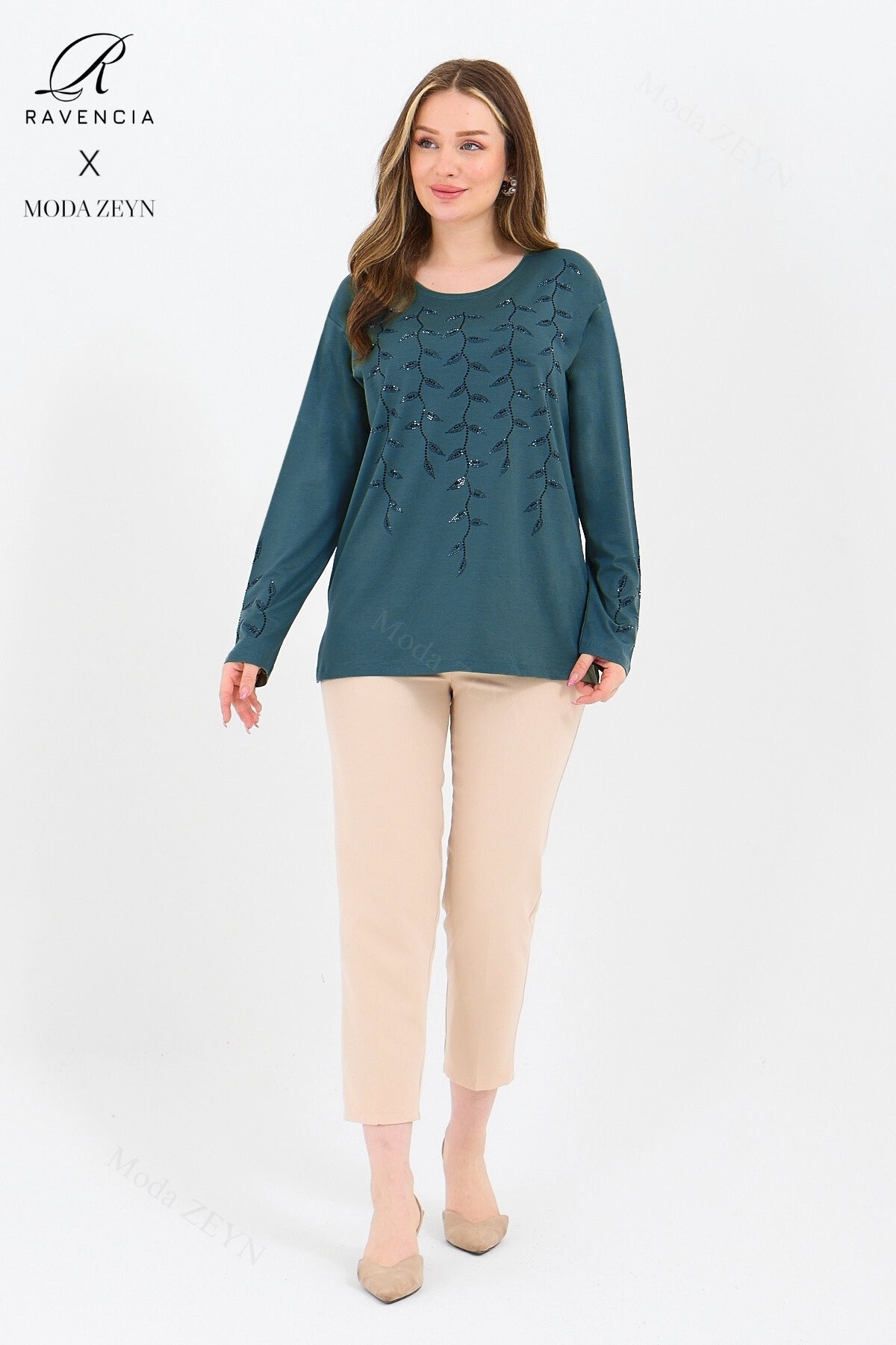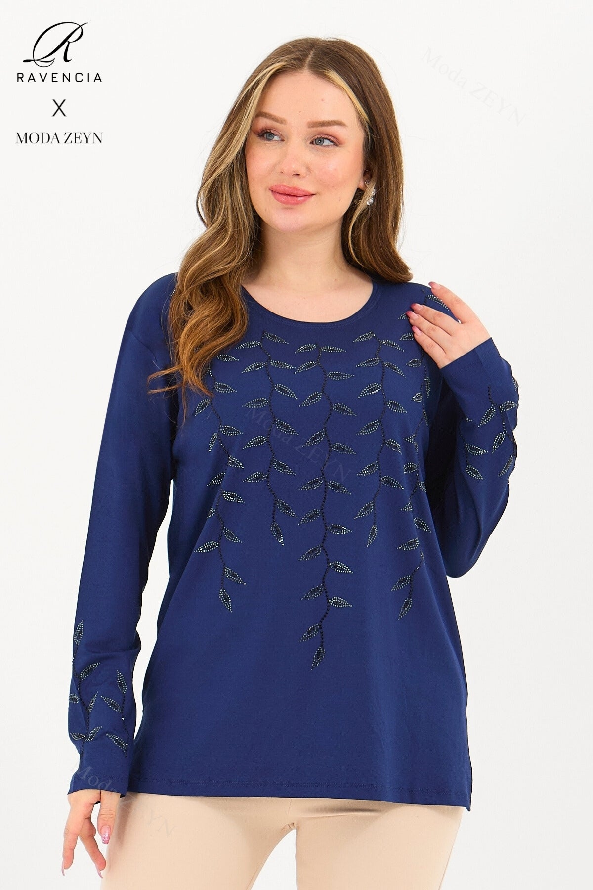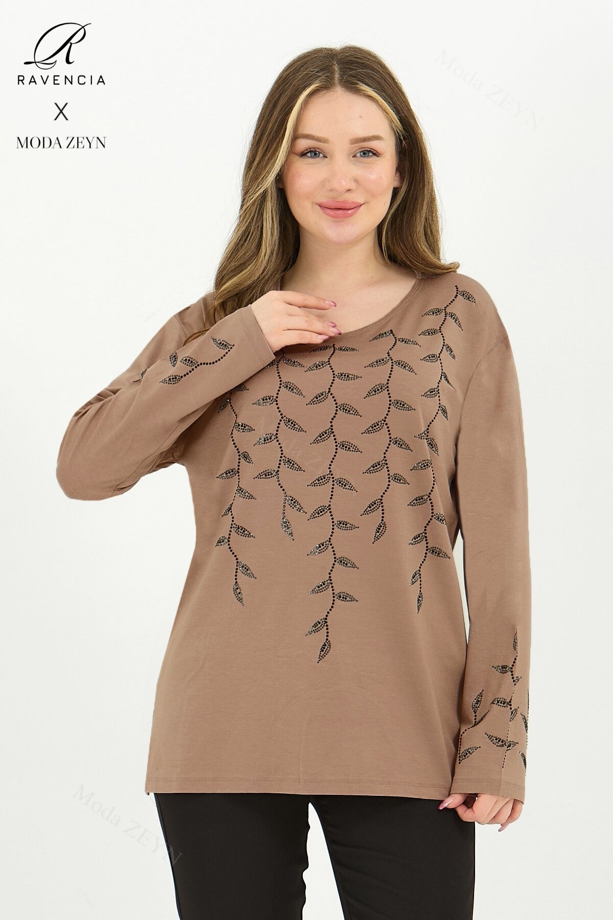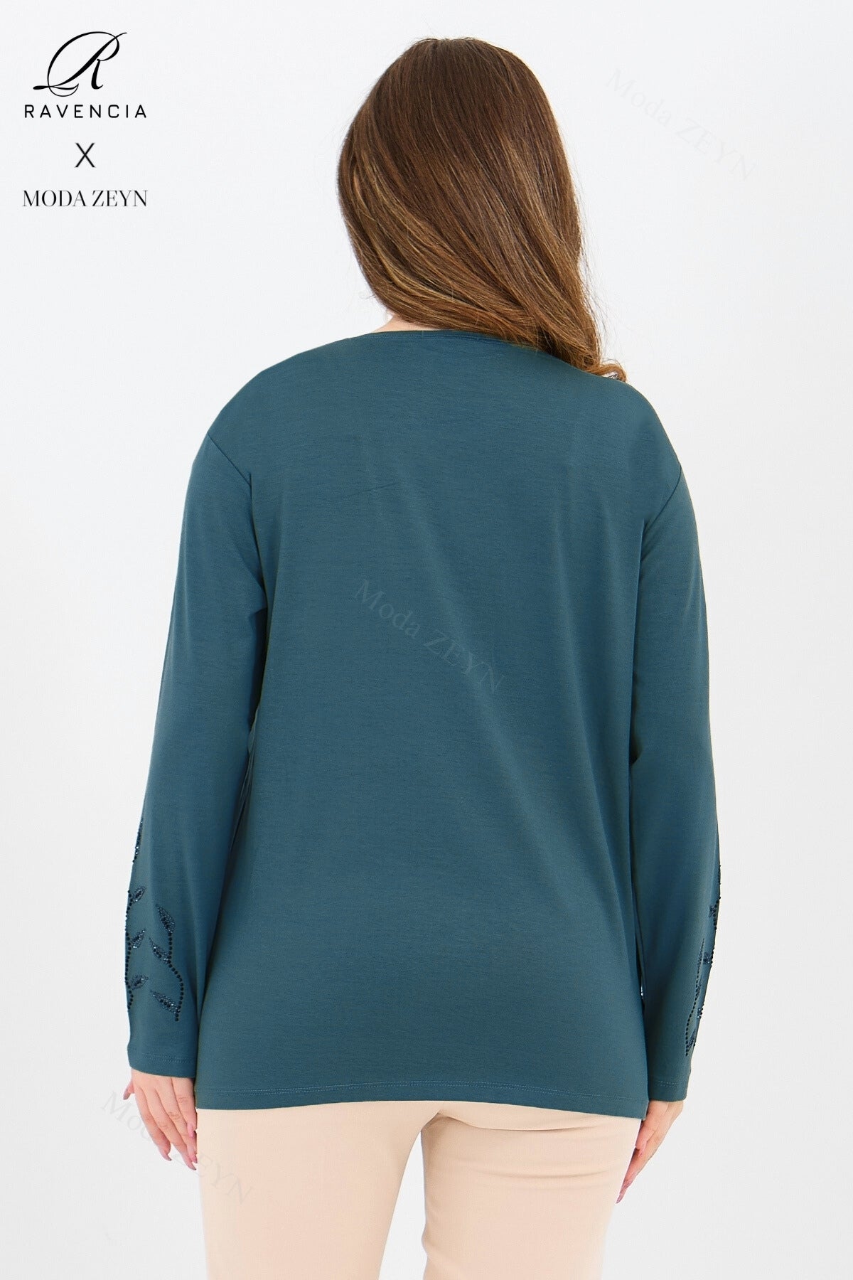 Gardırobunuzun en değerli parçası olmaya aday bu özel tasarım bluz, yüksek kaliteli viskon penye kumaşı ve göz alıcı taş işlemeleriyle şıklığı zahmetsizce yakalamanızı sağlar.