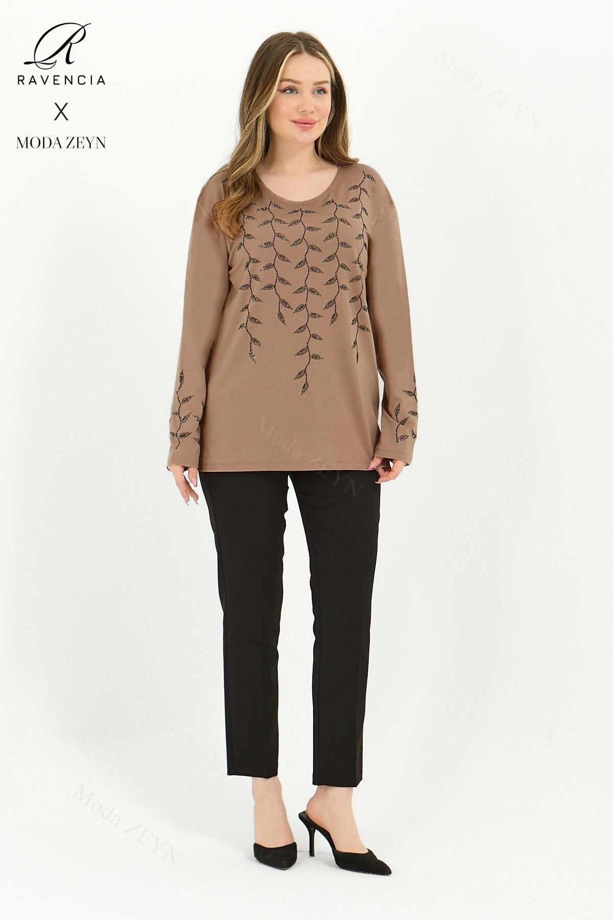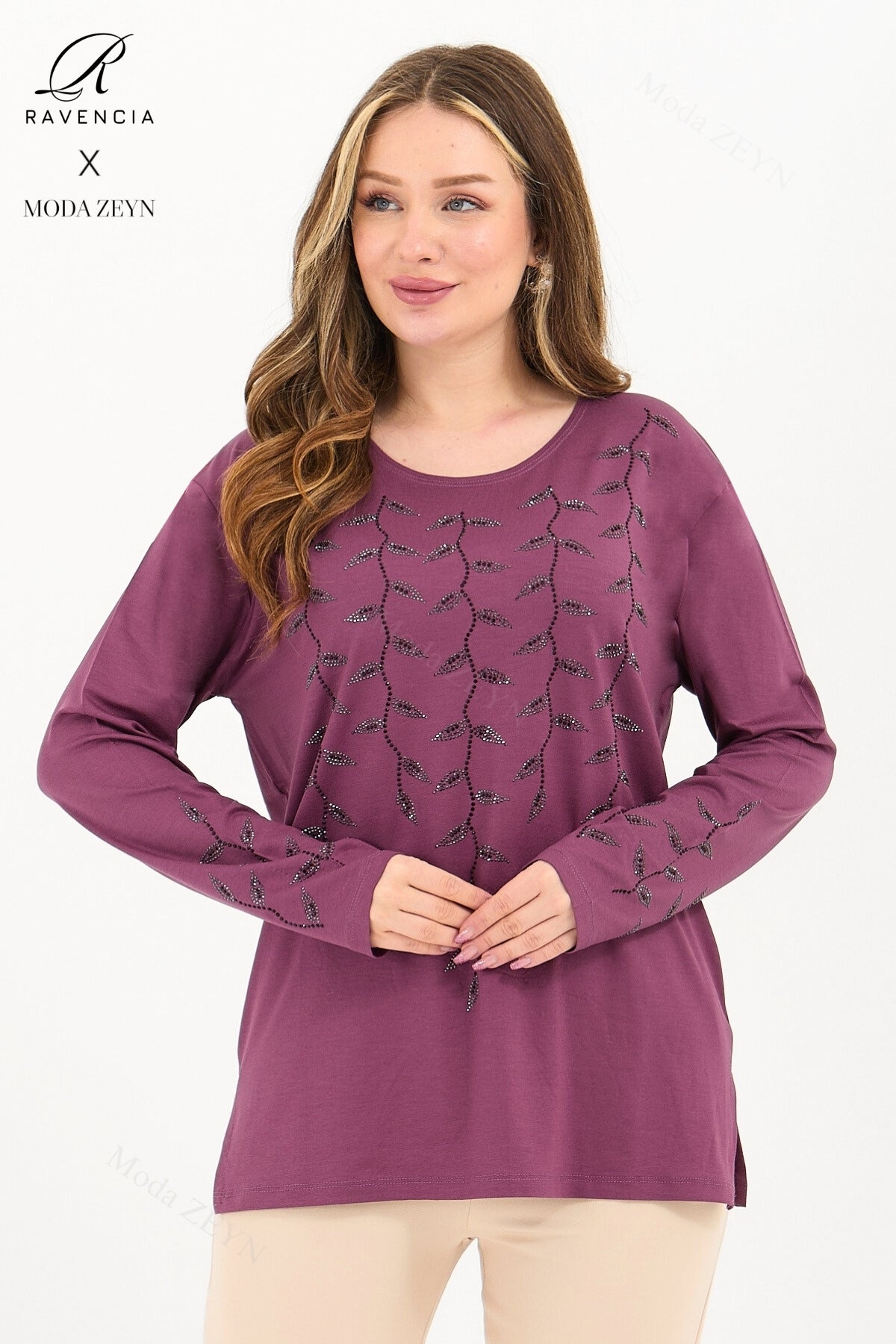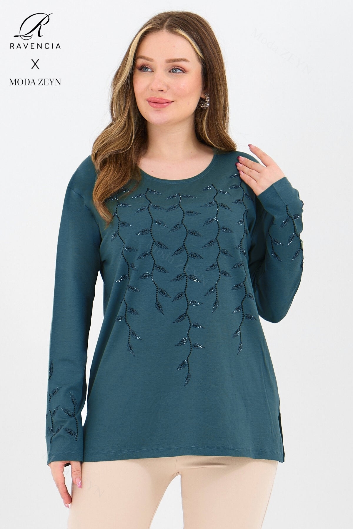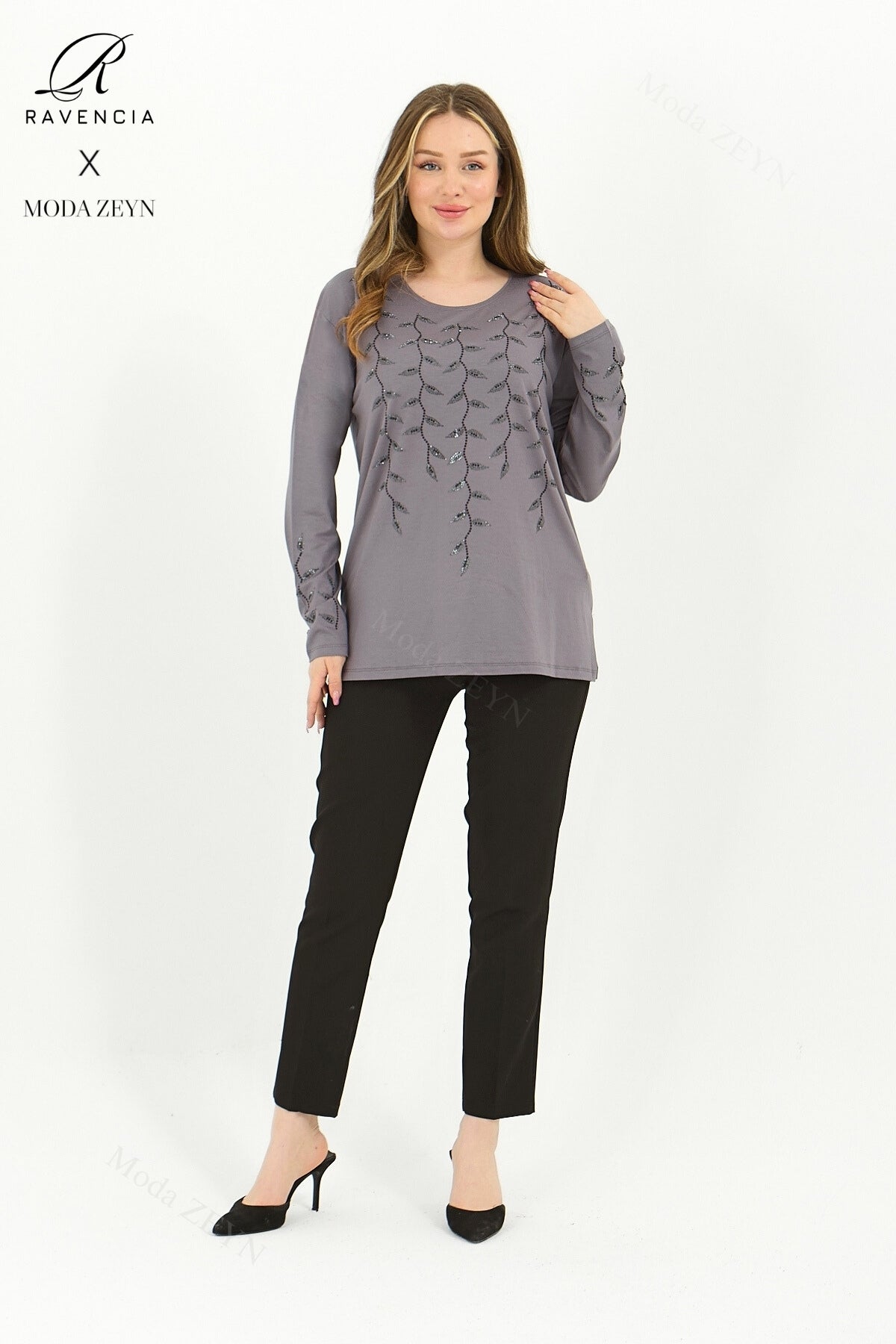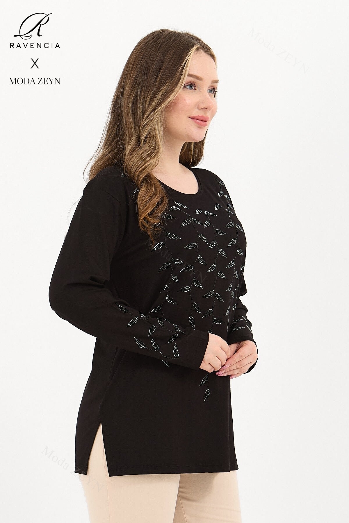 Gardırobunuzun en değerli parçası olmaya aday bu özel tasarım bluz, yüksek kaliteli viskon penye kumaşı ve göz alıcı taş işlemeleriyle şıklığı zahmetsizce yakalamanızı sağlar.