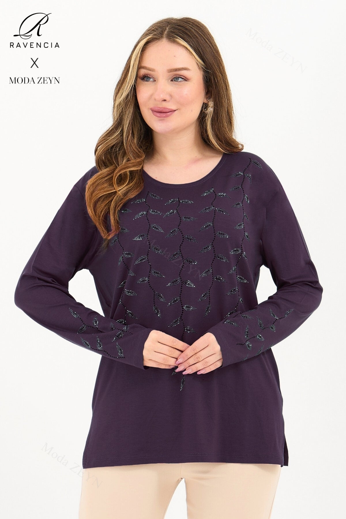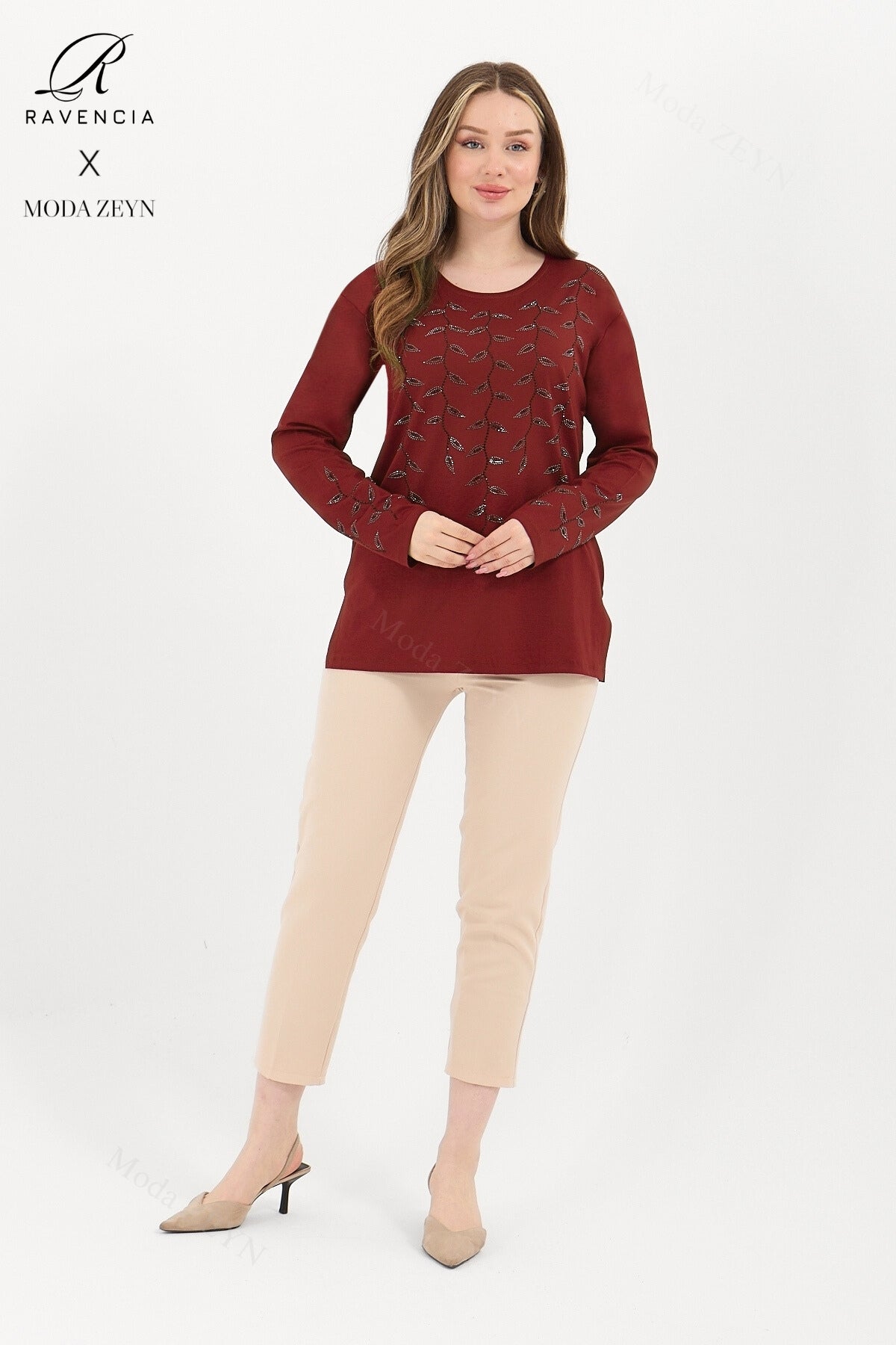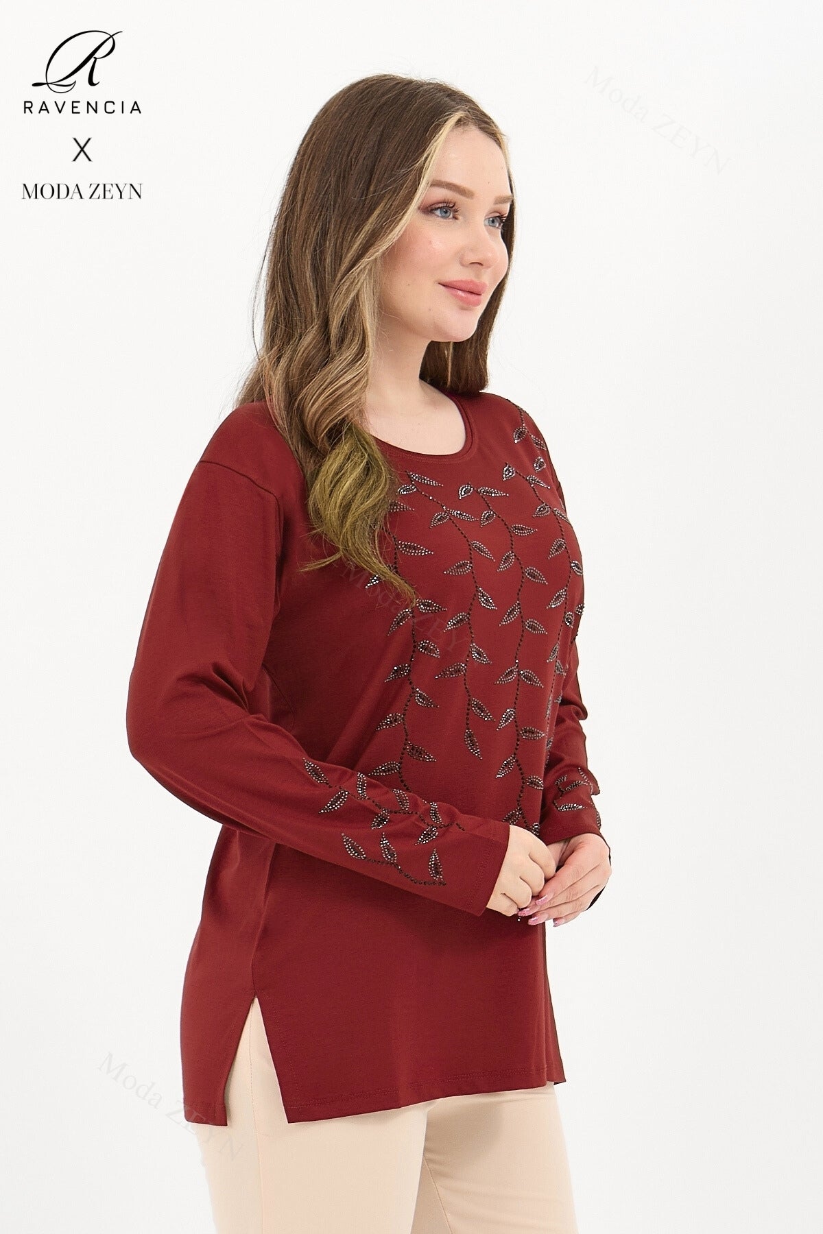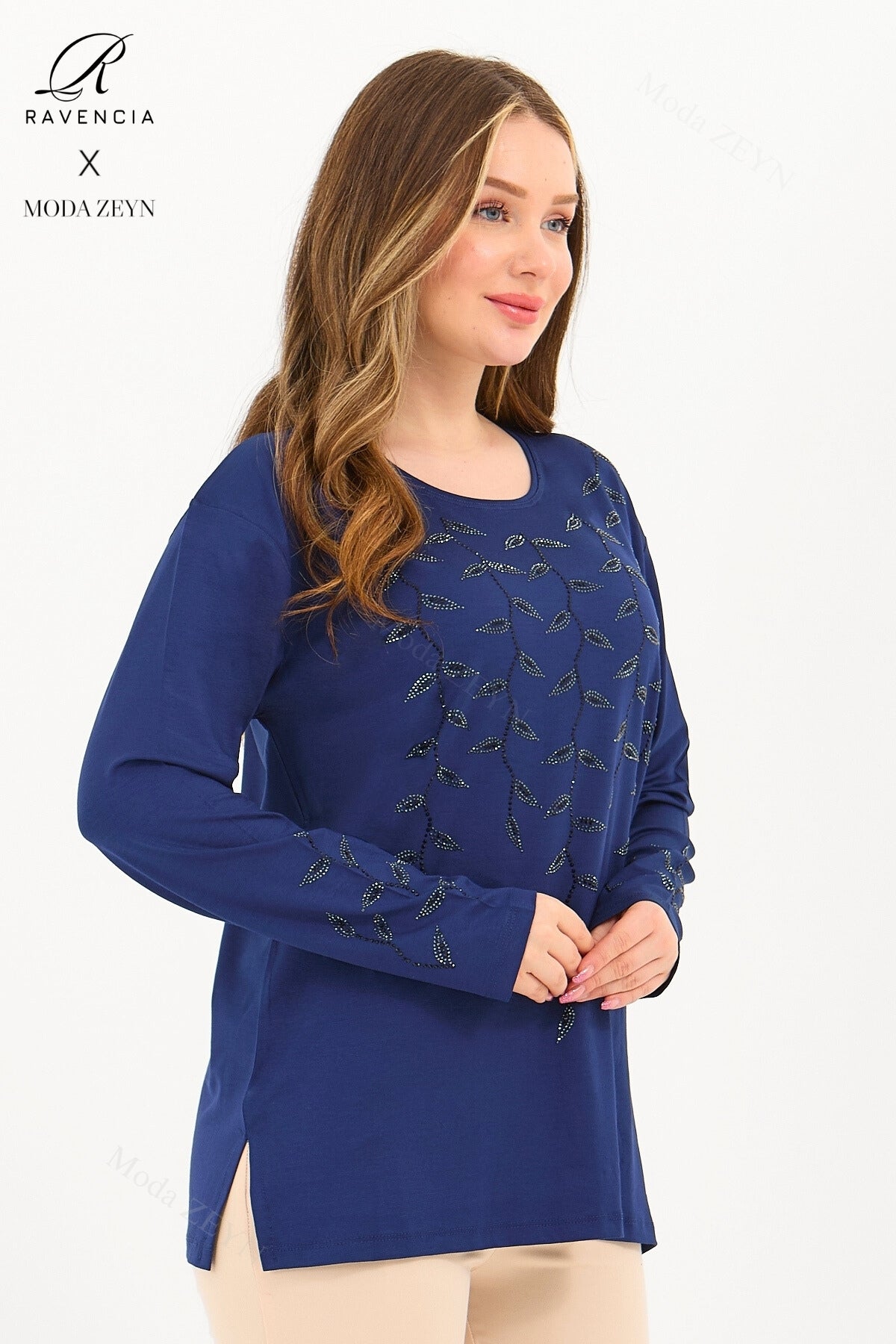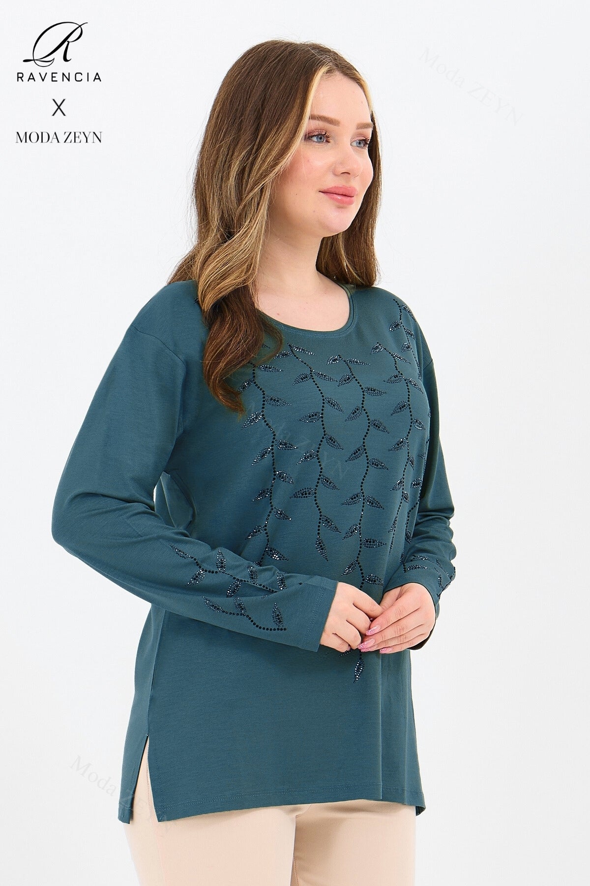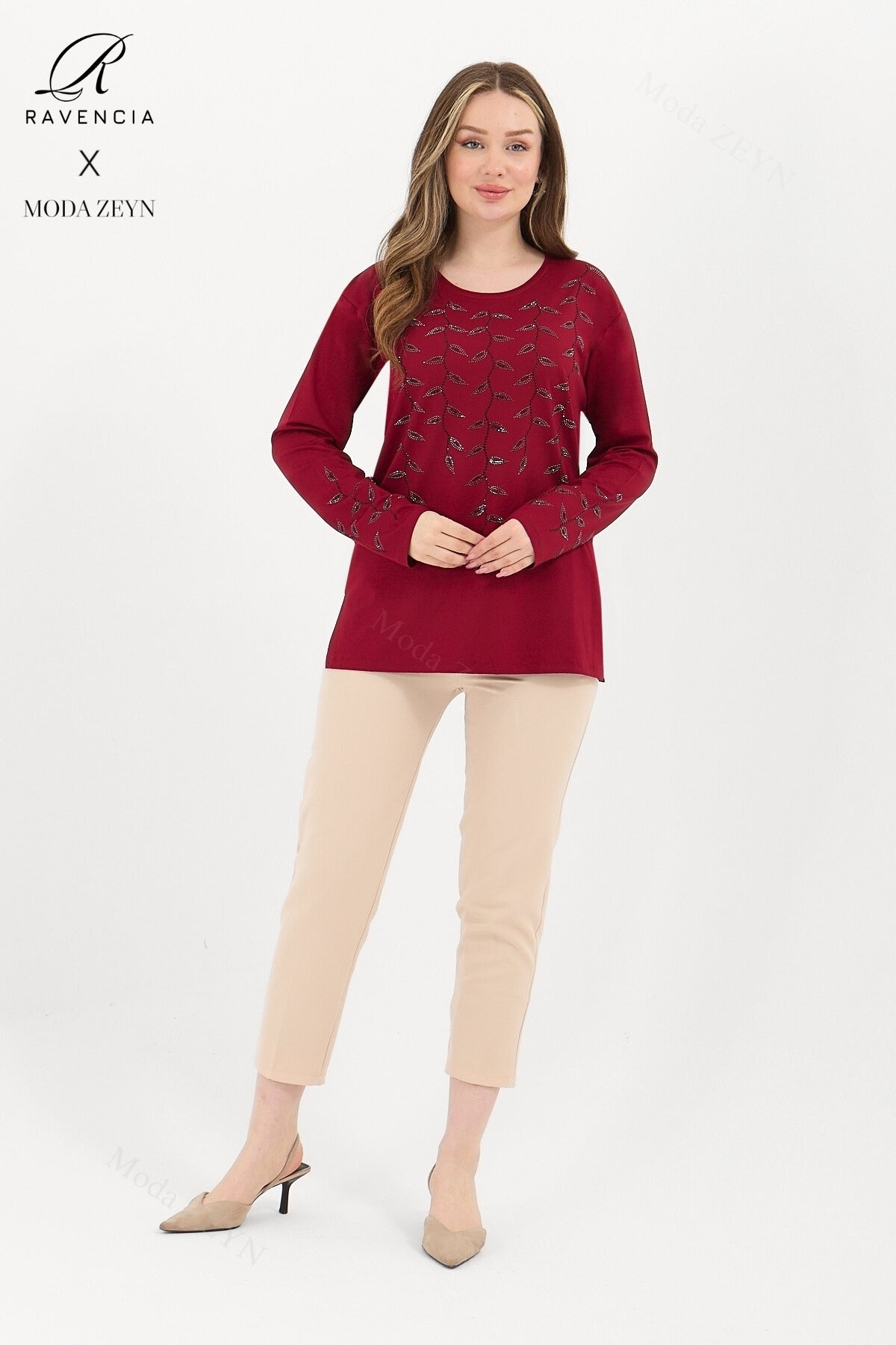 Gardırobunuzun en değerli parçası olmaya aday bu özel tasarım bluz, yüksek kaliteli viskon penye kumaşı ve göz alıcı taş işlemeleriyle şıklığı zahmetsizce yakalamanızı sağlar.