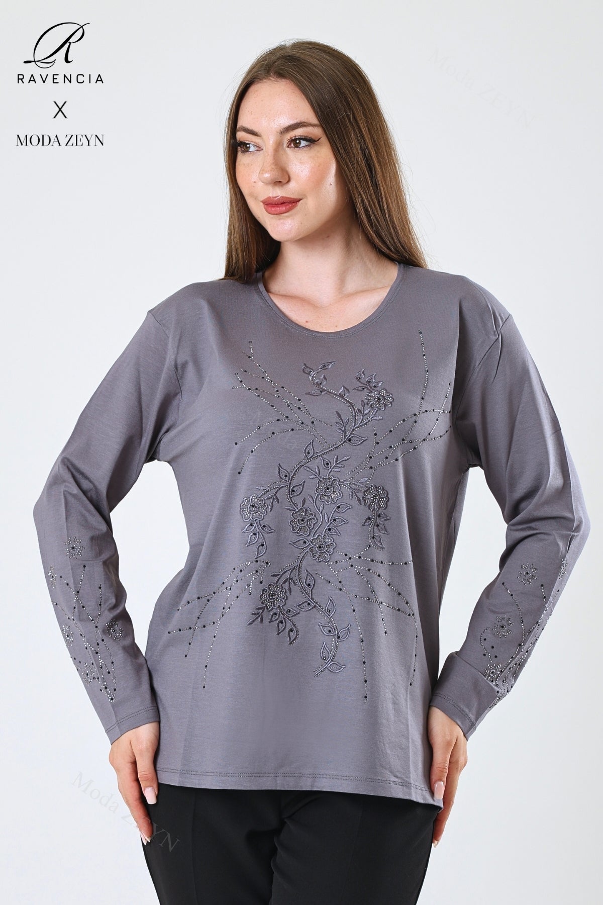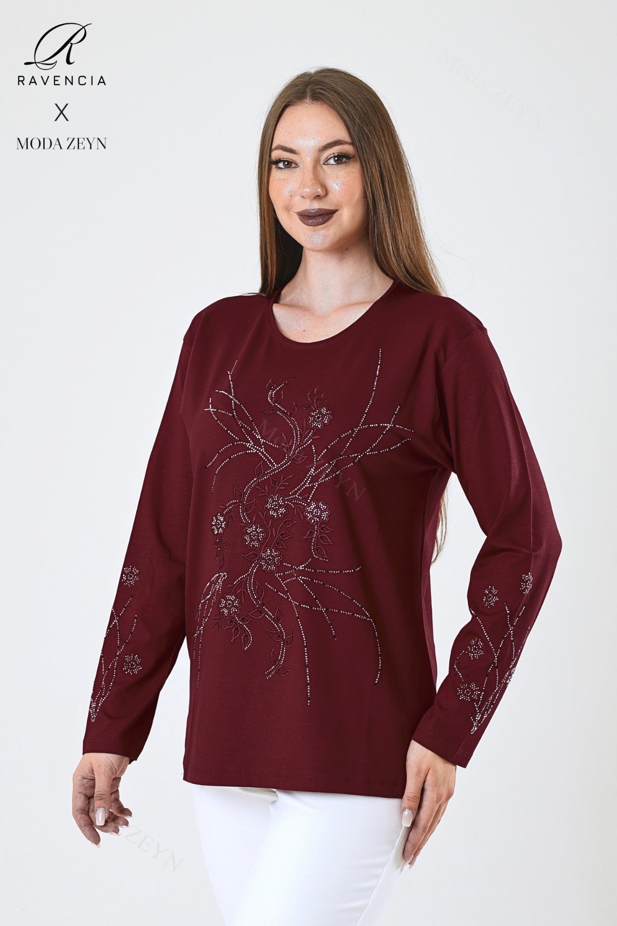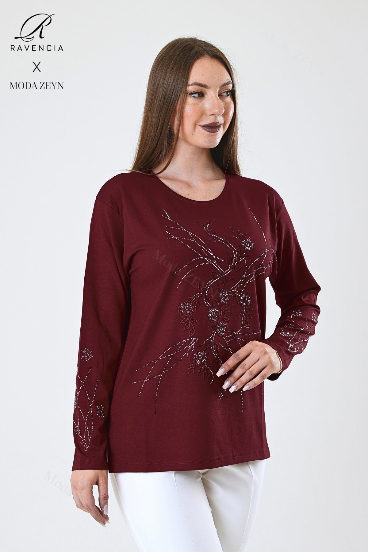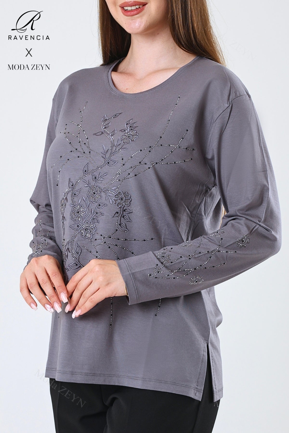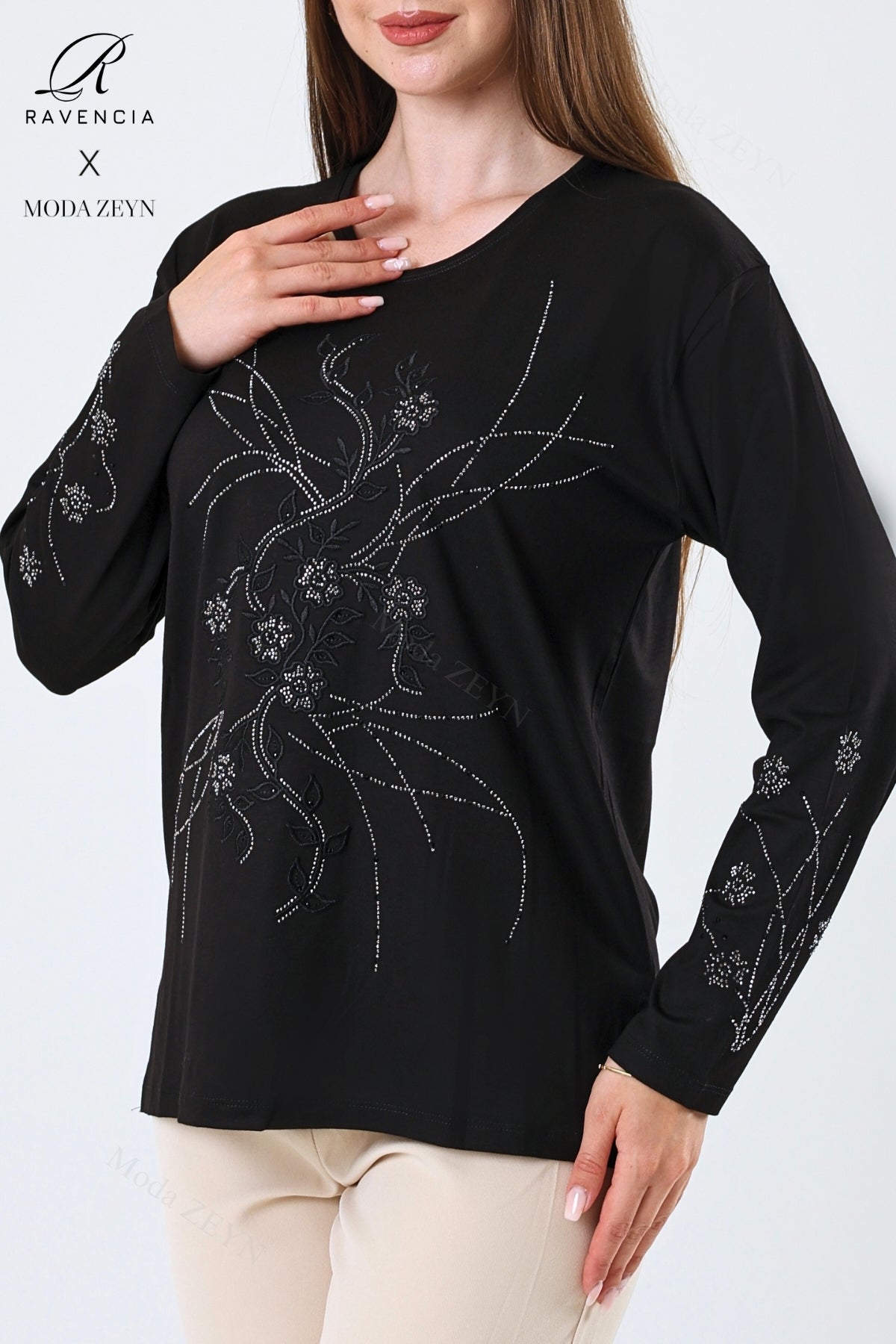 Gardırobunuzun en değerli parçası olmaya aday bu özel tasarım bluz, yüksek kaliteli viskon penye kumaşı ve göz alıcı taş işlemeleriyle şıklığı zahmetsizce yakalamanızı sağlar.