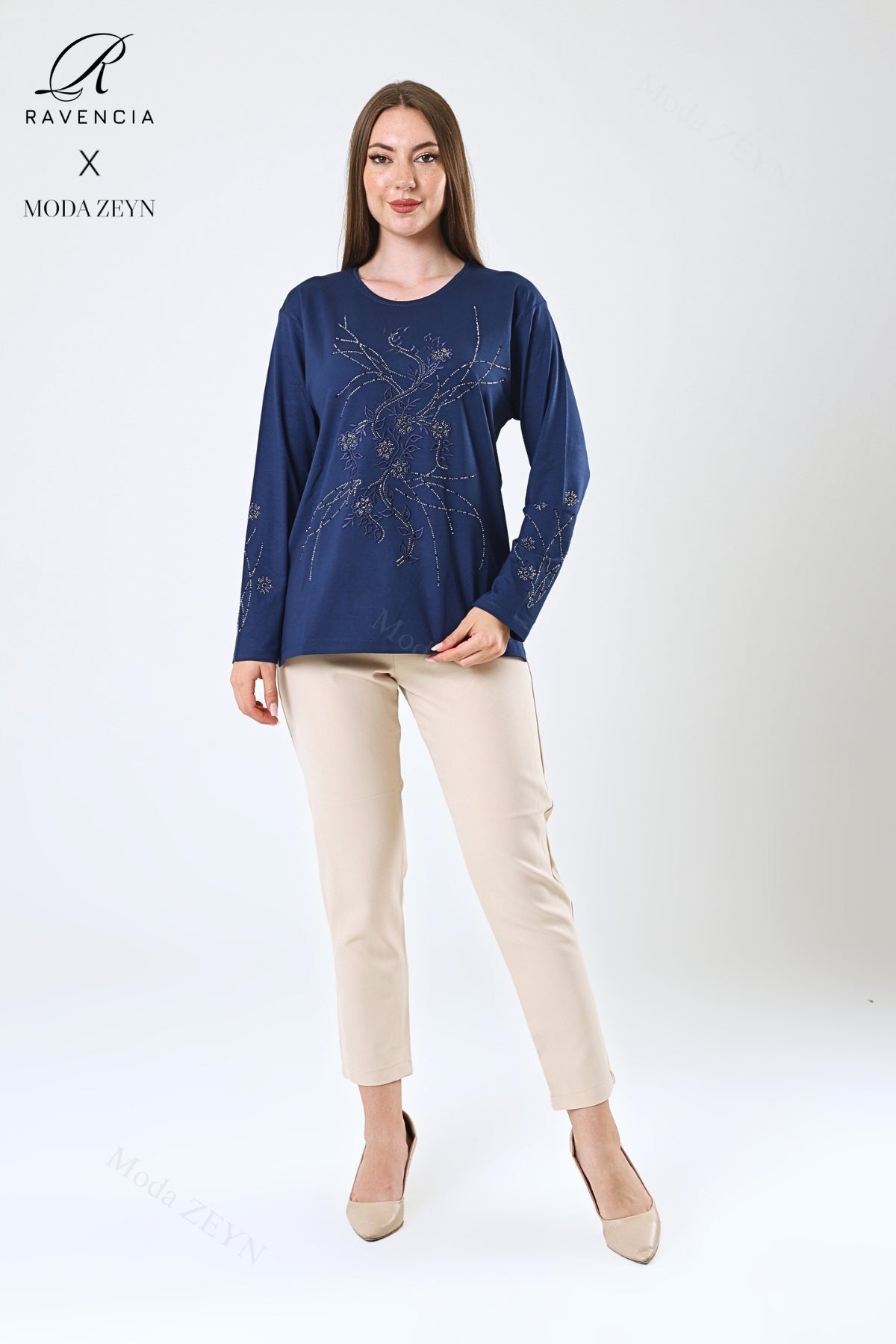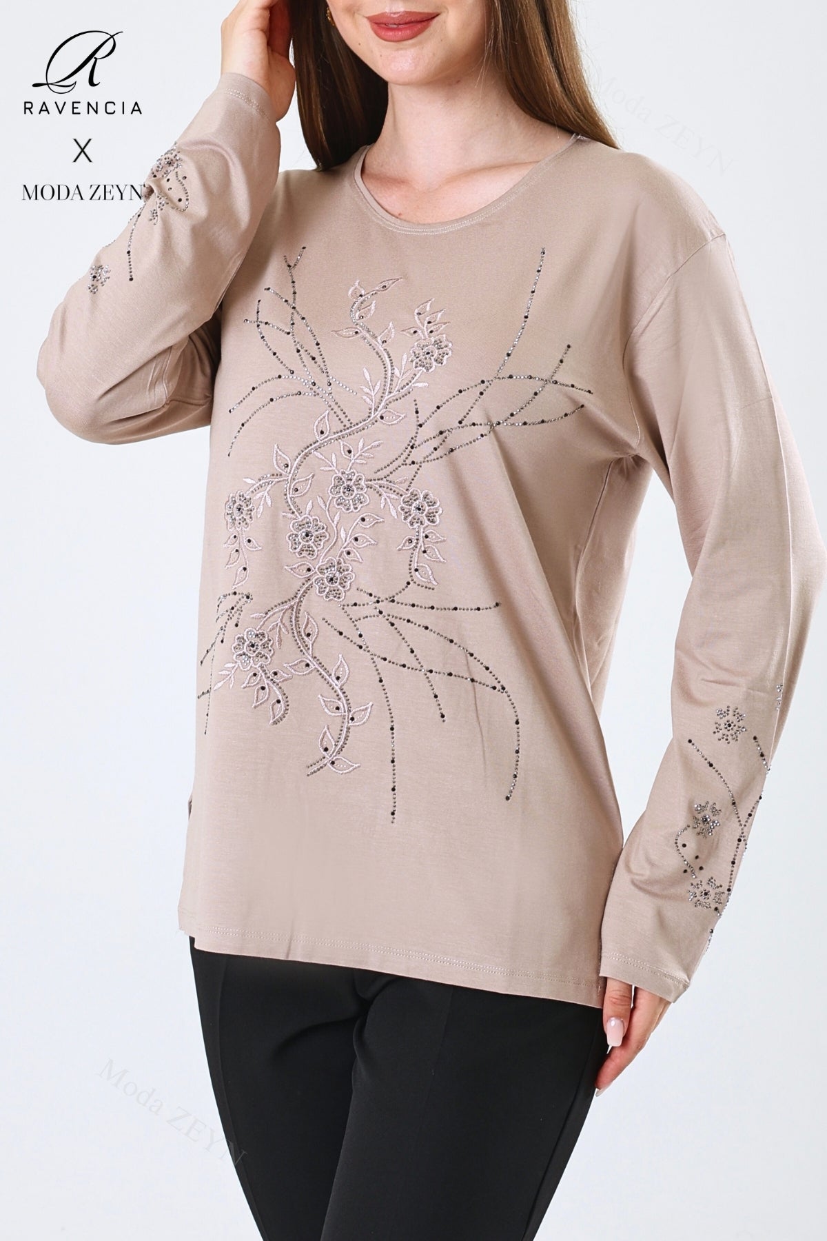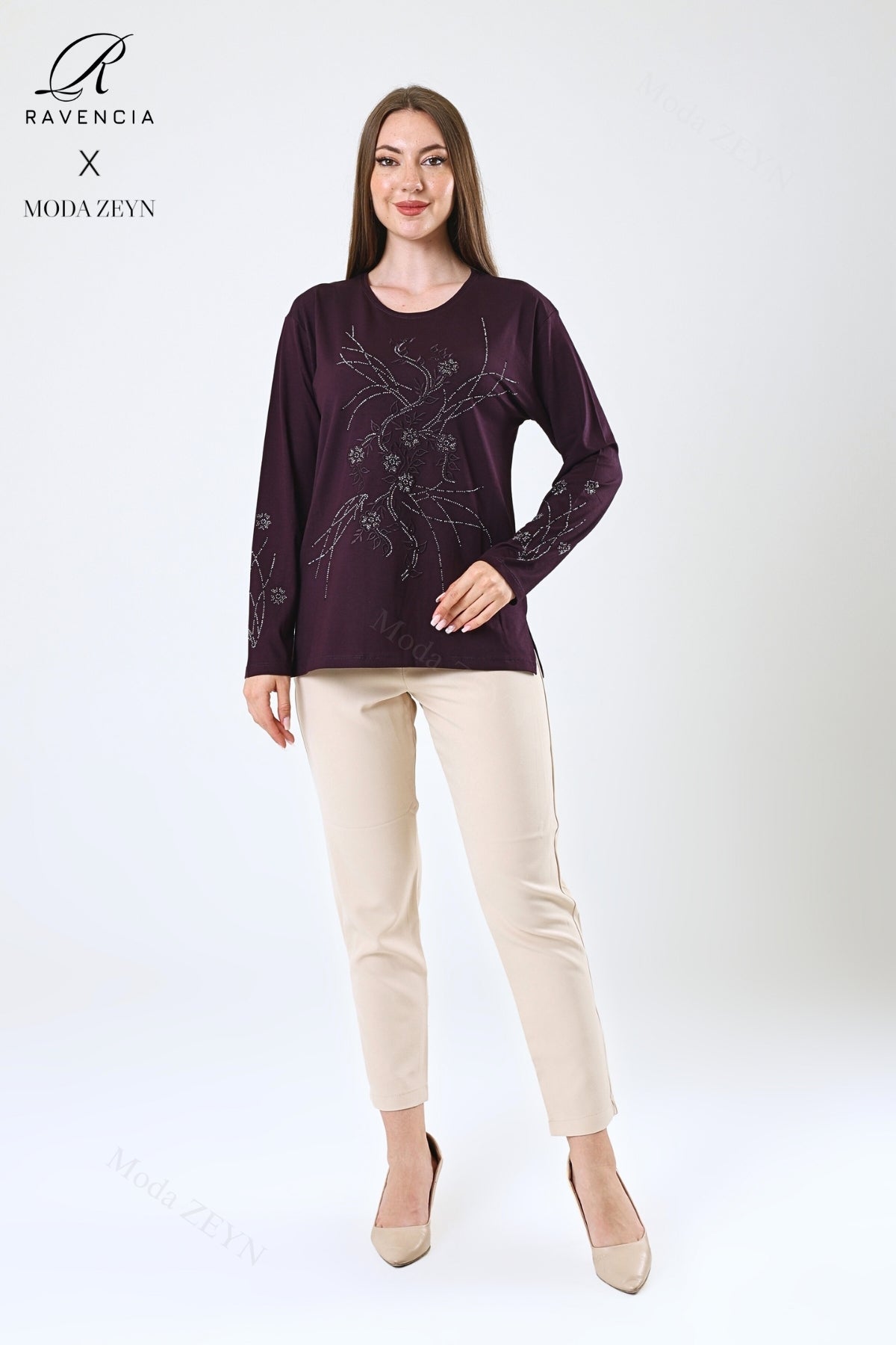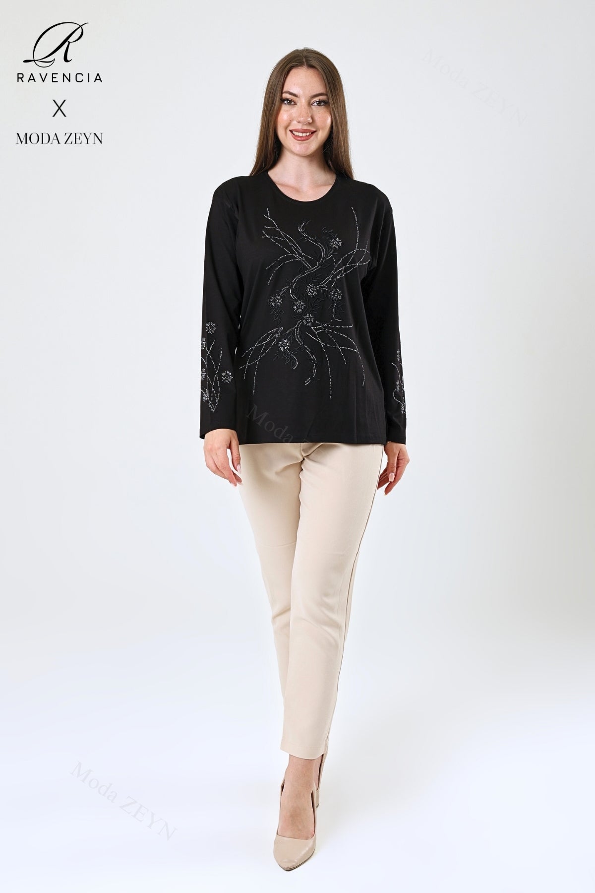 Gardırobunuzun en değerli parçası olmaya aday bu özel tasarım bluz, yüksek kaliteli viskon penye kumaşı ve göz alıcı taş işlemeleriyle şıklığı zahmetsizce yakalamanızı sağlar.