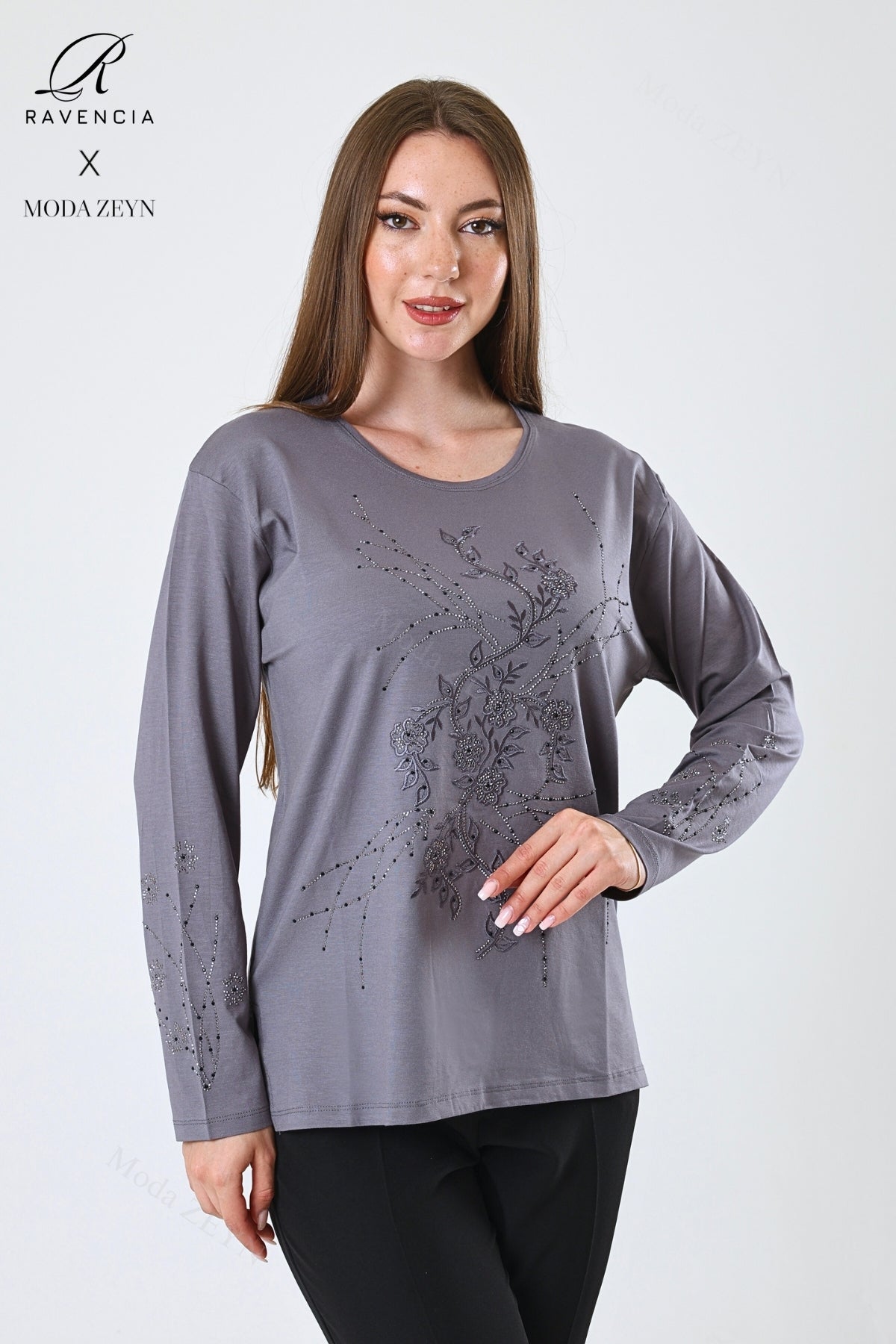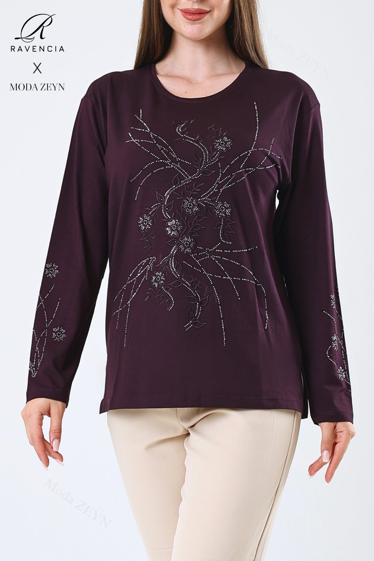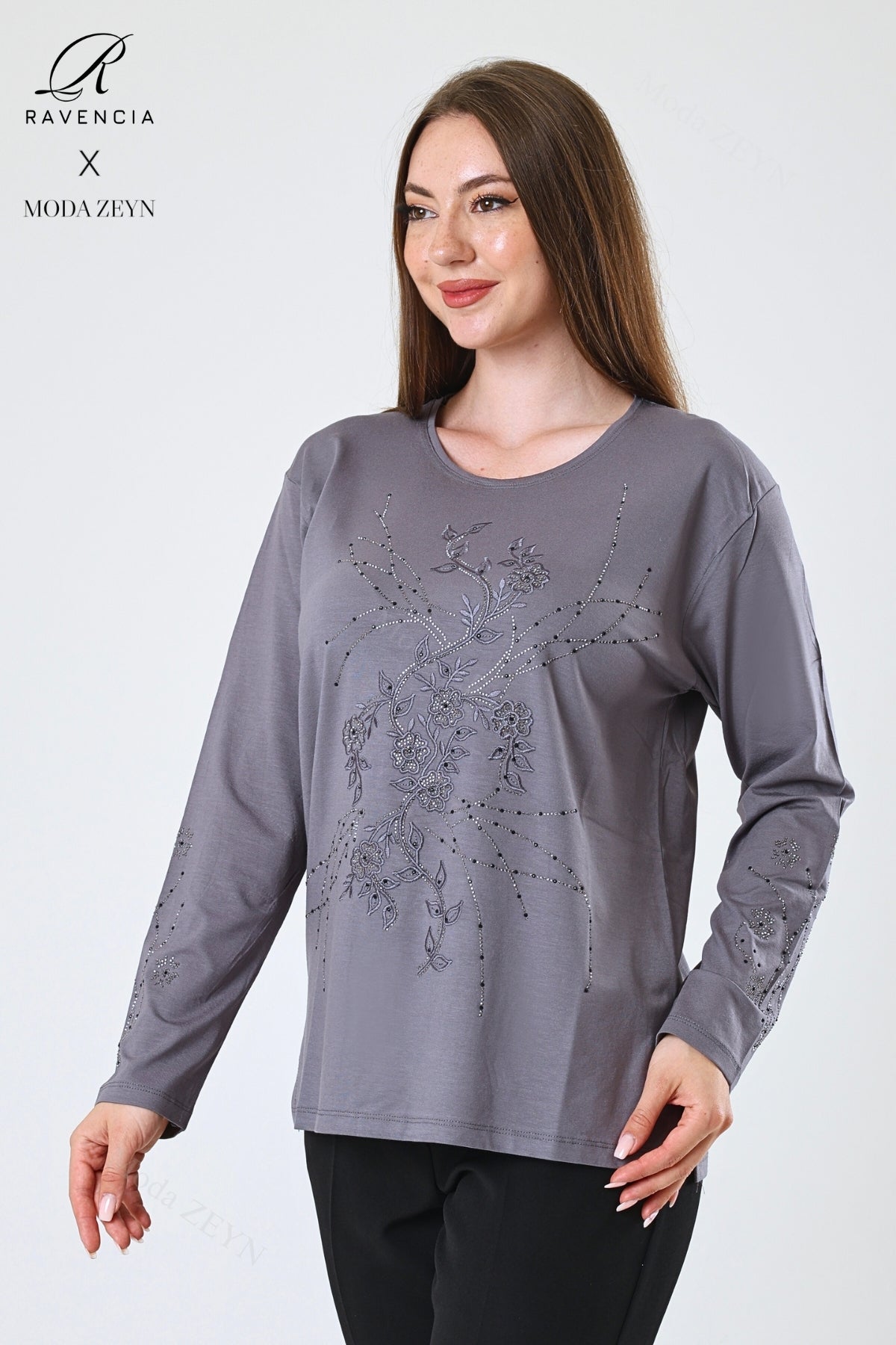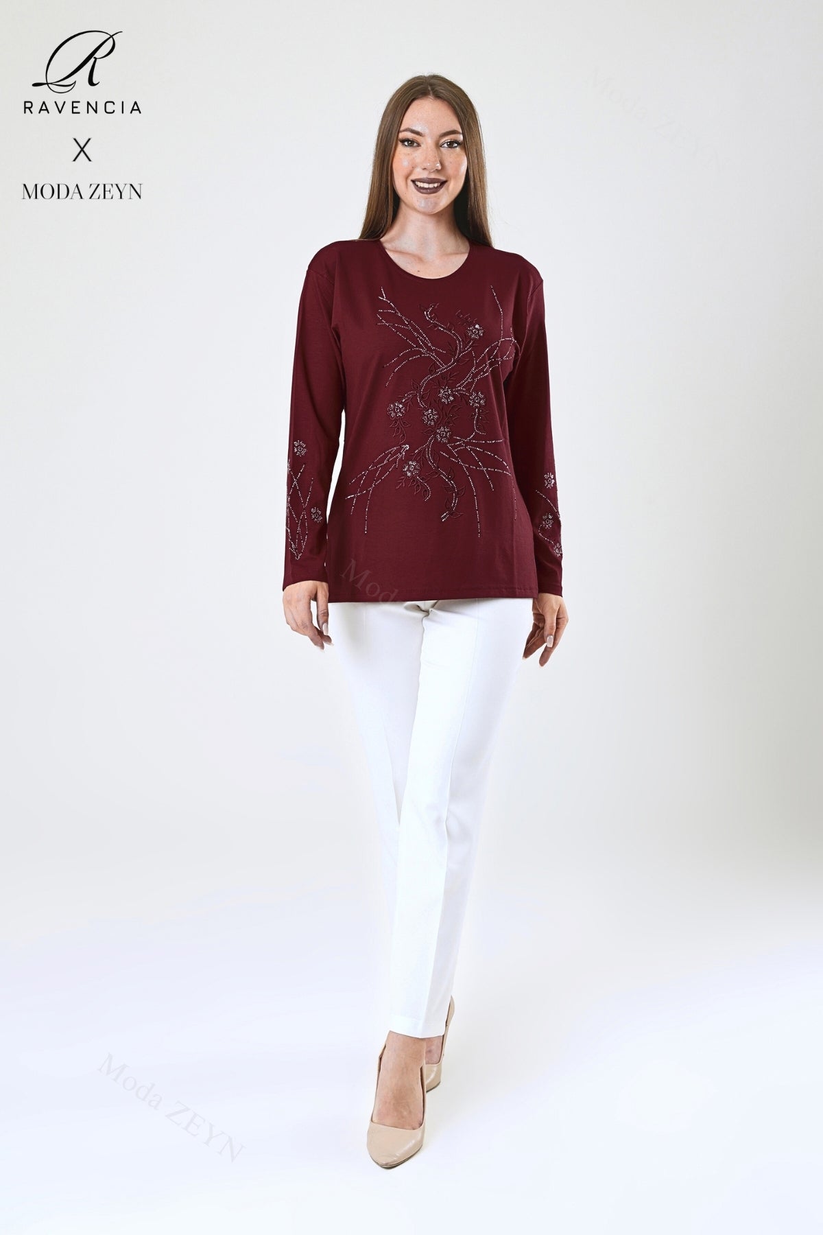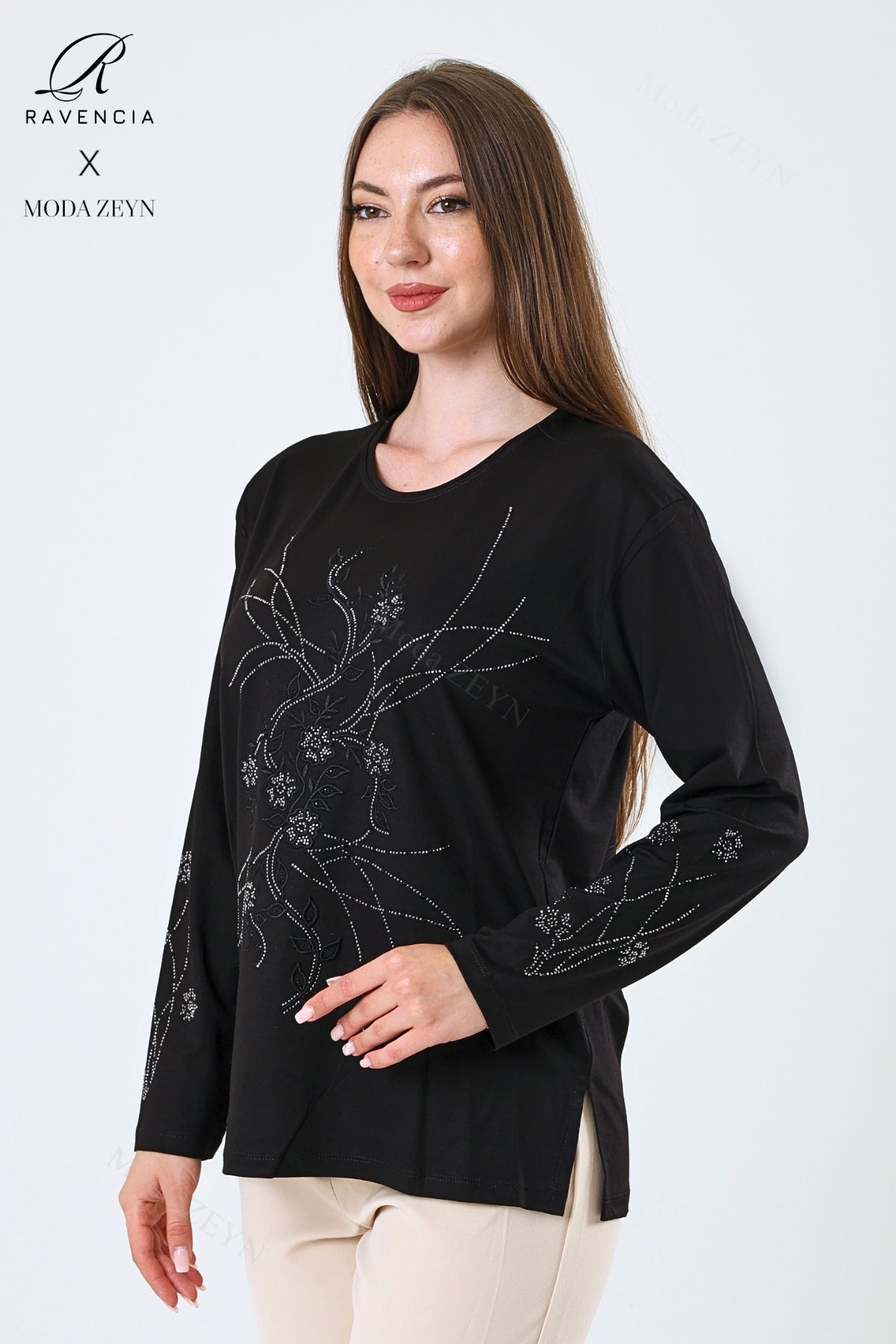 Gardırobunuzun en değerli parçası olmaya aday bu özel tasarım bluz, yüksek kaliteli viskon penye kumaşı ve göz alıcı taş işlemeleriyle şıklığı zahmetsizce yakalamanızı sağlar.