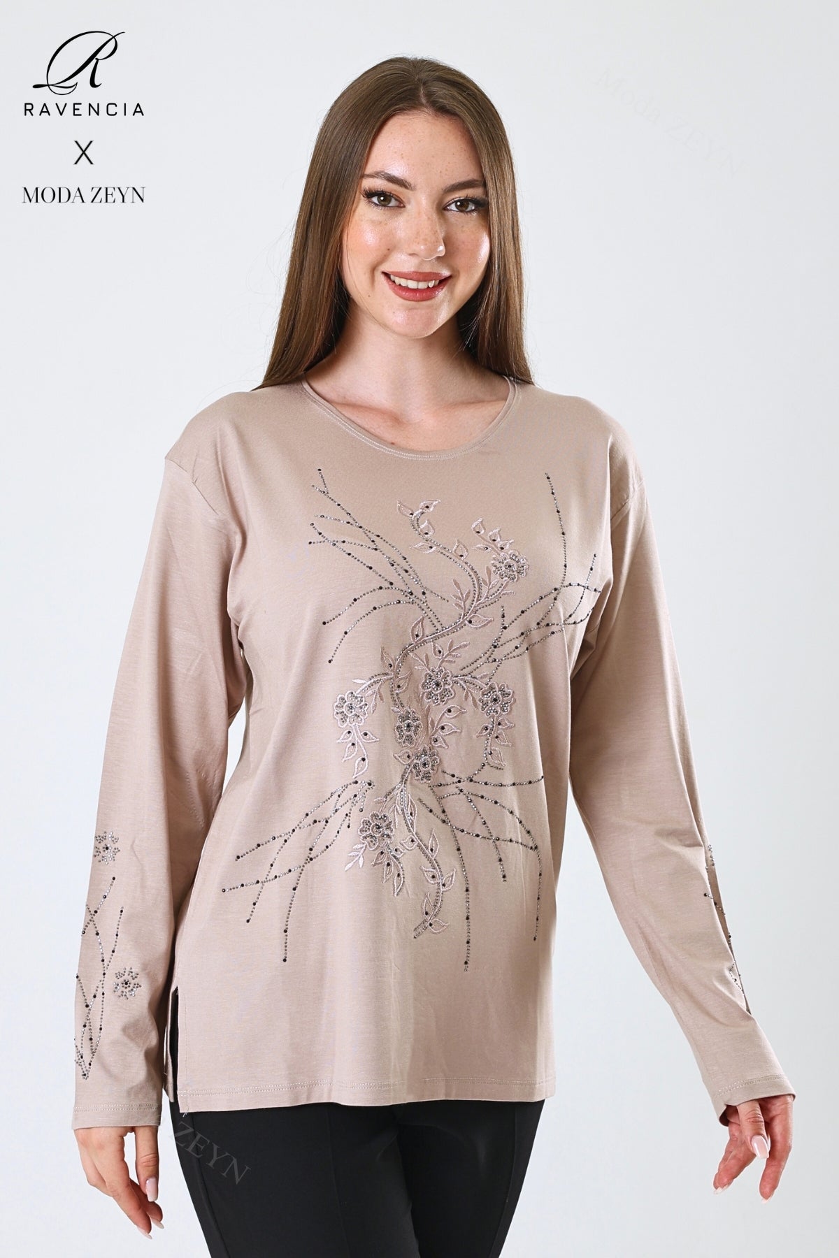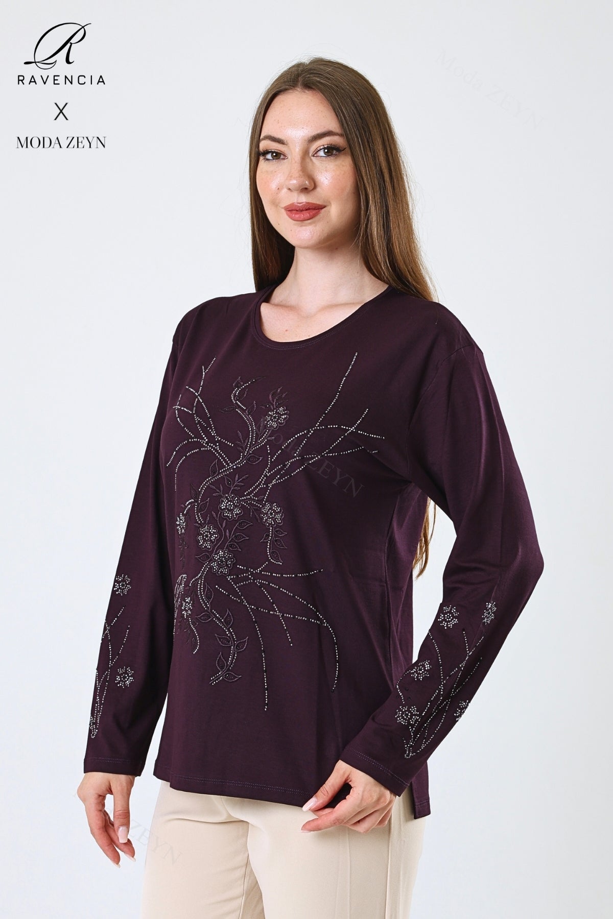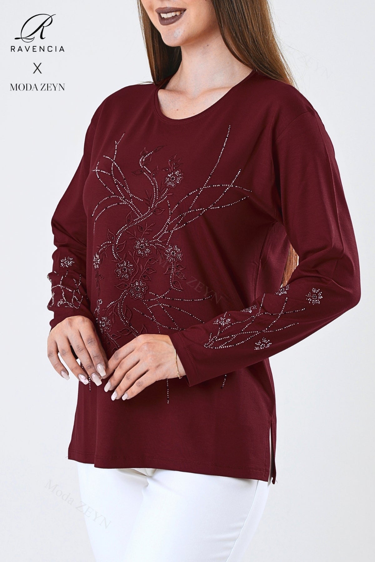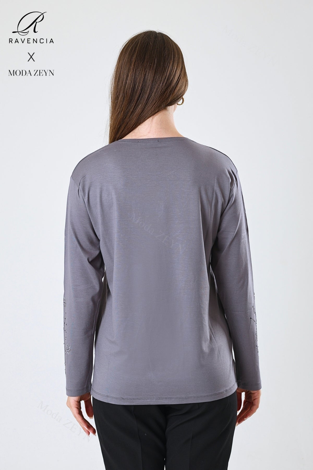 Gardırobunuzun en değerli parçası olmaya aday bu özel tasarım bluz, yüksek kaliteli viskon penye kumaşı ve göz alıcı taş işlemeleriyle şıklığı zahmetsizce yakalamanızı sağlar.