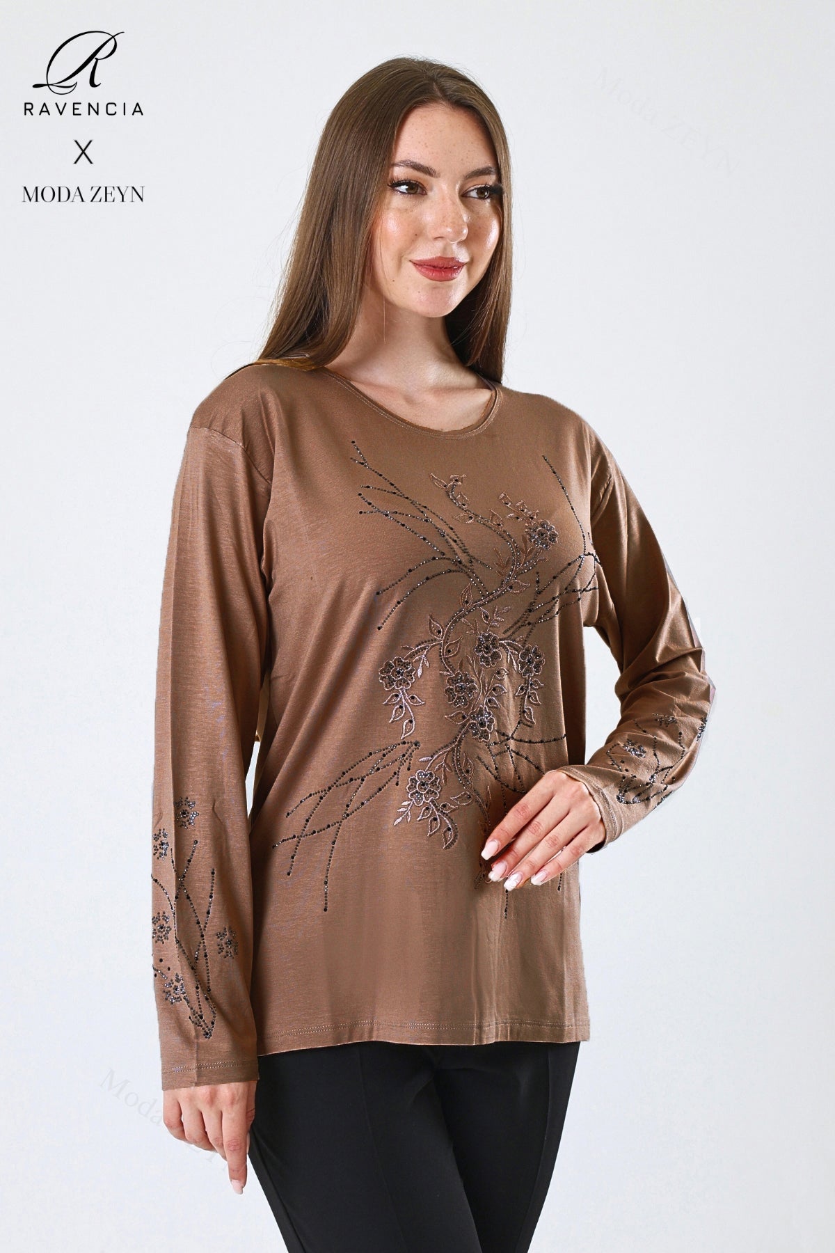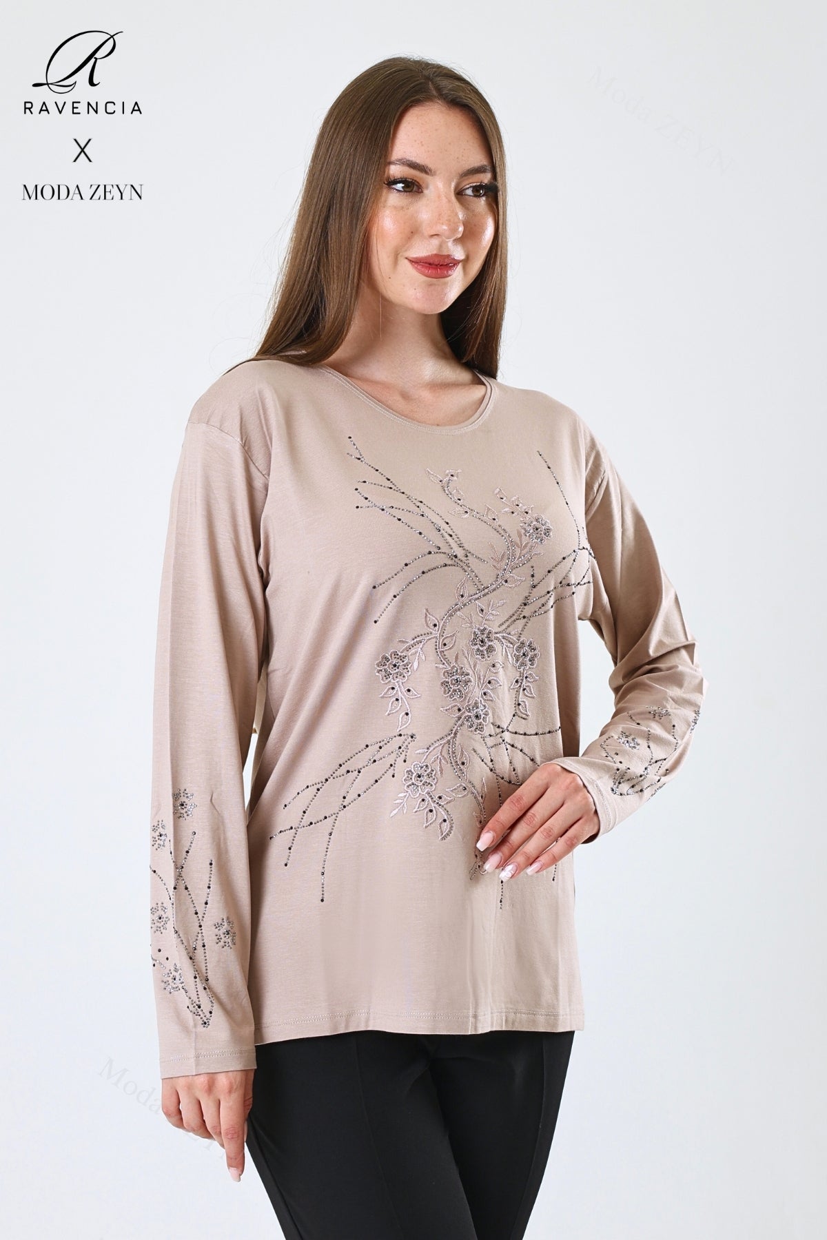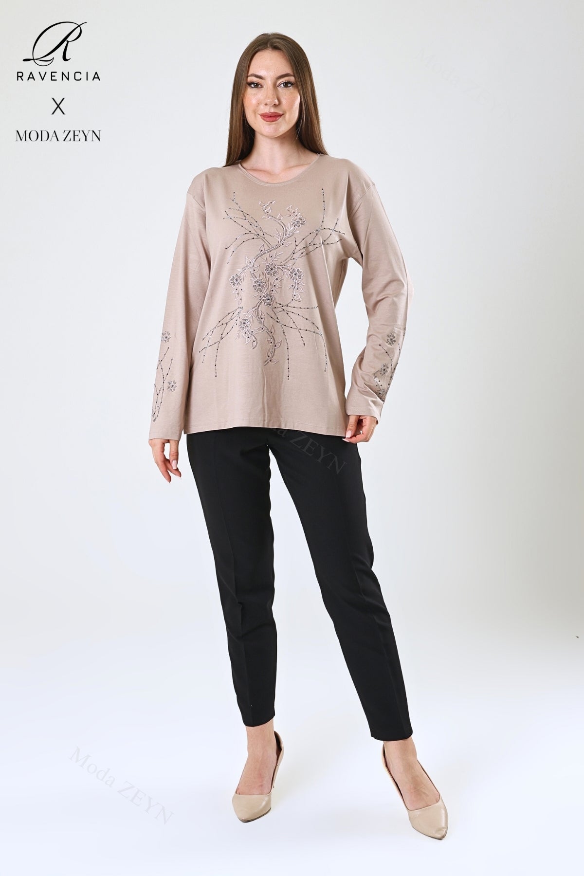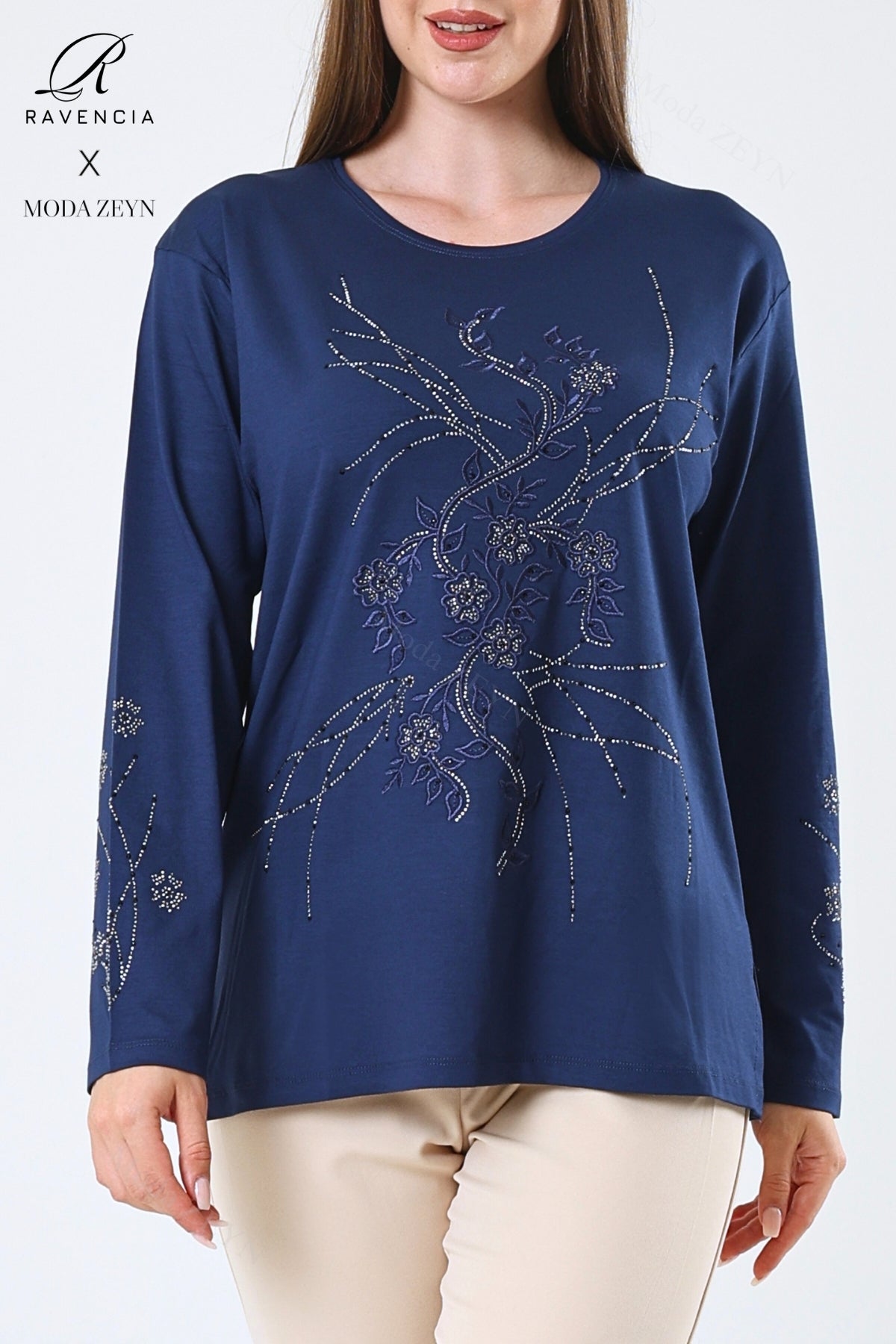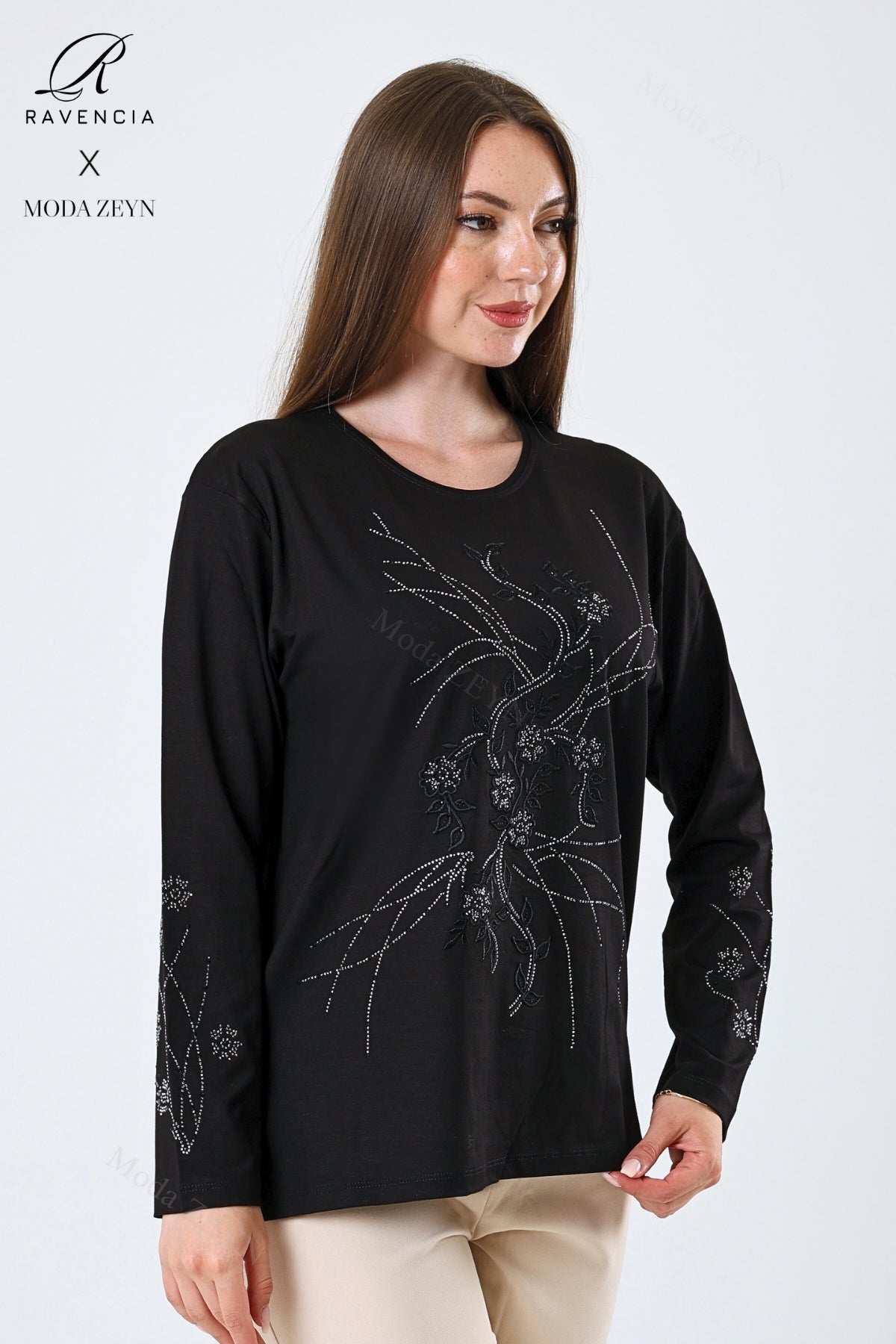 Gardırobunuzun en değerli parçası olmaya aday bu özel tasarım bluz, yüksek kaliteli viskon penye kumaşı ve göz alıcı taş işlemeleriyle şıklığı zahmetsizce yakalamanızı sağlar.