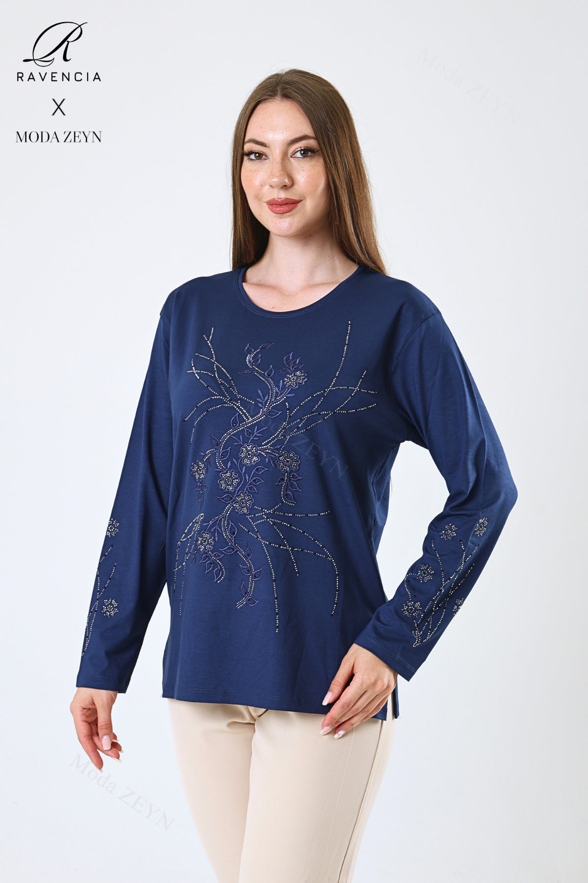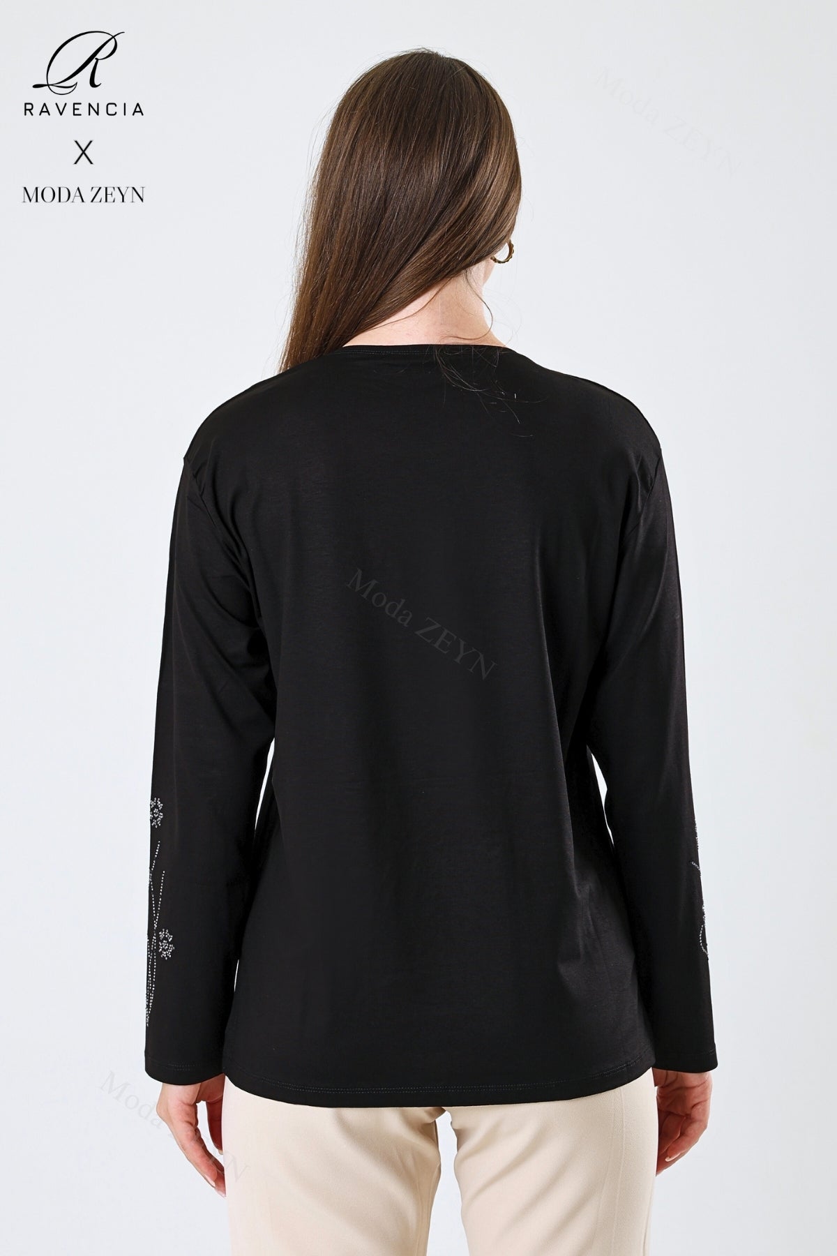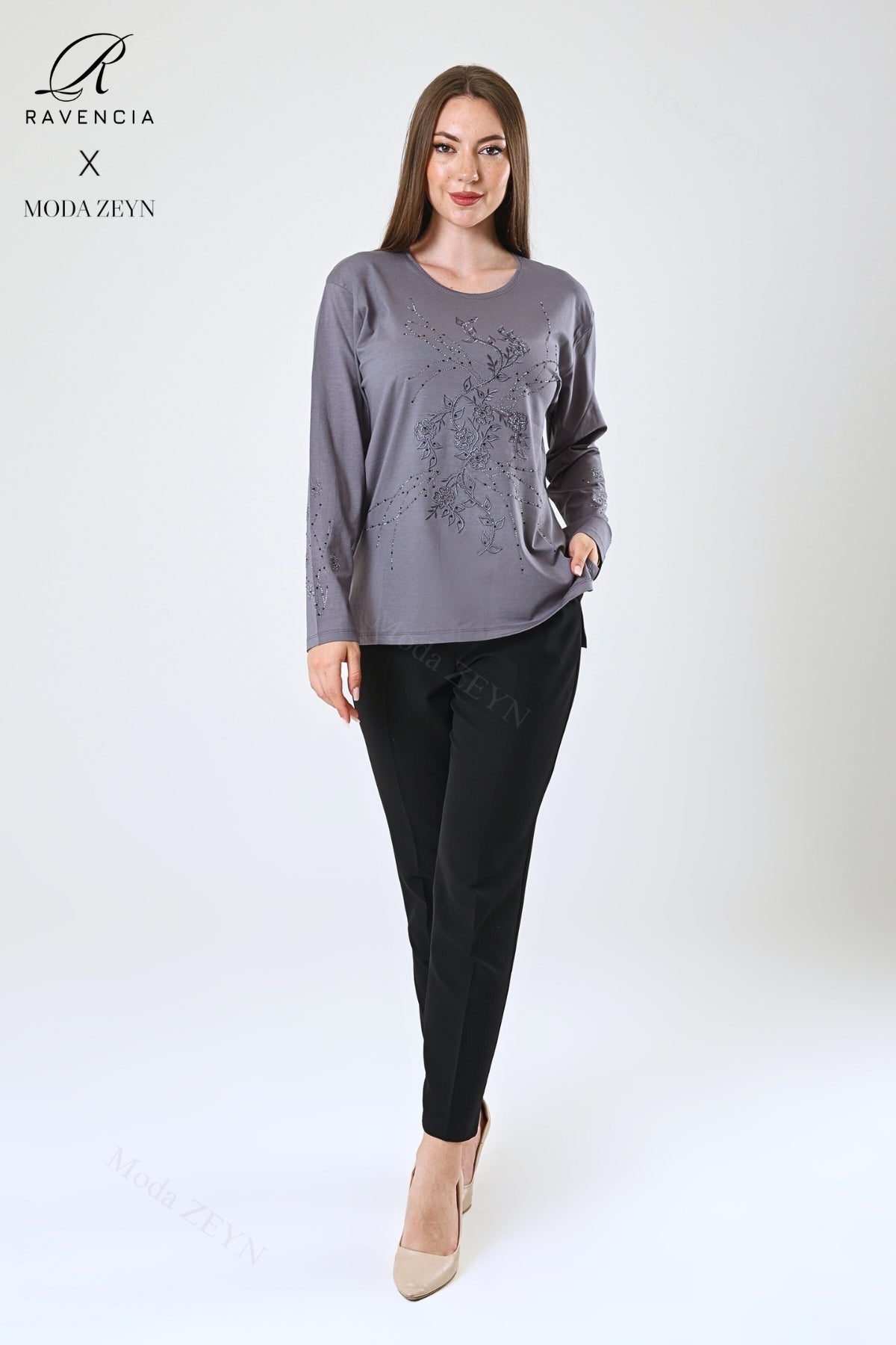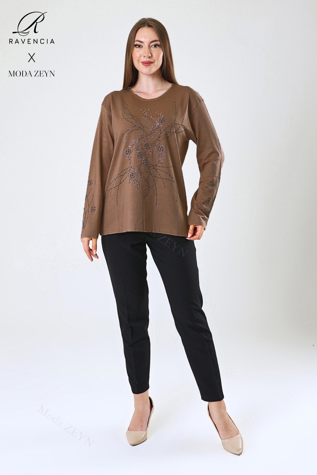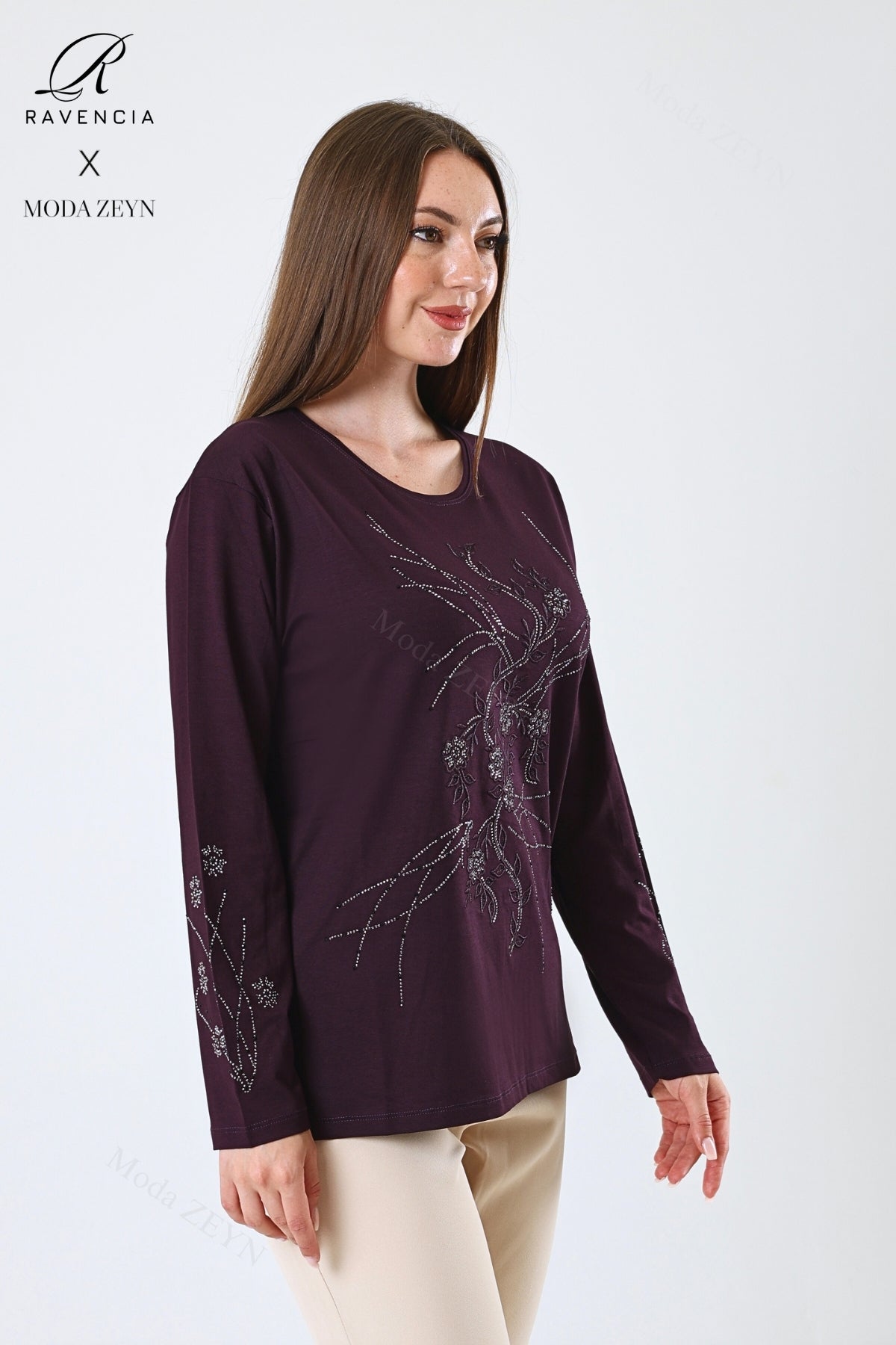 Gardırobunuzun en değerli parçası olmaya aday bu özel tasarım bluz, yüksek kaliteli viskon penye kumaşı ve göz alıcı taş işlemeleriyle şıklığı zahmetsizce yakalamanızı sağlar.