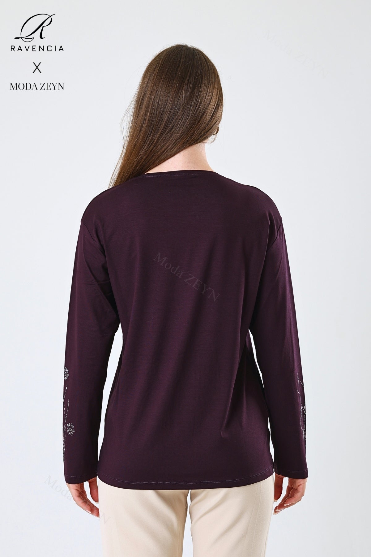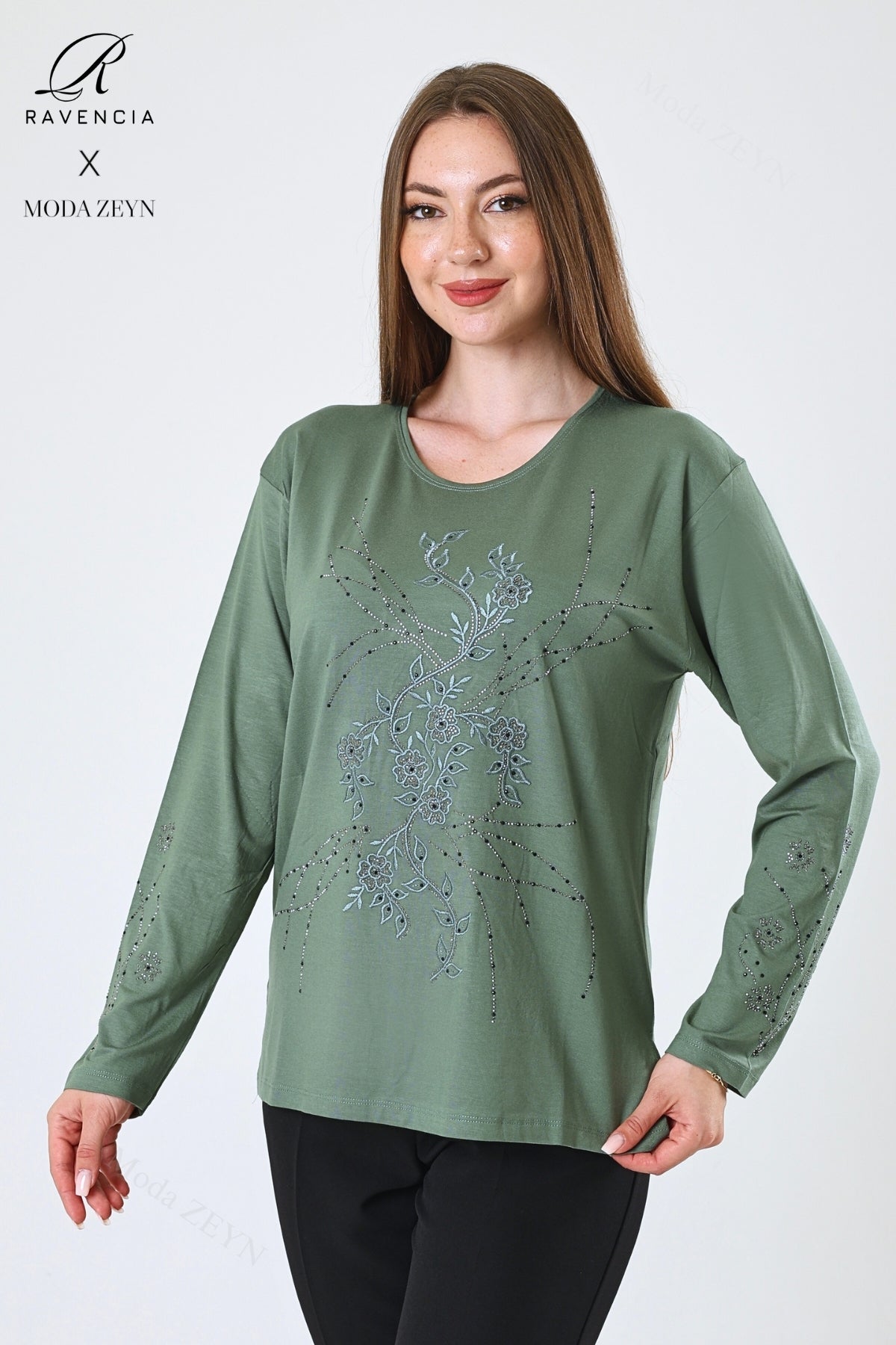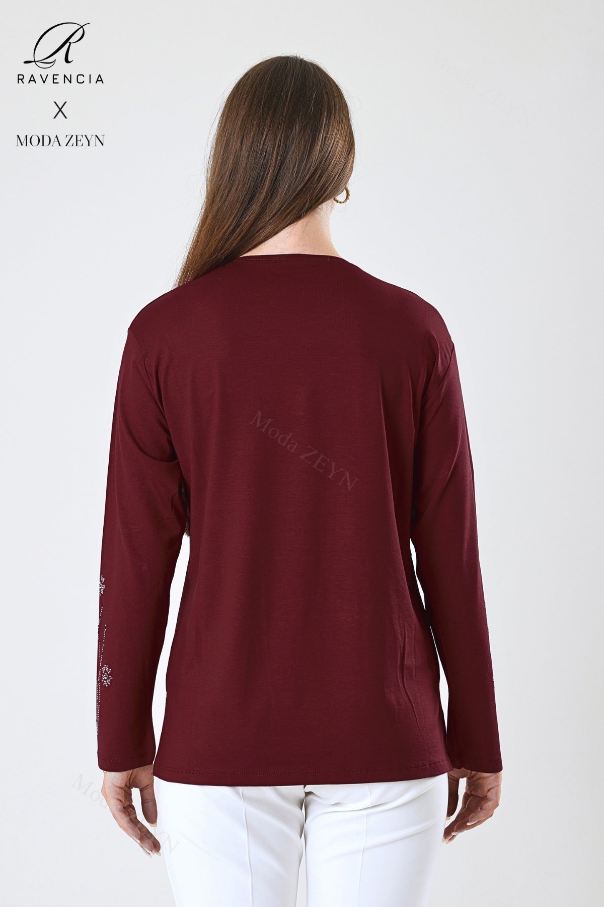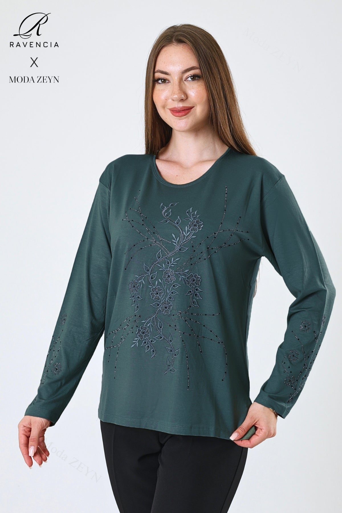 Gardırobunuzun en değerli parçası olmaya aday bu özel tasarım bluz, yüksek kaliteli viskon penye kumaşı ve göz alıcı taş işlemeleriyle şıklığı zahmetsizce yakalamanızı sağlar.