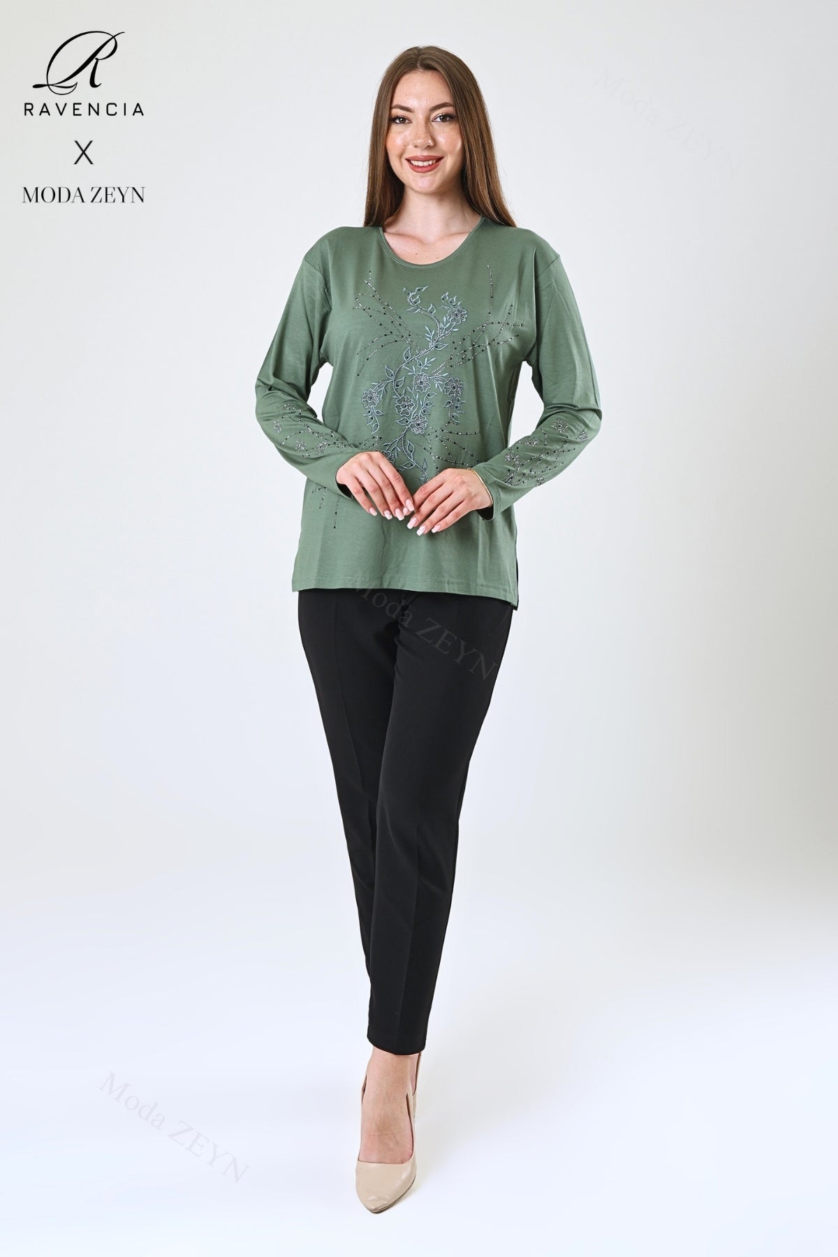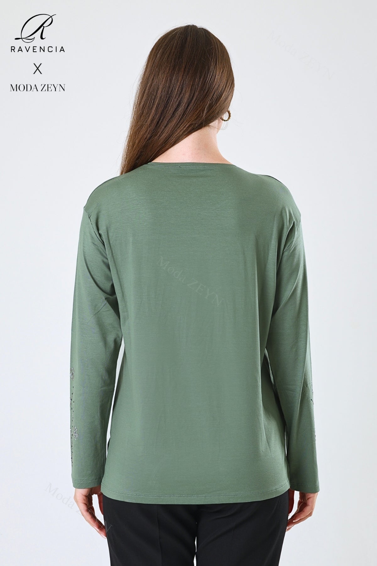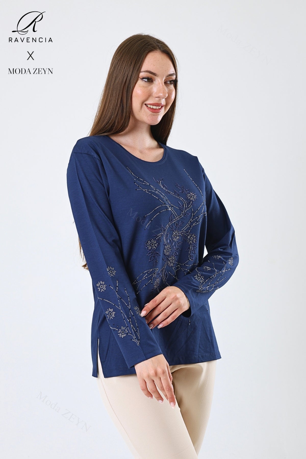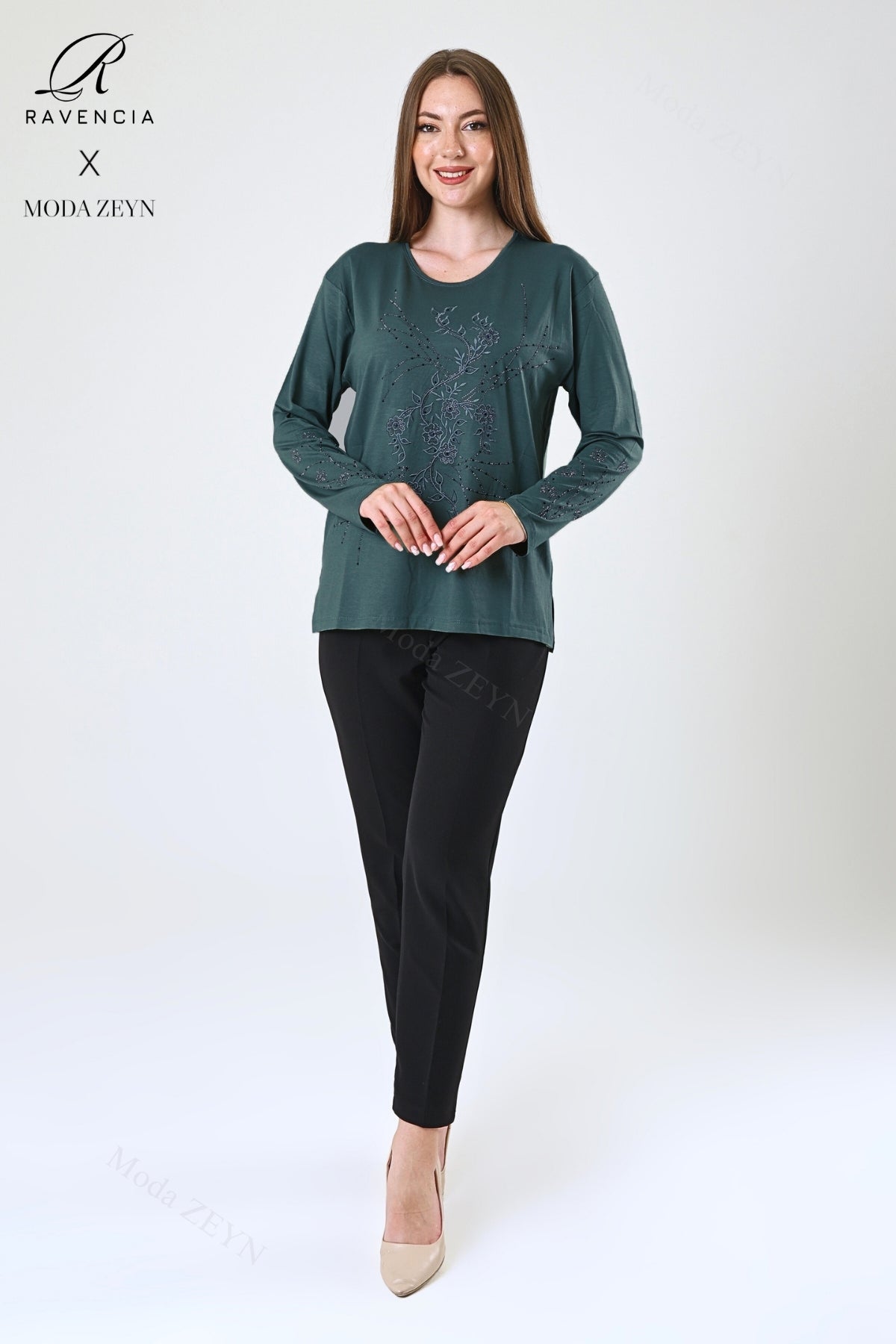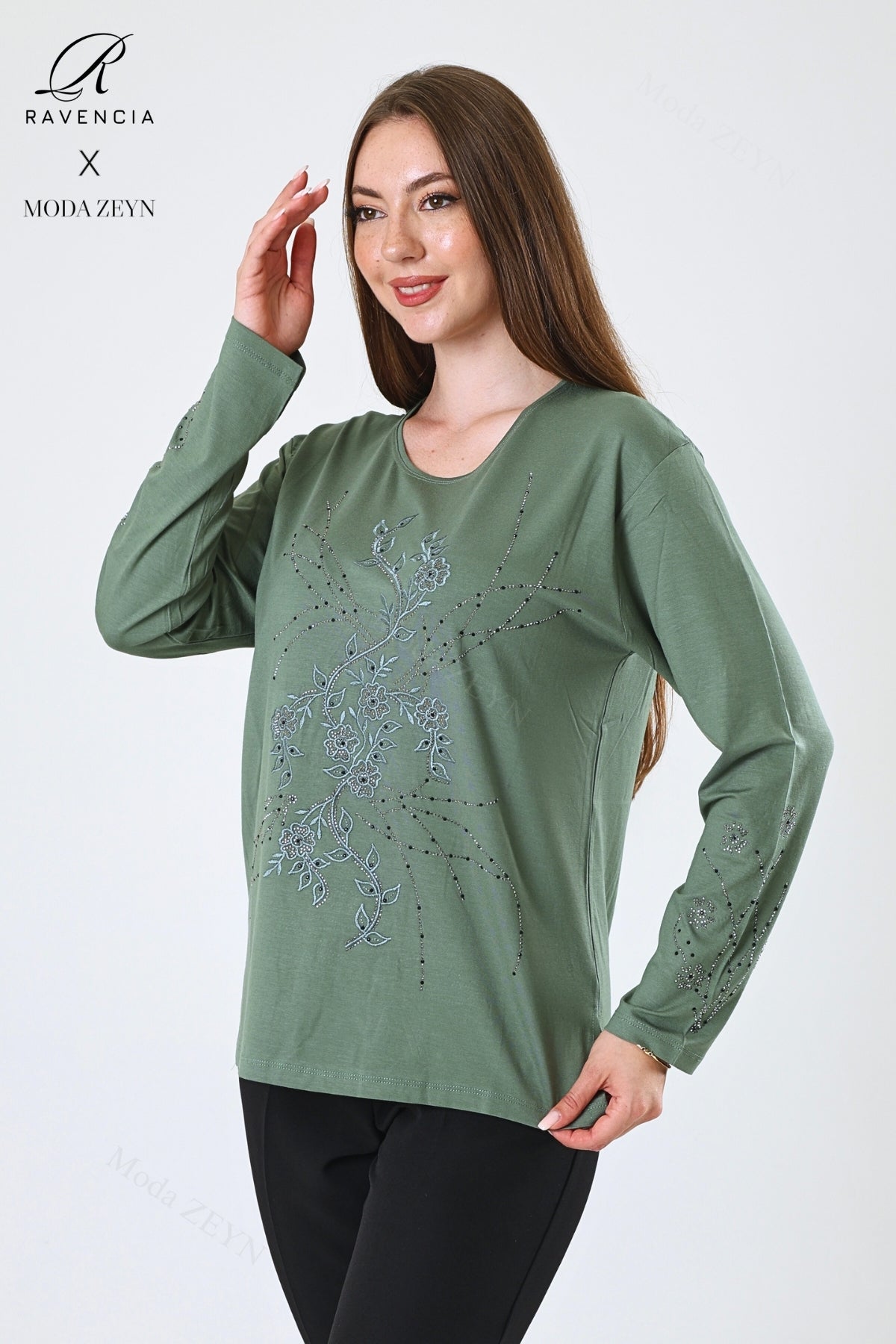 Gardırobunuzun en değerli parçası olmaya aday bu özel tasarım bluz, yüksek kaliteli viskon penye kumaşı ve göz alıcı taş işlemeleriyle şıklığı zahmetsizce yakalamanızı sağlar.