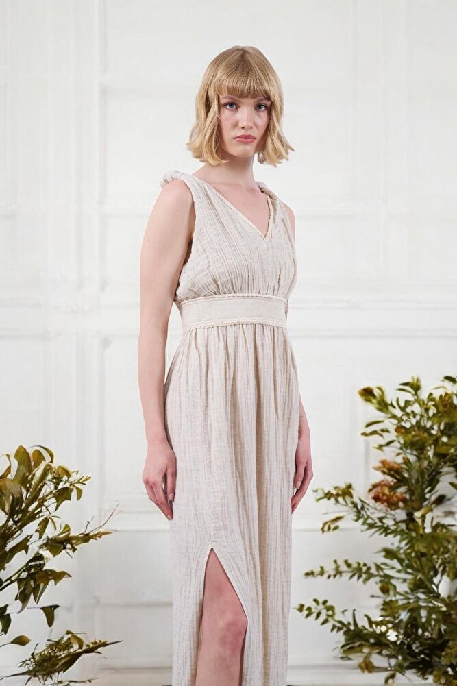 Kadın Yırtmaçlı Keten Taş Rengi Elbise